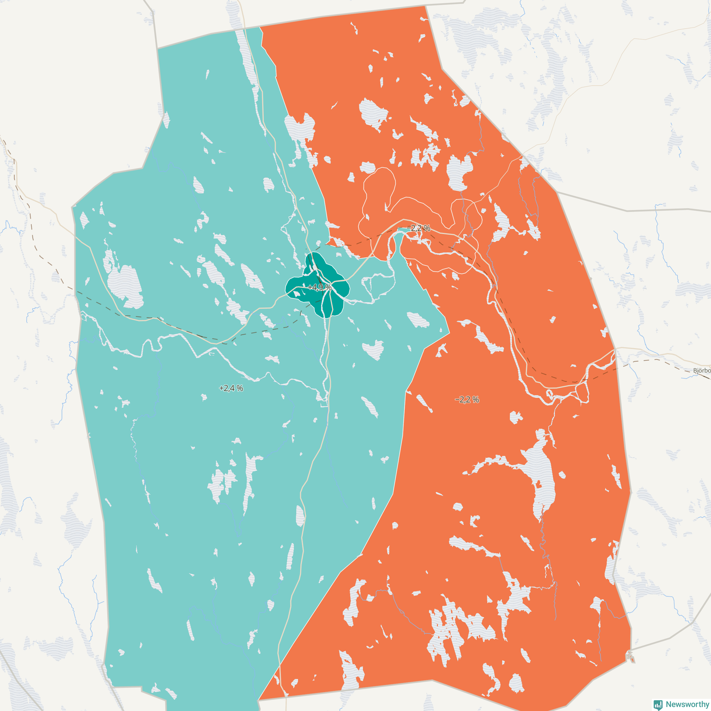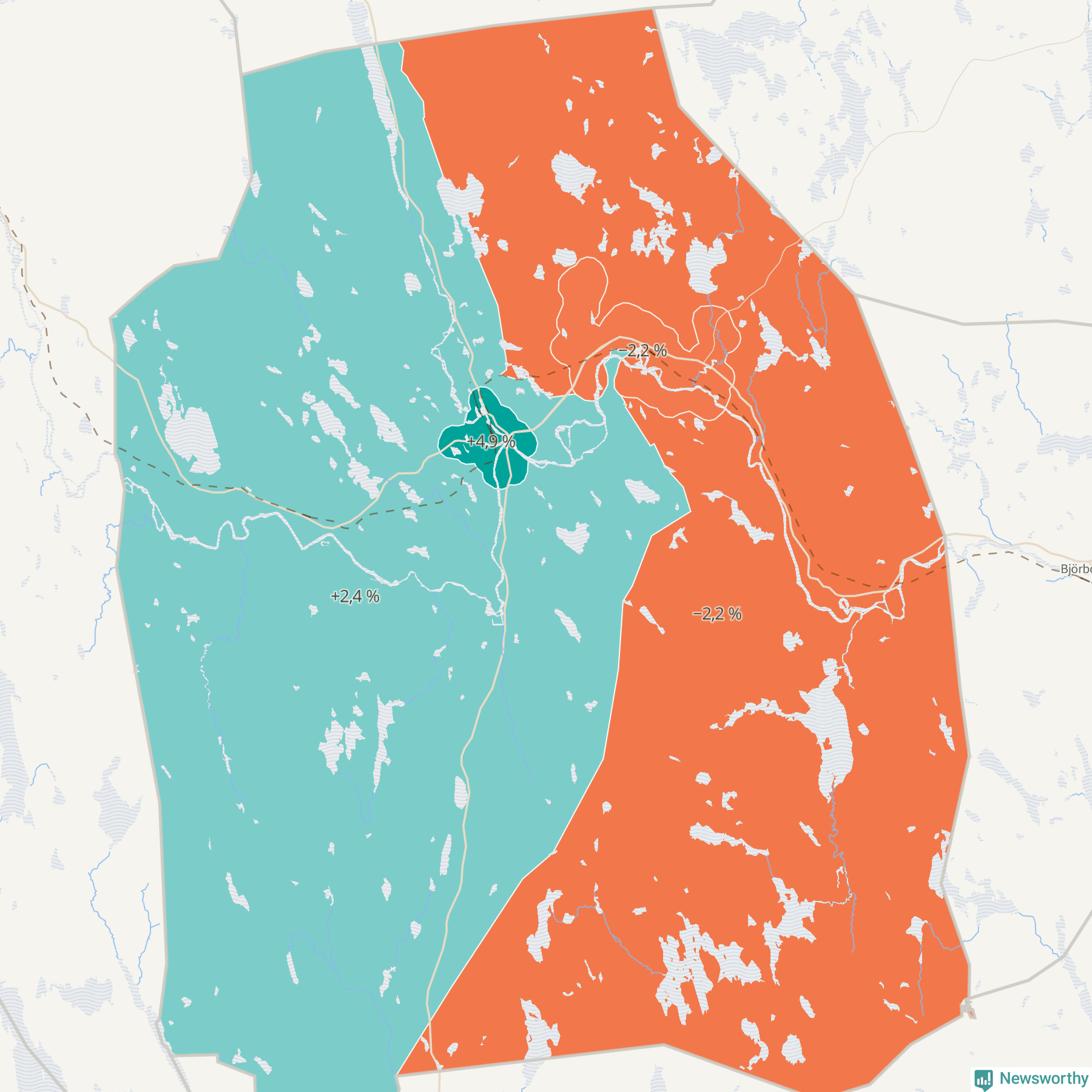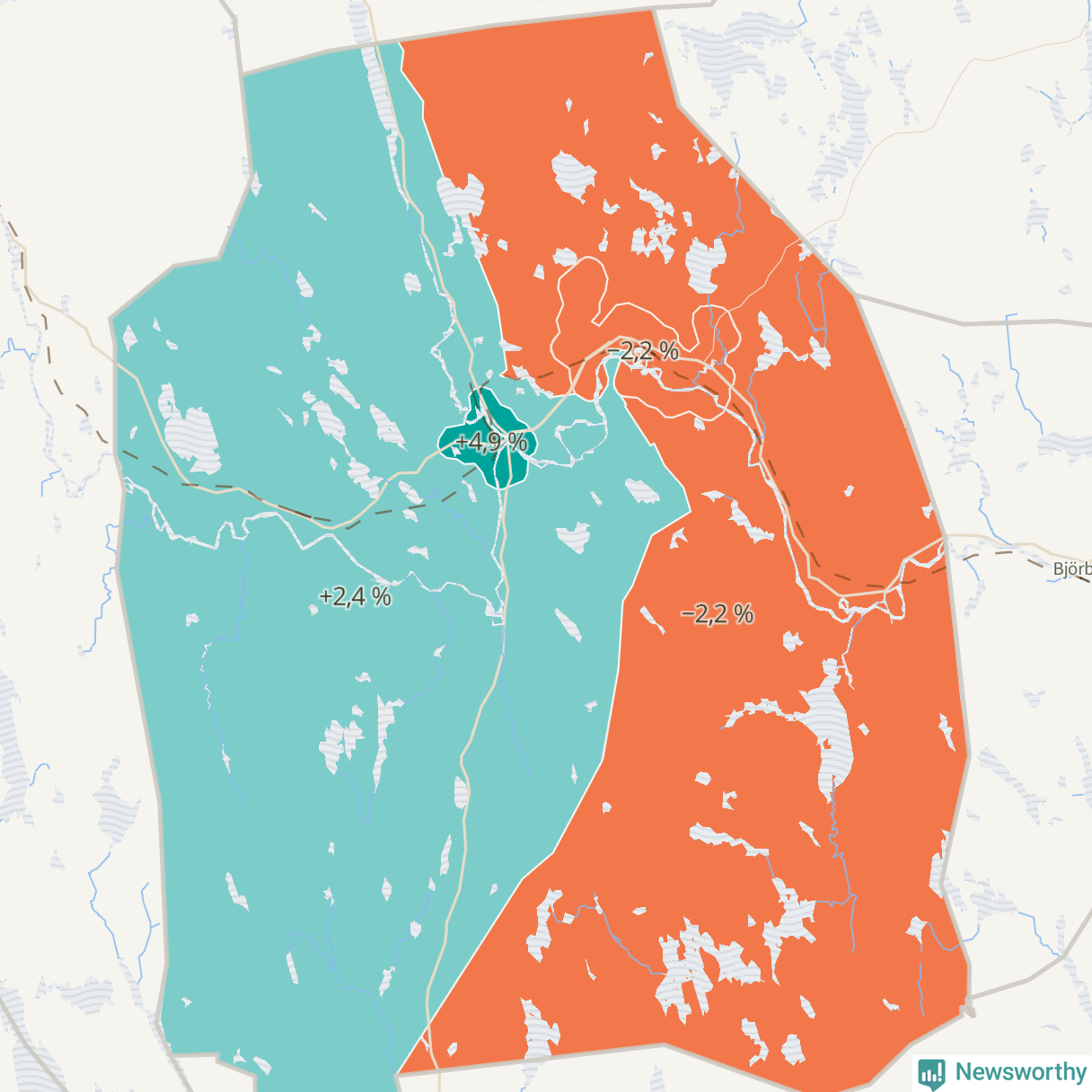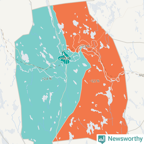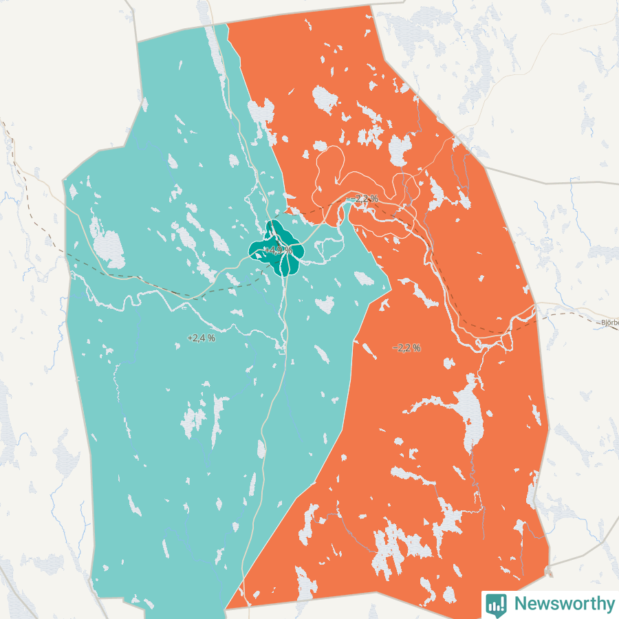 Men det växer inte överallt i kommunen. Det visar sig när när Newsworthy samlar SCB:s befolkningsdata från tio år för att se hur kommunen utvecklats. Medan områdena Vansbro och Vansbro västra landsbygd ökat sin befolkning, minskar den i Vansbro östra landsbygd och Dala-Järna.Medan området Vansbro har ökat från 2 153 till 2 259 personer