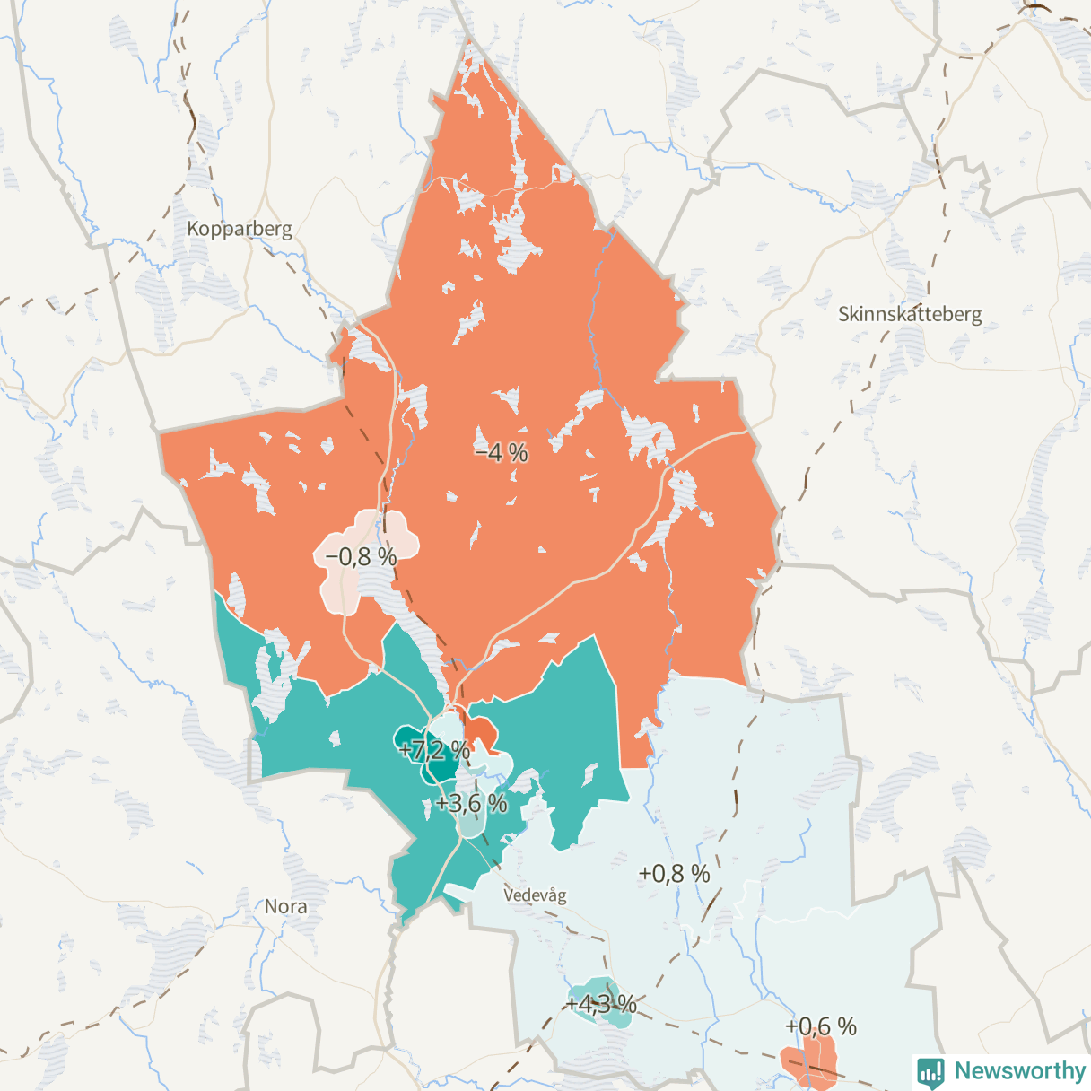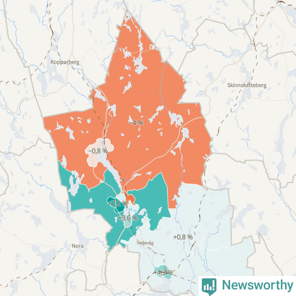Men det växer inte överallt i kommunen. Det visar sig när när Newsworthy samlar SCB:s befolkningsdata från tio år för att se hur kommunen utvecklats. Medan området Lindesberg västra har ökat invånarantalet med 207 personer – 10 procent – har Lindesberg nordöstra minskat sin befolkning med 97 invånare.