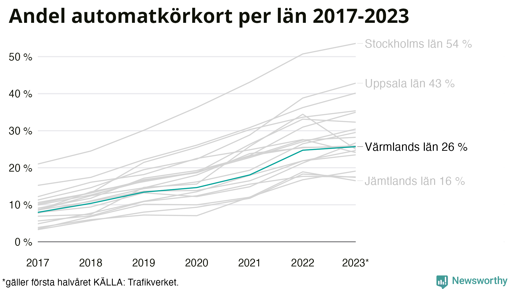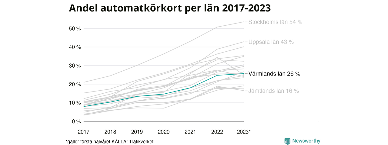 Andel av körkortstagarna som kört upp för automatväxlad bil i Värmland 2017- juni 2023