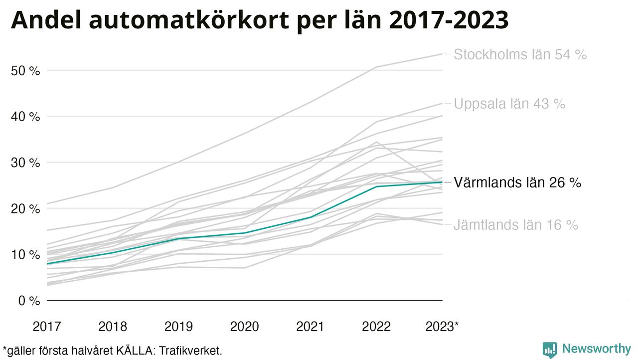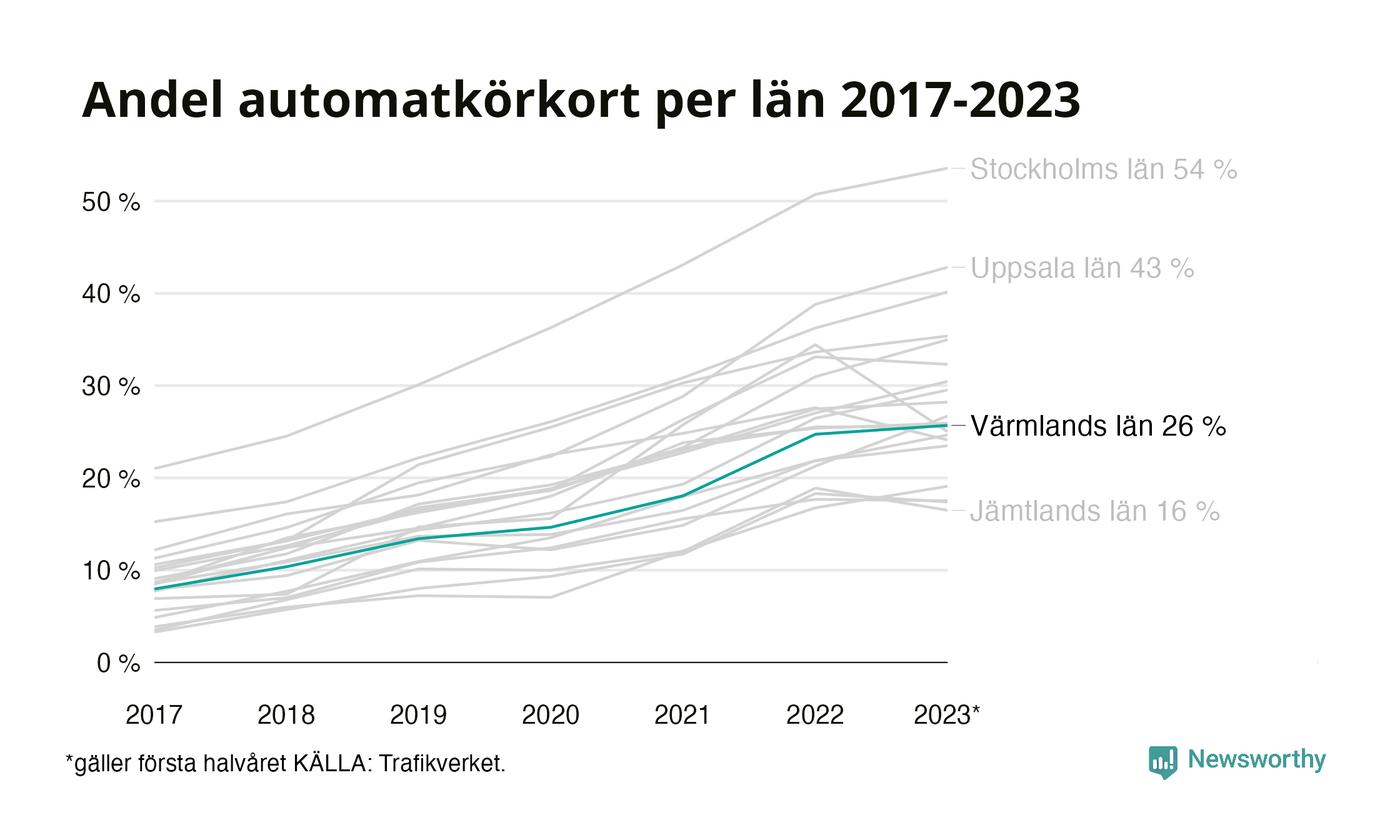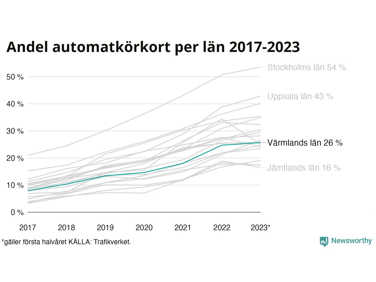 Samma utveckling ses Värmlands län, om än något långsammare än i riket som helhet. Här har andelen automatkörkort ökat från 8 procent 2017 till 26 procent hittills i år. Störst är andelen bland dem som kör upp i Säffle där 234 av de 619 som kört upp för B-körkort hittills i år begränsade sig till automatväxlad bil. Det motsvarar 38 procent. I Filipstad har bara 5 procent – två av de 38 som kört upp under det första halvåret – satsat på automat.