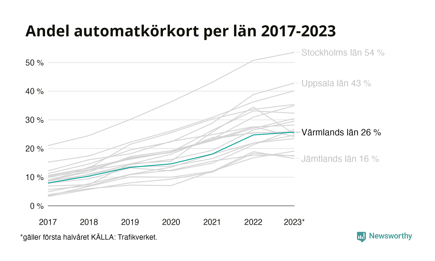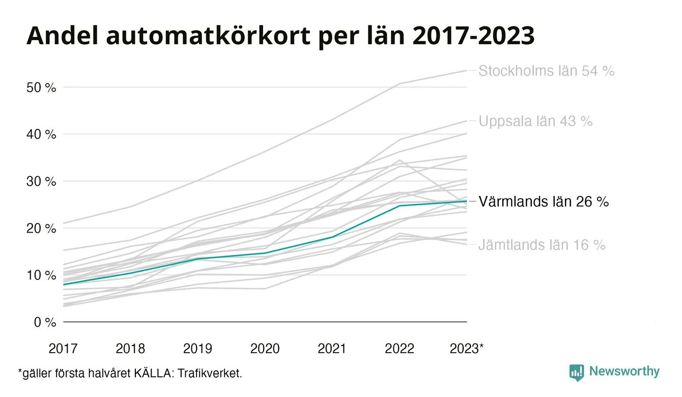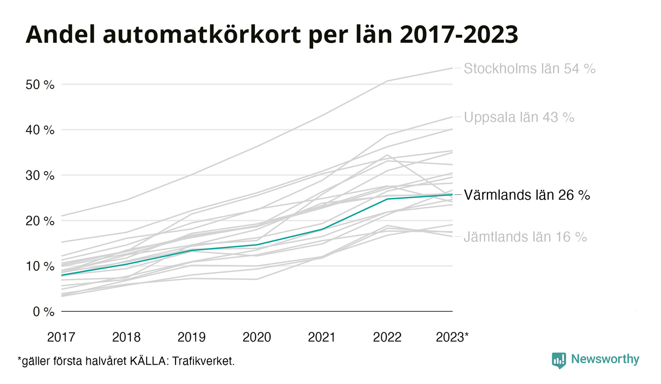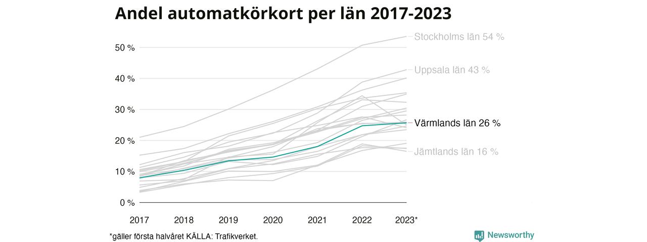 Samma utveckling ses Värmlands län, om än något långsammare än i riket som helhet. Här har andelen automatkörkort ökat från 8 procent 2017 till 26 procent hittills i år. Störst är andelen bland dem som kör upp i Säffle där 234 av de 619 som kört upp för B-körkort hittills i år begränsade sig till automatväxlad bil. Det motsvarar 38 procent. I Filipstad har bara 5 procent – två av de 38 som kört upp under det första halvåret – satsat på automat.