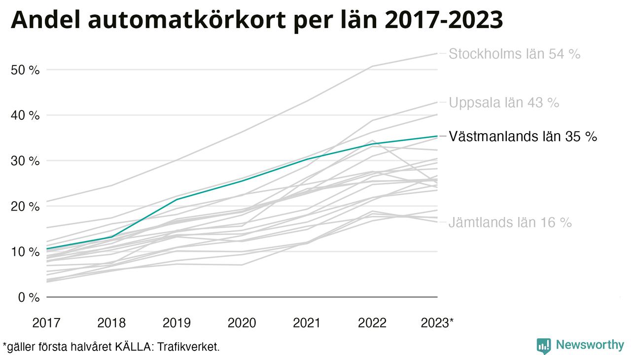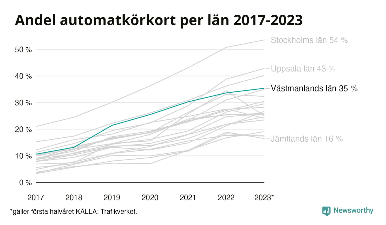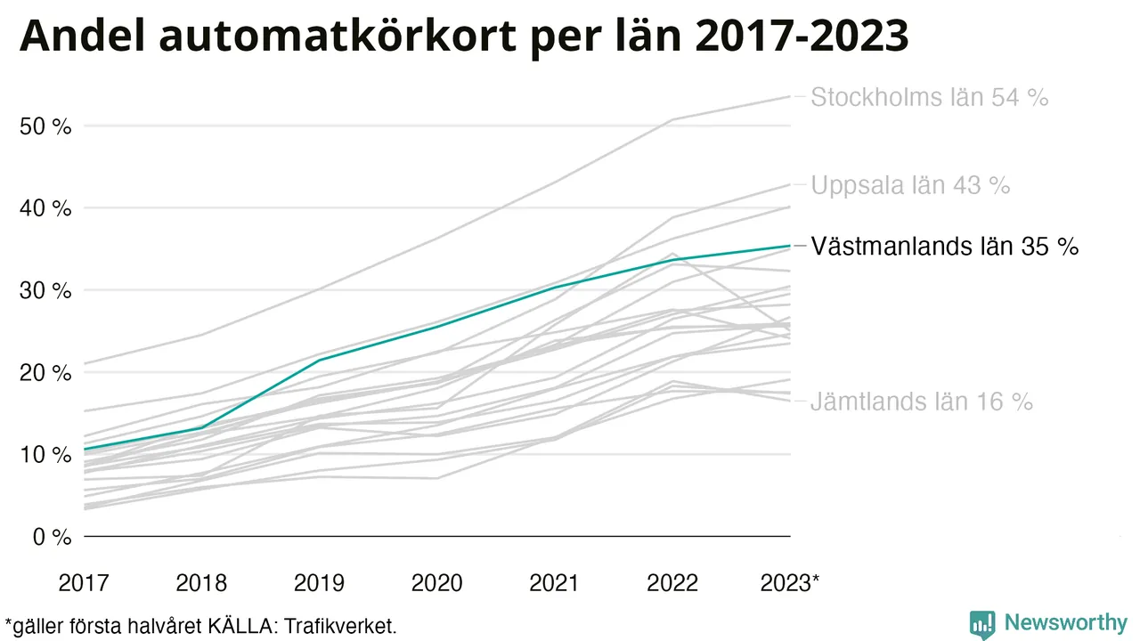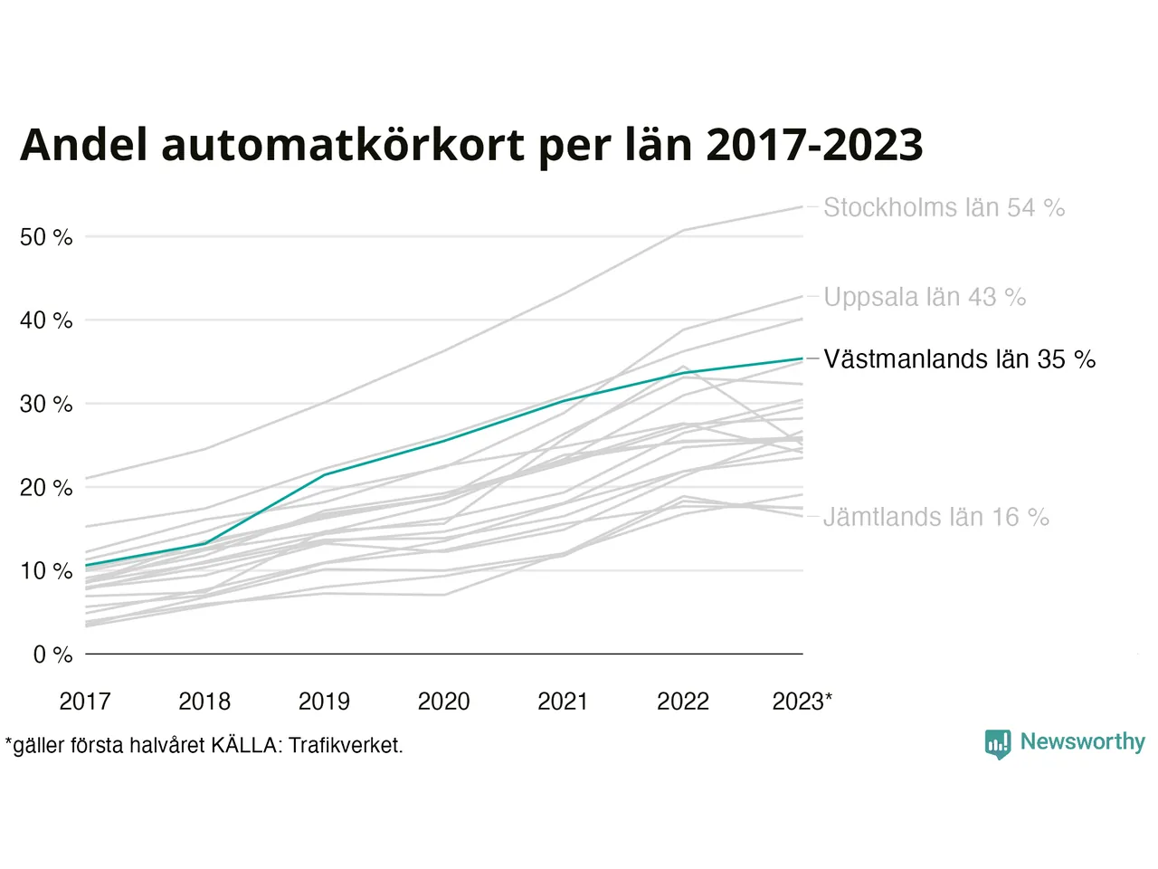 Samma utveckling ses Västmanlands län, och här går utvecklingen snabbare än i riket som helhet. Här har andelen automatkörkort ökat från 11 procent 2017 till 35 procent hittills i år. Störst är andelen bland dem som kör upp i Västerås där 771 av de 1 907 som kört upp för B-körkort hittills i år begränsade sig till automatväxlad bil. Det motsvarar 40 procent. Det kan jämföras med 25 procent – 110 av 441 – i Sala där andelen är lägst i Västmanland.