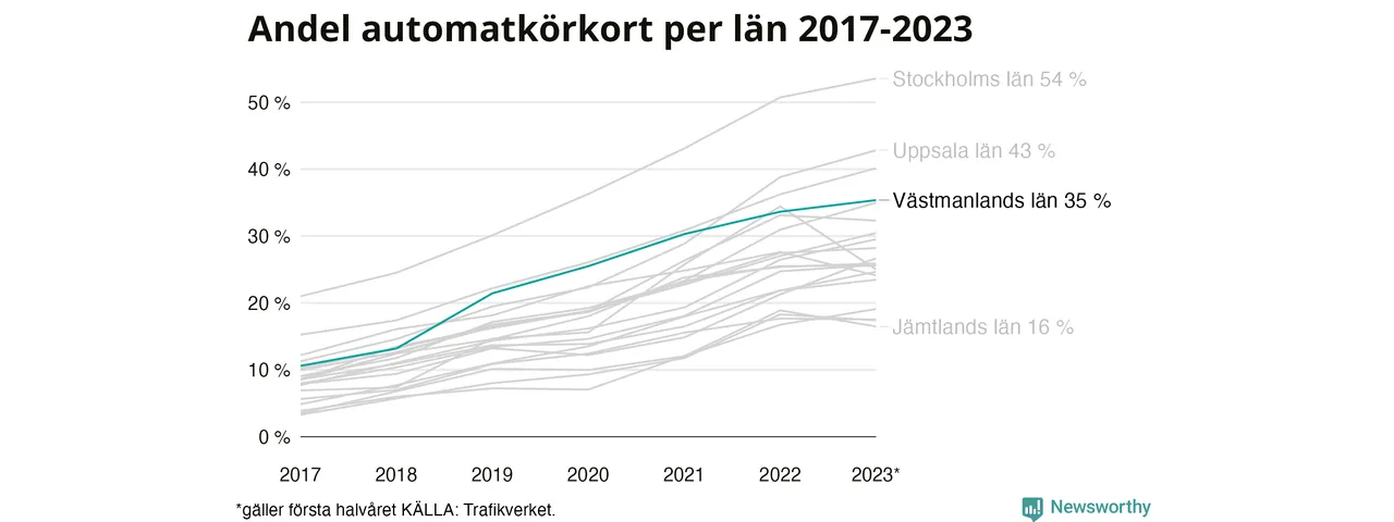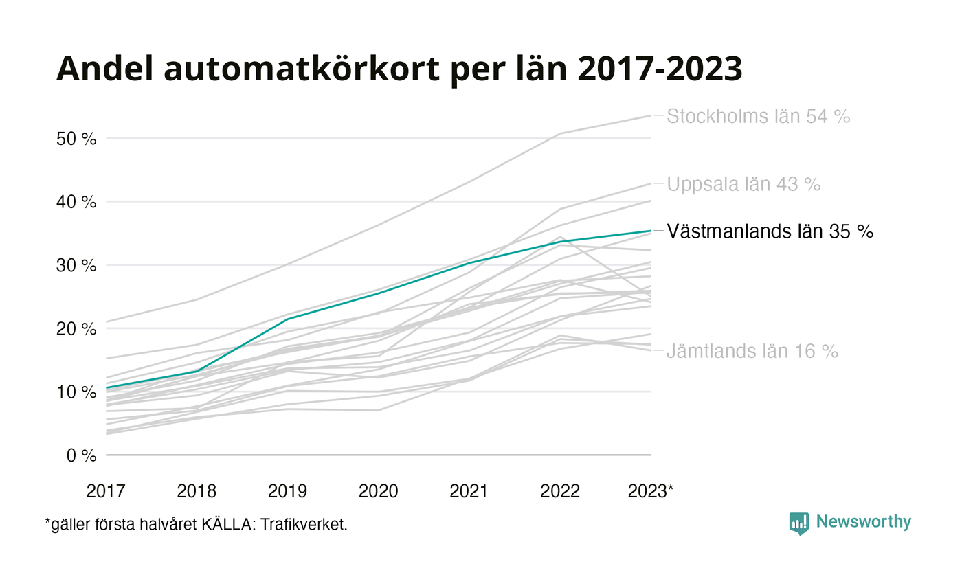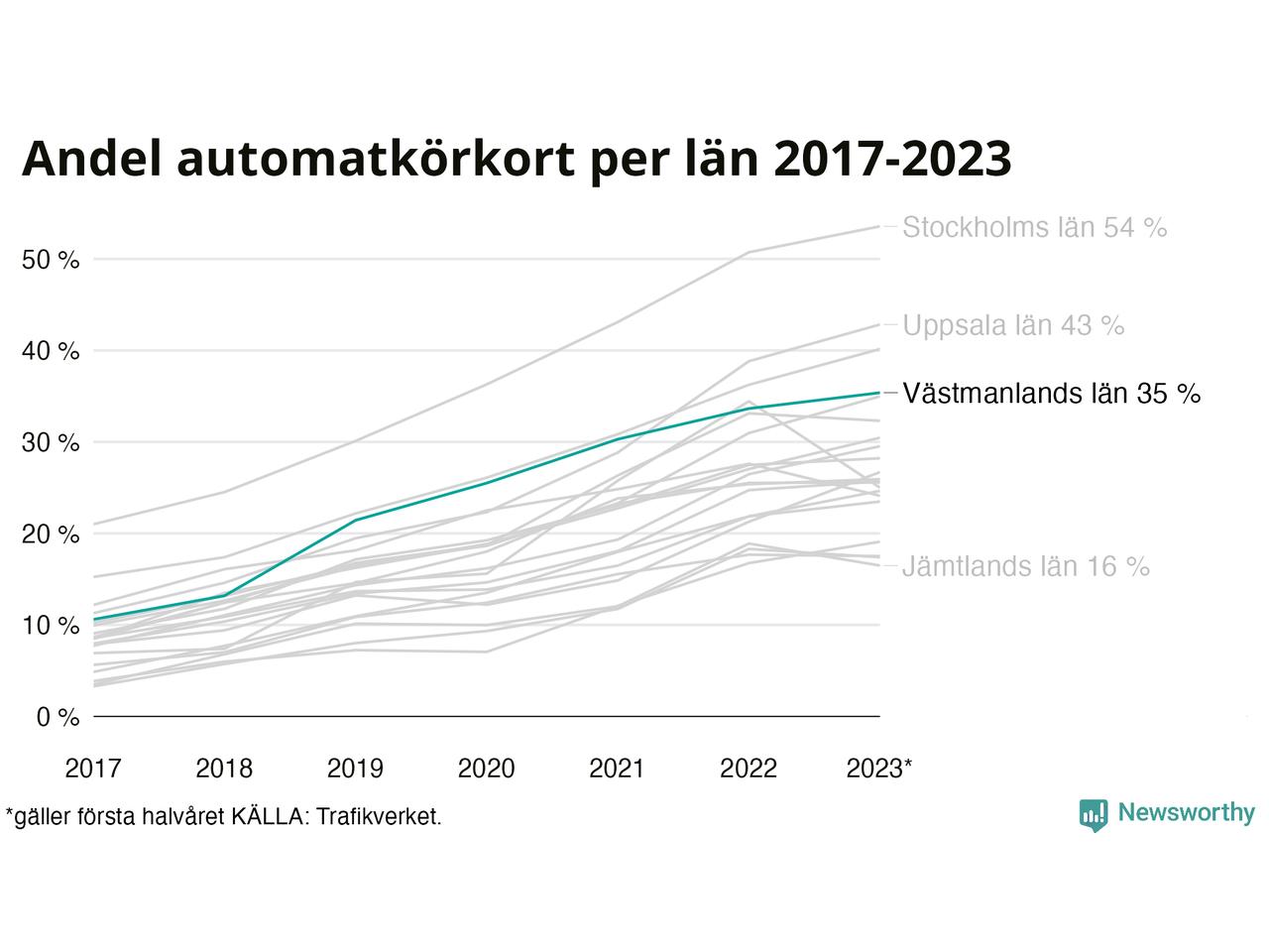 Utvecklingen går åt samma håll över hela landet – men det har gått fortast i storstäderna. I Stockholms län gällde mer än varannan godkänd uppkörning automat-körkort. På de flesta håll är det dock fortfarande vanligast att köra upp för körkort utan begränsningar. I Norrbotten, Västernorrland, Västerbotten och Jämtland är det hittills i år färre än 20 procent.