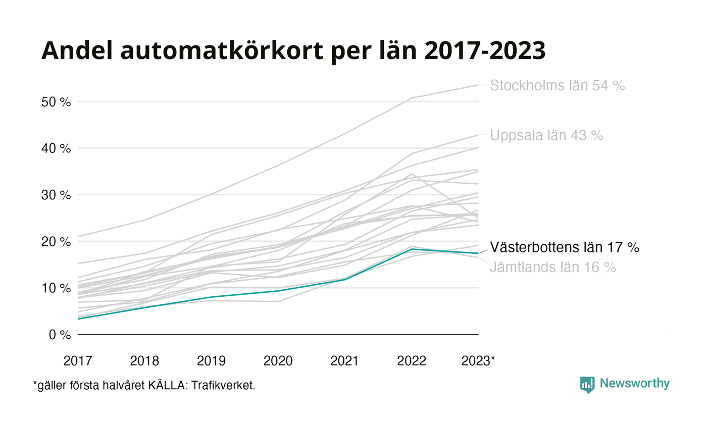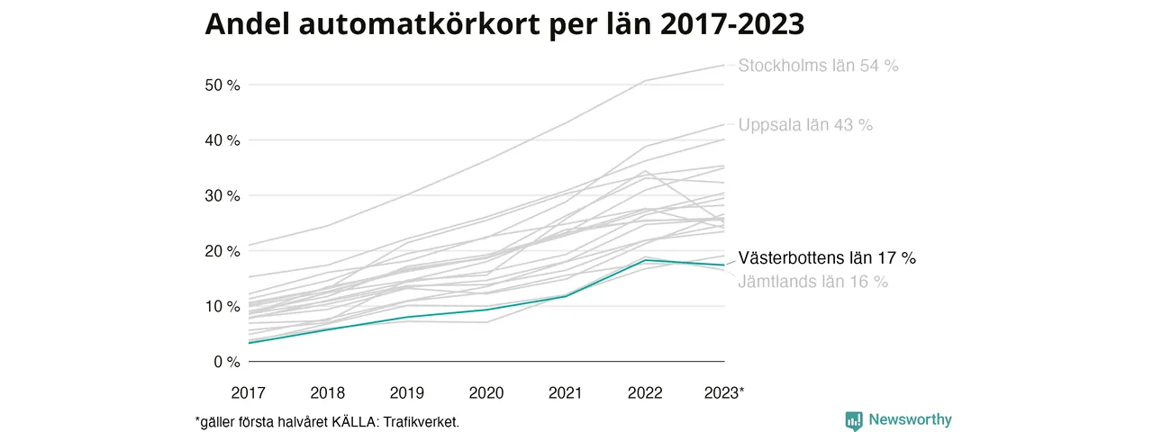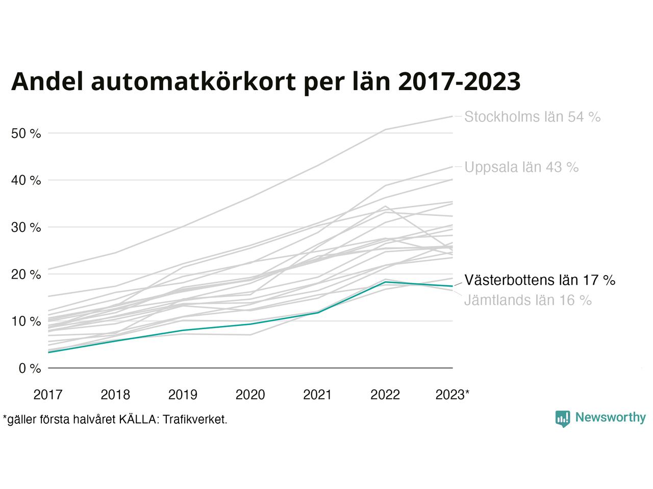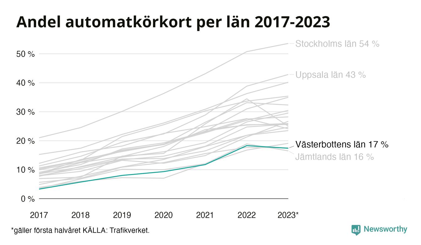Samma utveckling ses Västerbottens län, om än något långsammare än i riket som helhet. Här har andelen automatkörkort ökat från 3 procent 2017 till 17 procent hittills i år även om andelen det första halvåret 2023 hittills varit något lägre än helåret 2022. Störst är andelen bland dem som kör upp i Umeå där 150 av de 769 som kört upp för B-körkort hittills i år begränsade sig till automatväxlad bil. Det motsvarar 20 procent. I Vindeln har ingen av de 20 som kört upp under det första halvåret satsat på automat.