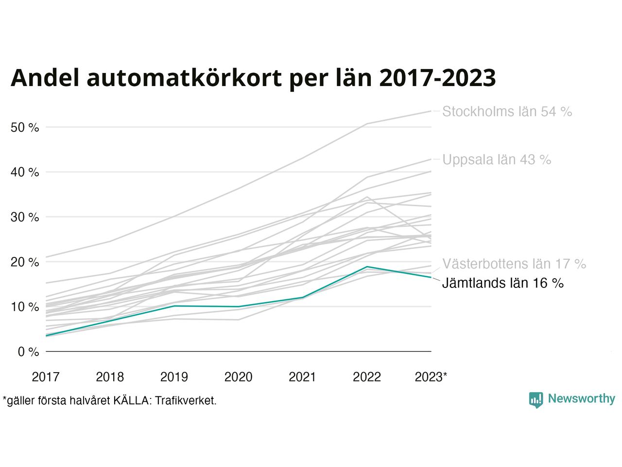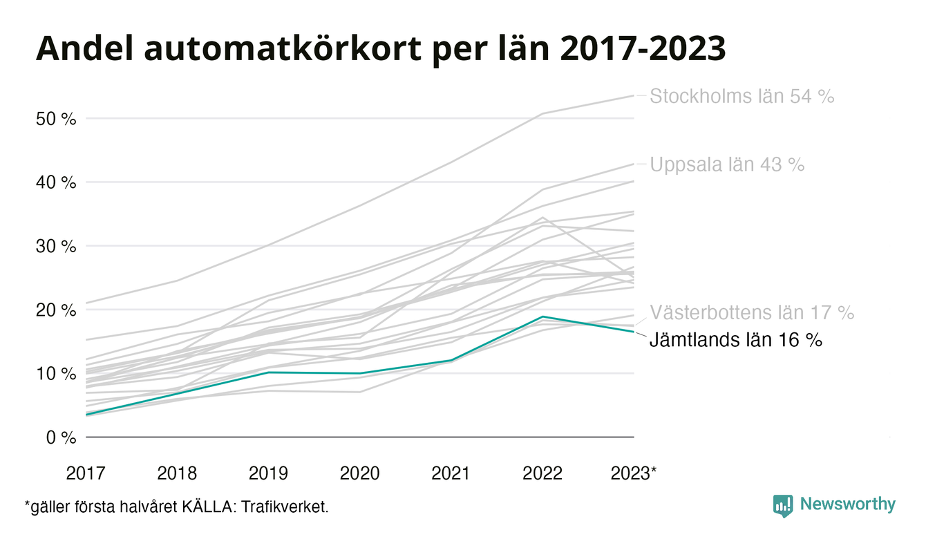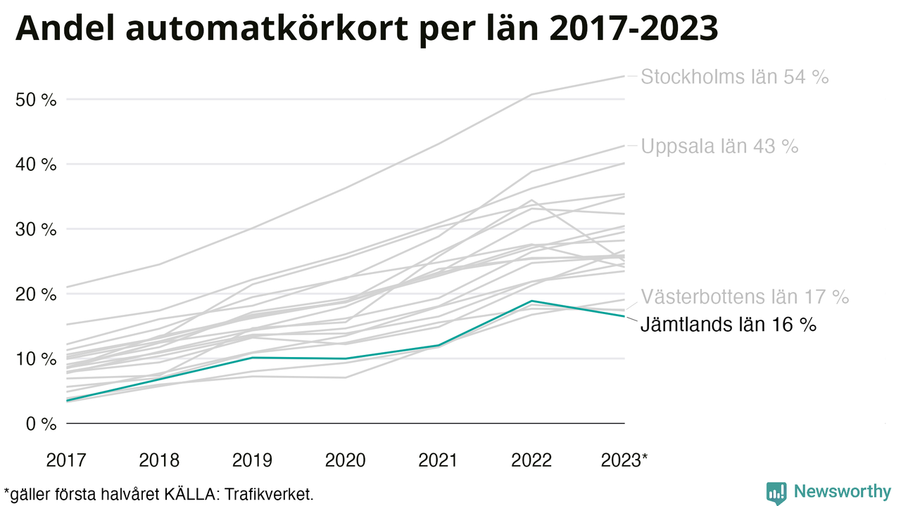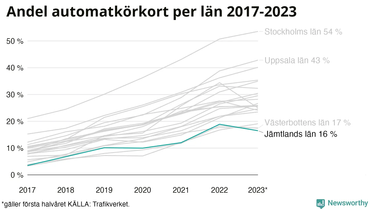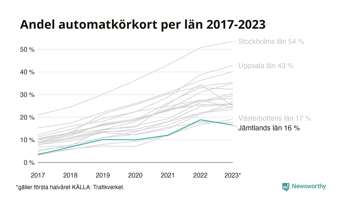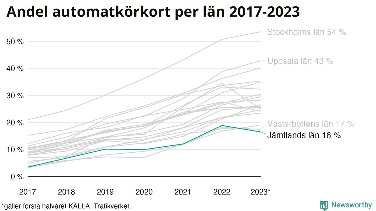 Samma utveckling ses Jämtlands län, om än något långsammare än i riket som helhet. Här har andelen automatkörkort ökat från 3 procent 2017 till 16 procent hittills i år även om andelen det första halvåret 2023 hittills varit något lägre än helåret 2022. Störst är andelen bland dem som kör upp i Hammarstrand där 15 av de 42 som kört upp för B-körkort hittills i år begränsade sig till automatväxlad bil. Det motsvarar 36 procent. I Strömsund har bara 7 procent – två av de 30 som kört upp under det första halvåret – satsat på automat.