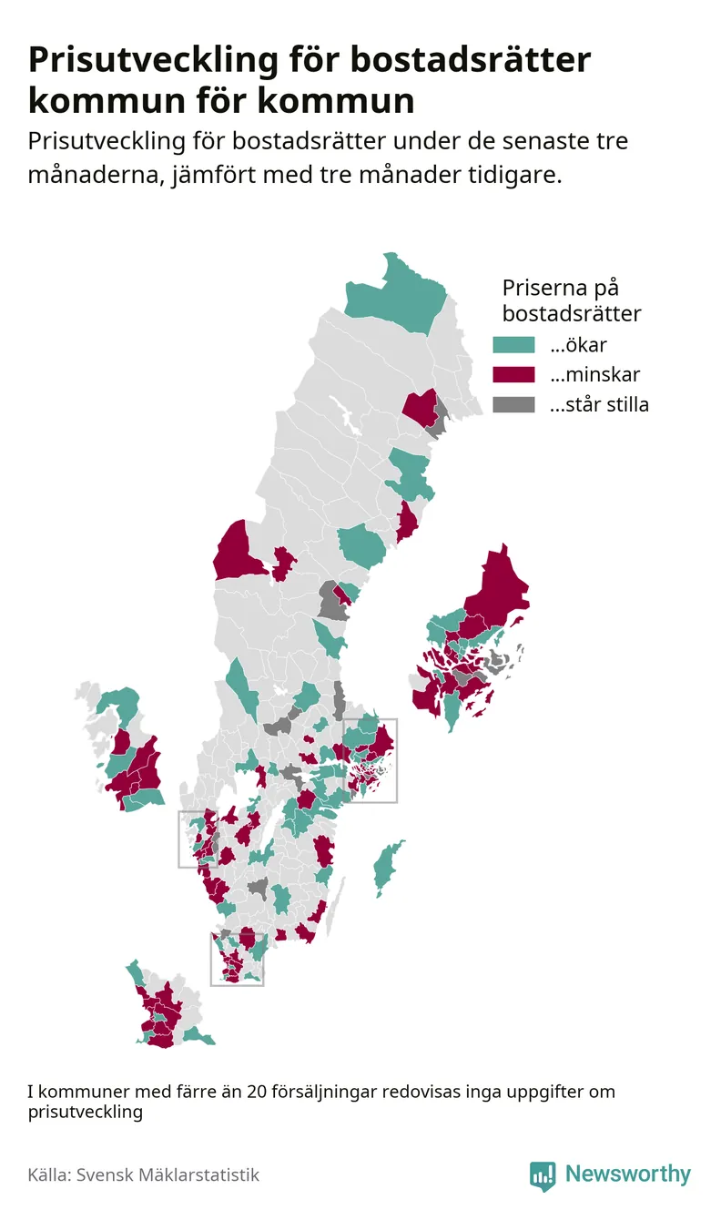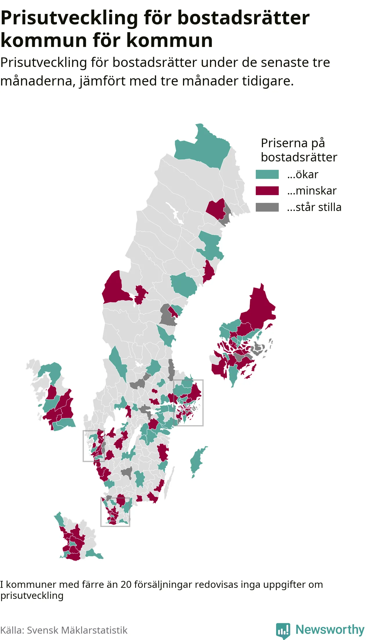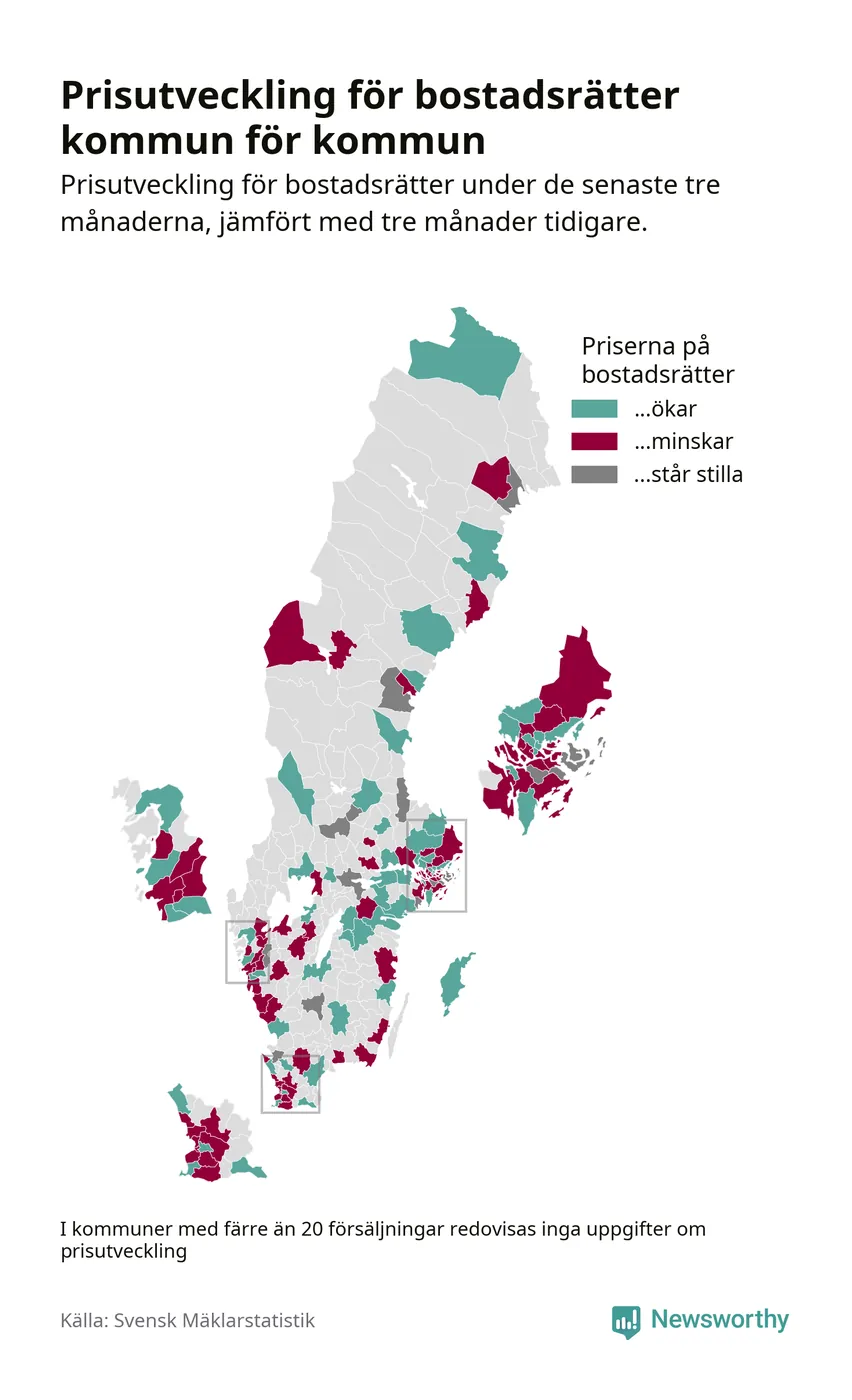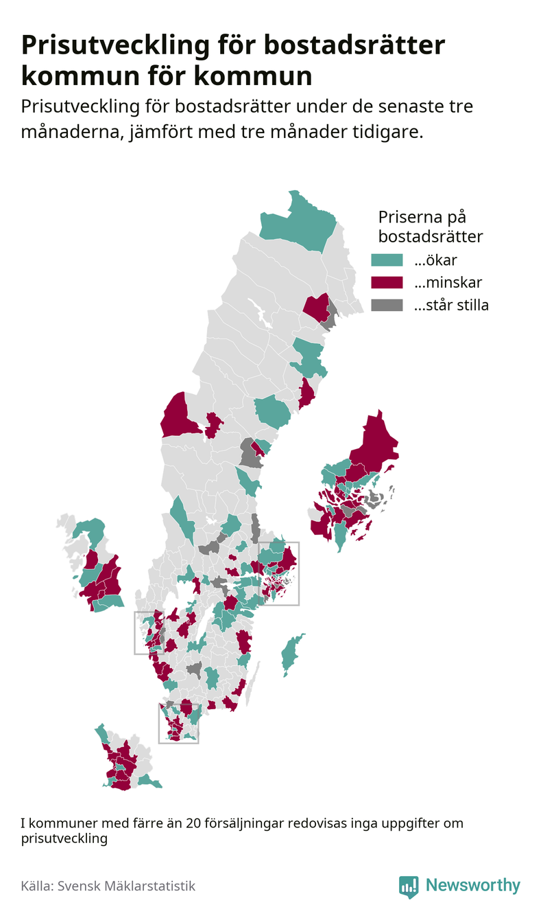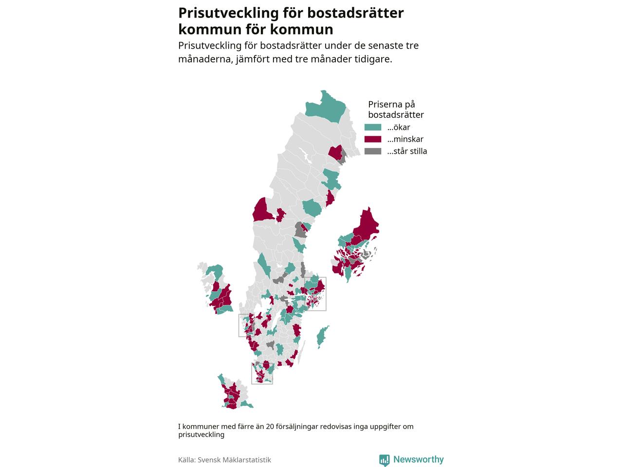 Priserna på bostadsrätter sjunker i 53 av landets kommuner, medan de stiger i 49 (i merparten av de resterande kommunerna redovisas inga prisförändringsuppgifter på grund av få försäljningar). Kartan intill visar den geografiska spridningen.