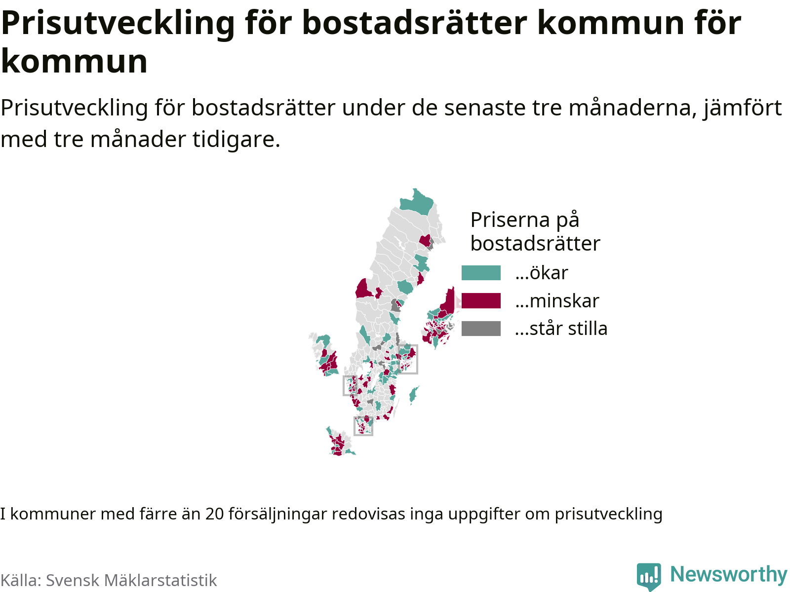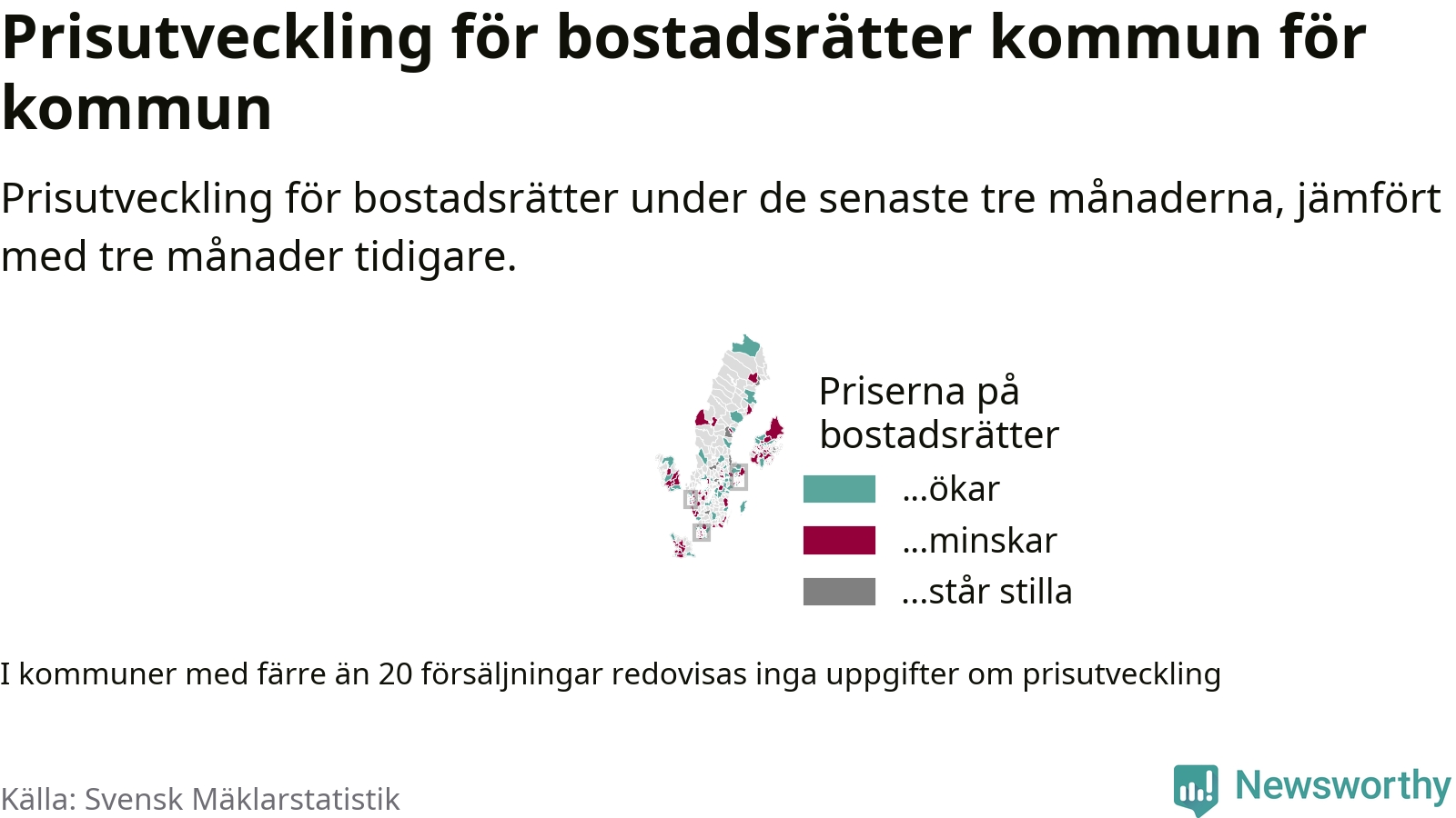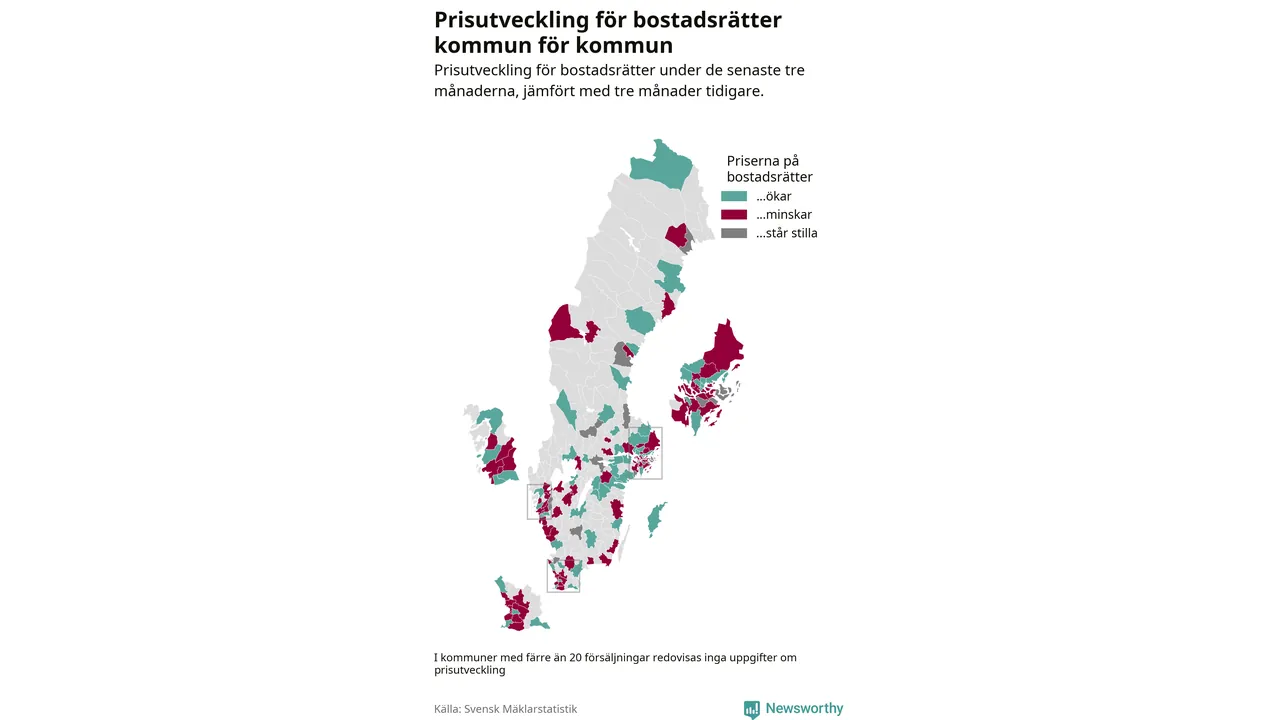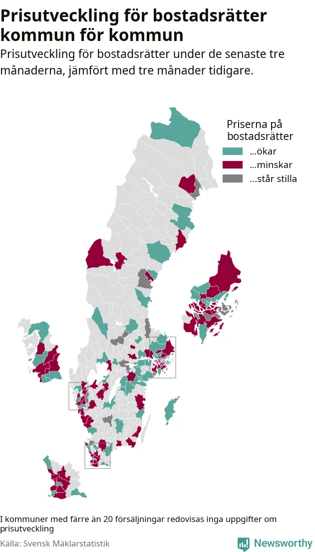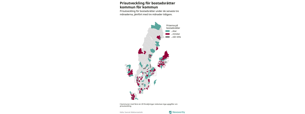 Priserna på bostadsrätter sjunker i 53 av landets kommuner, medan de stiger i 49 (i merparten av de resterande kommunerna redovisas inga prisförändringsuppgifter på grund av få försäljningar). Kartan intill visar den geografiska spridningen.