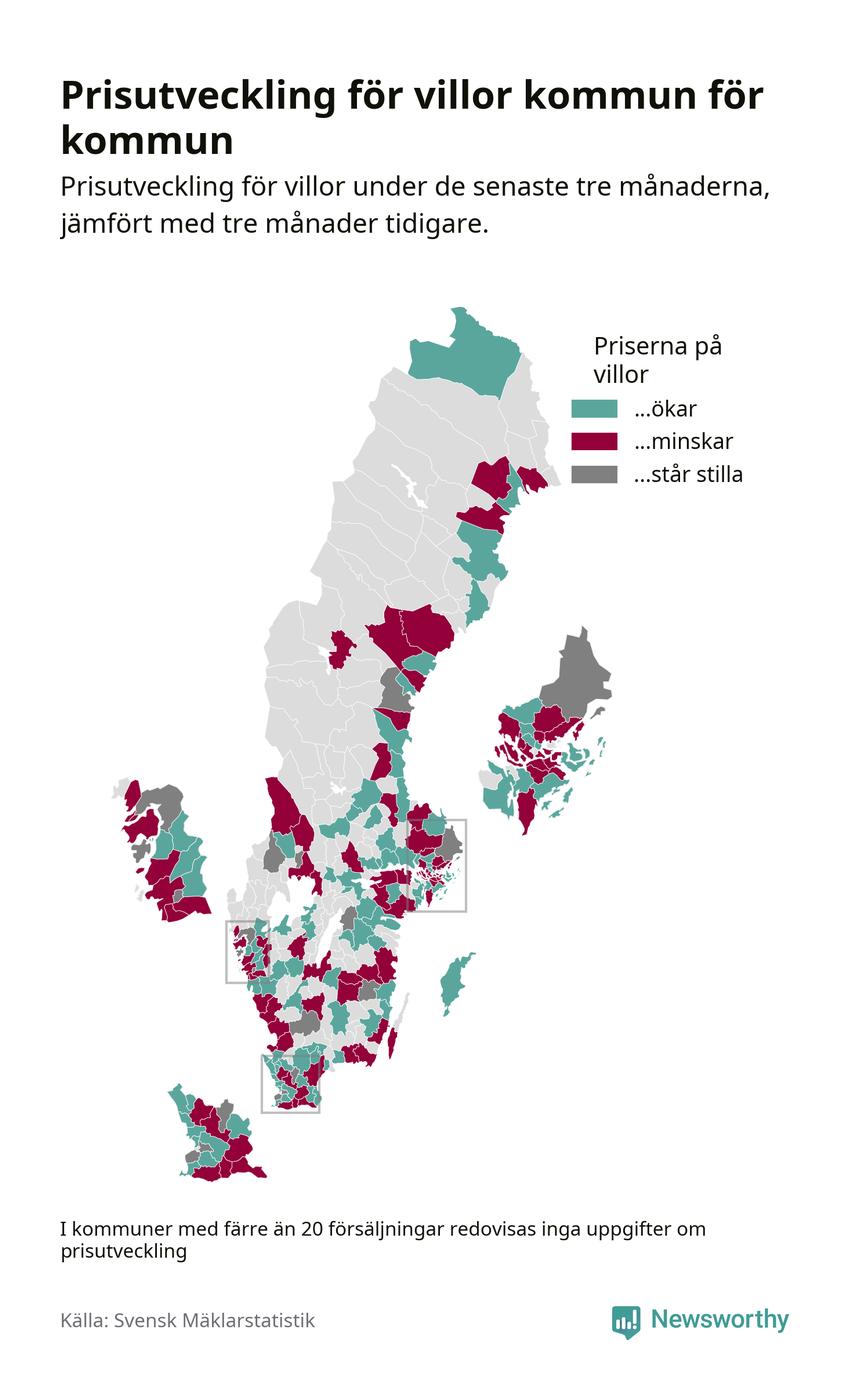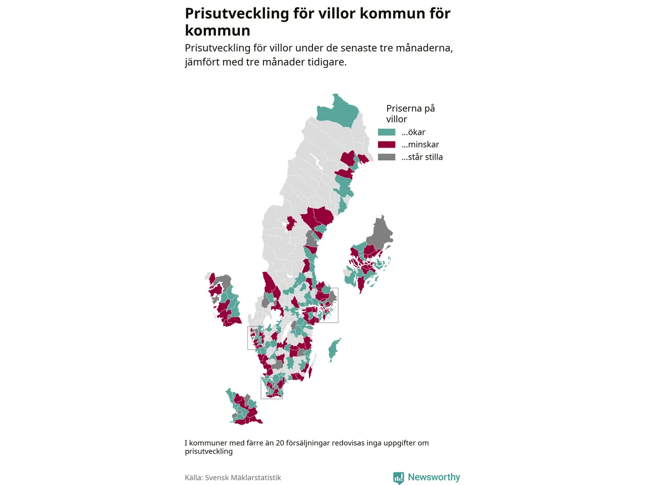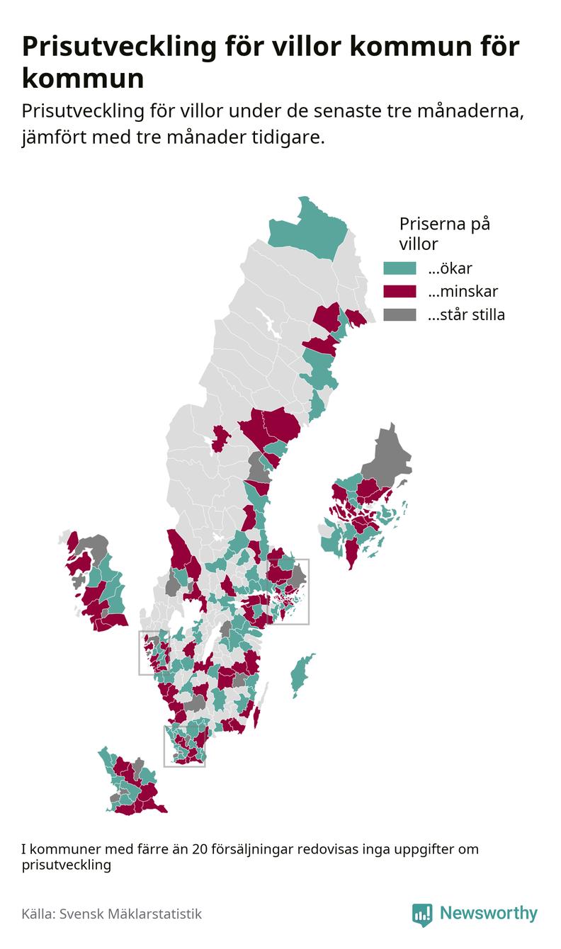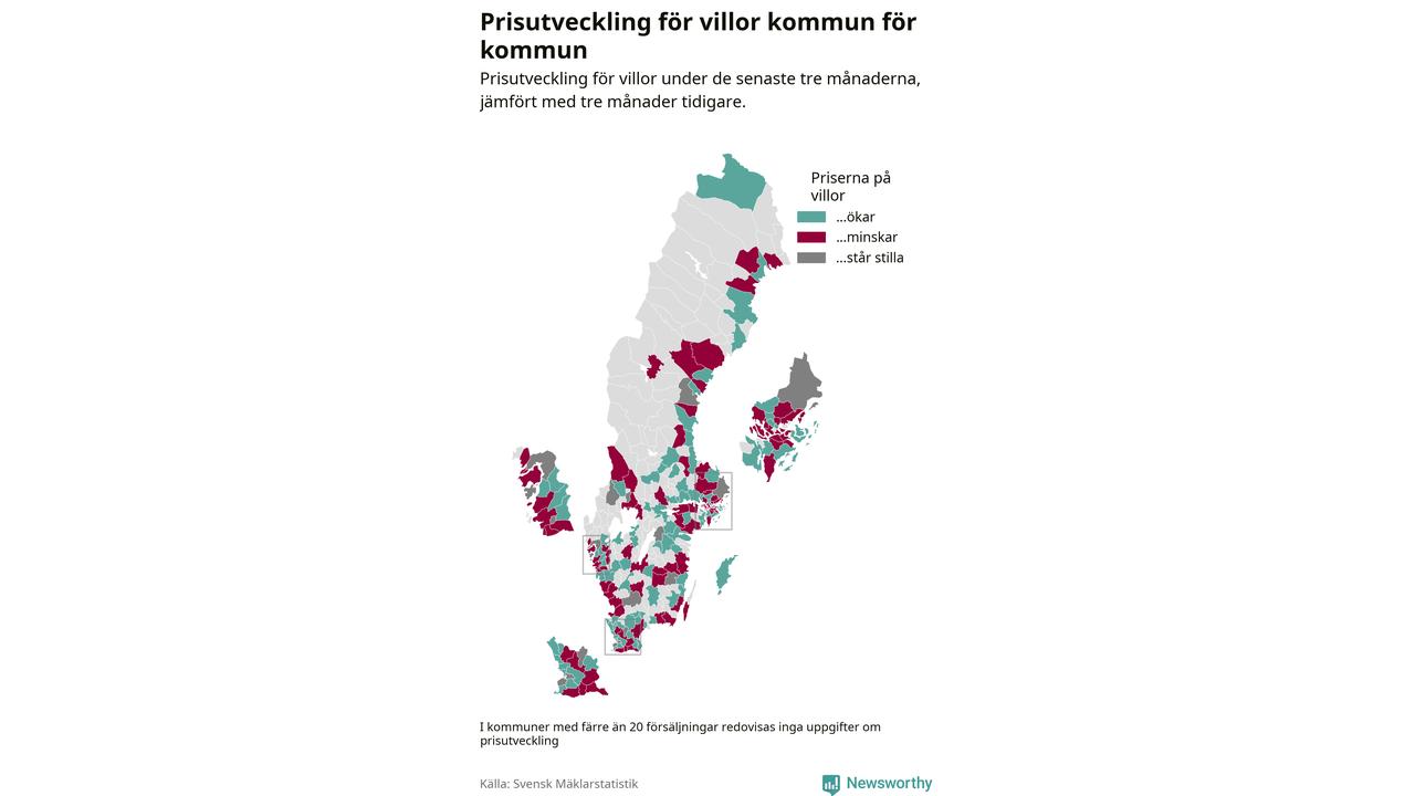 Priserna på villor stiger i 78 av landets kommuner, medan de sjunker i 66 (i merparten av de resterande kommunerna redovisas inga prisförändringsuppgifter på grund av få försäljningar). Kartan intill visar den geografiska spridningen.