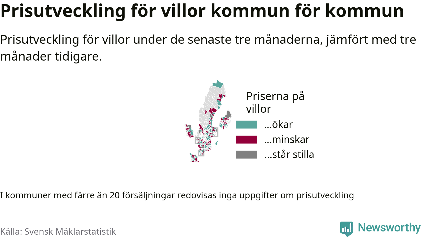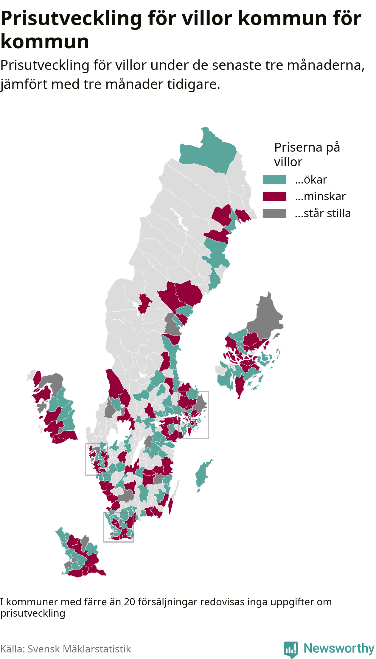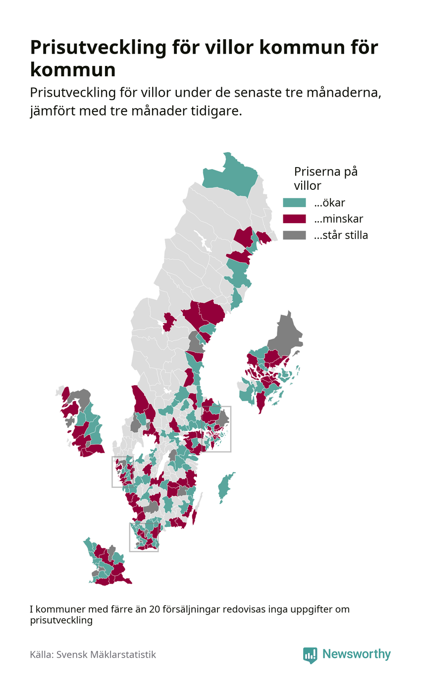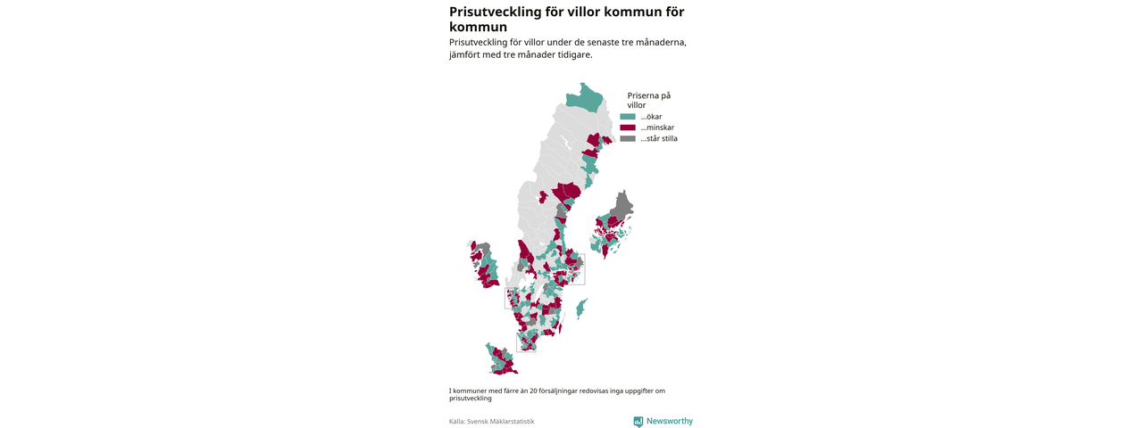 Priserna på villor stiger i 78 av landets kommuner, medan de sjunker i 66 (i merparten av de resterande kommunerna redovisas inga prisförändringsuppgifter på grund av få försäljningar). Kartan intill visar den geografiska spridningen.