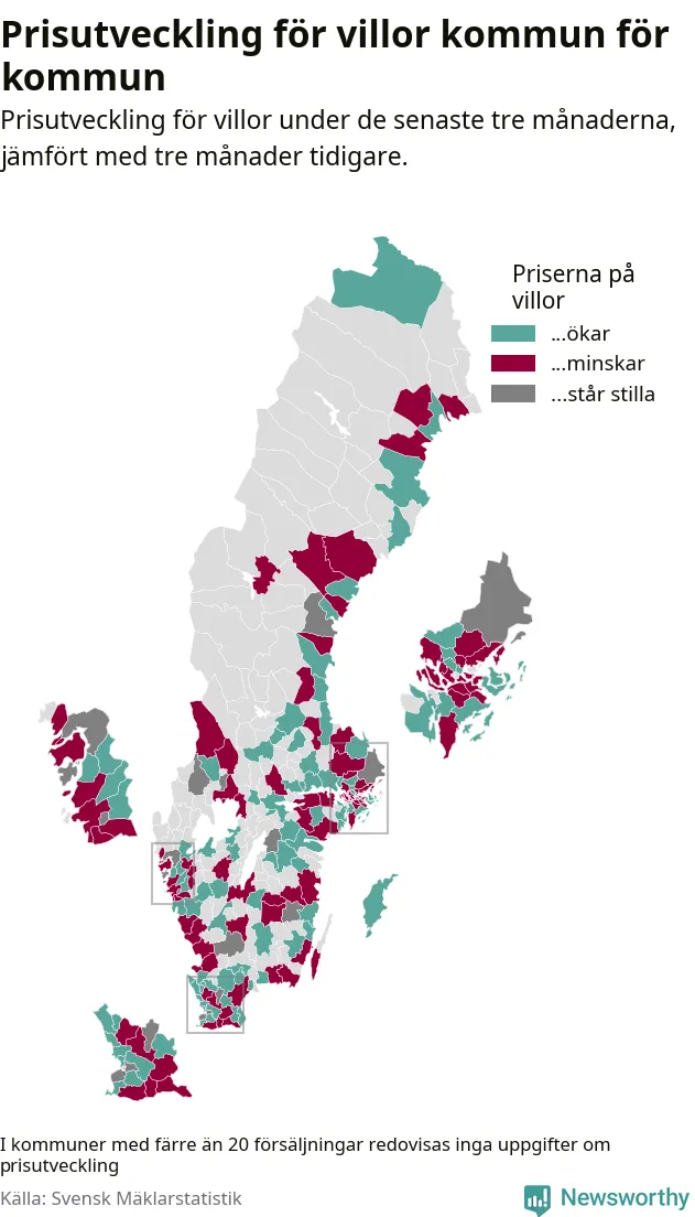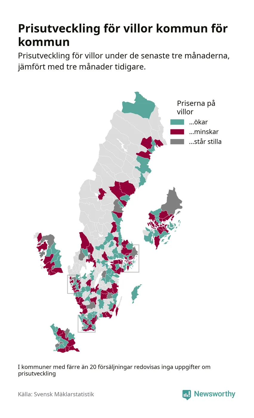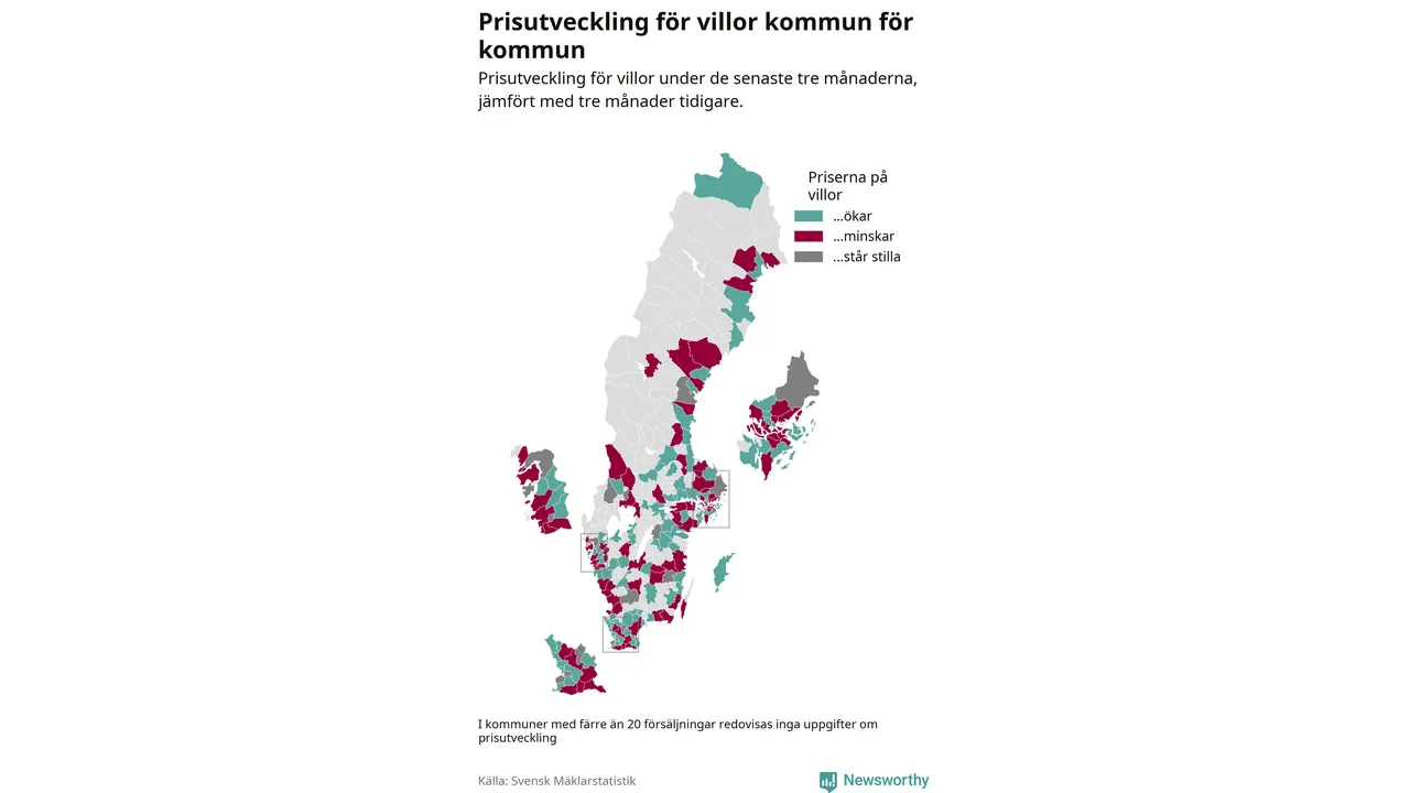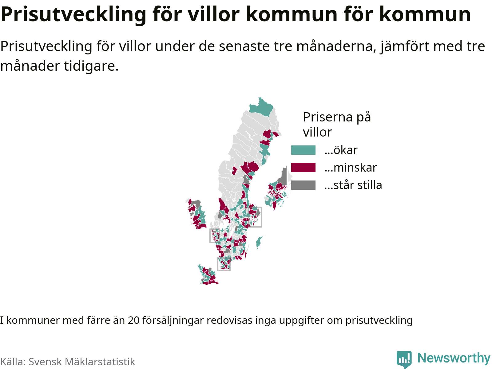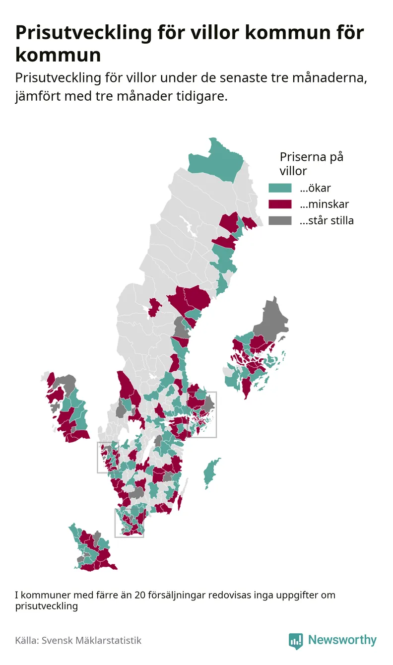 Priserna på villor stiger i 78 av landets kommuner, medan de sjunker i 66 (i merparten av de resterande kommunerna redovisas inga prisförändringsuppgifter på grund av få försäljningar). Kartan intill visar den geografiska spridningen.