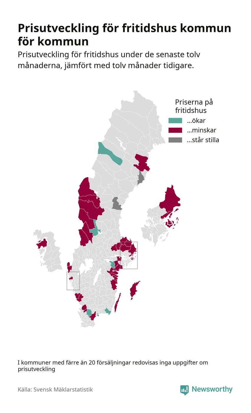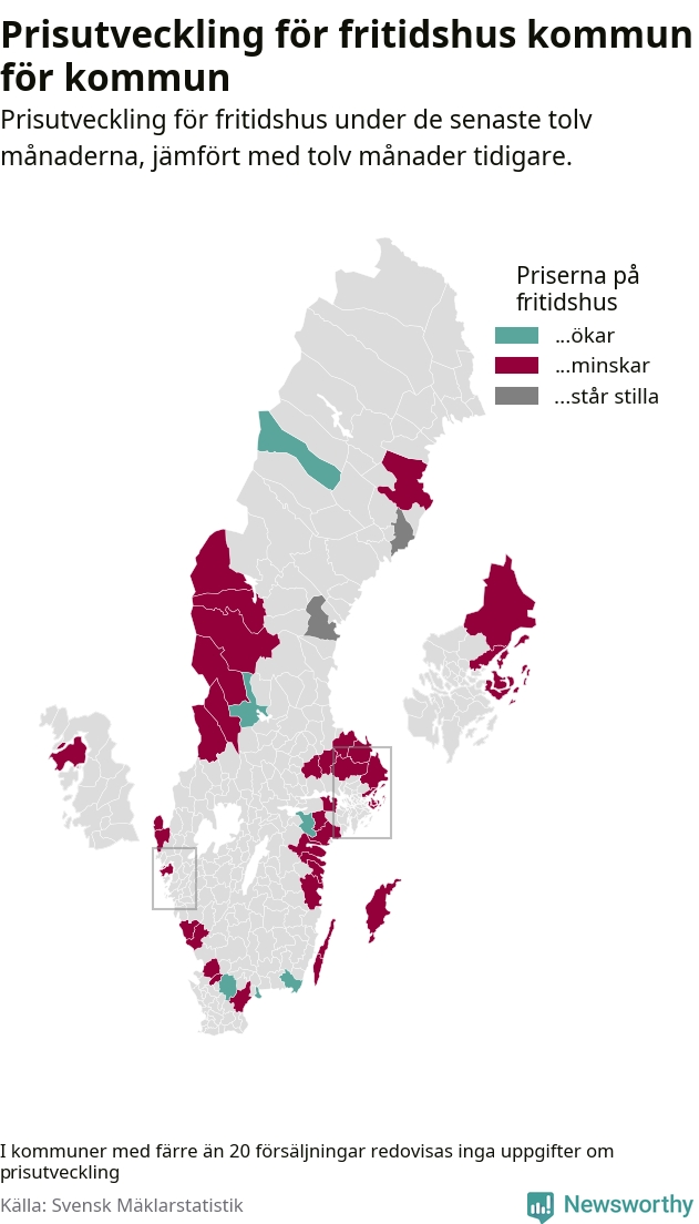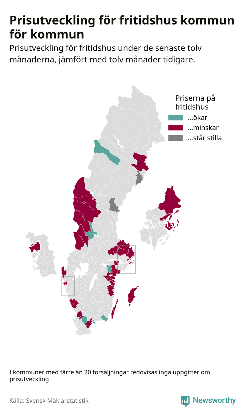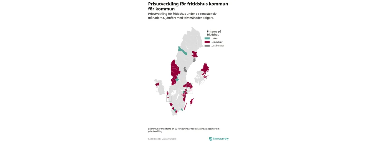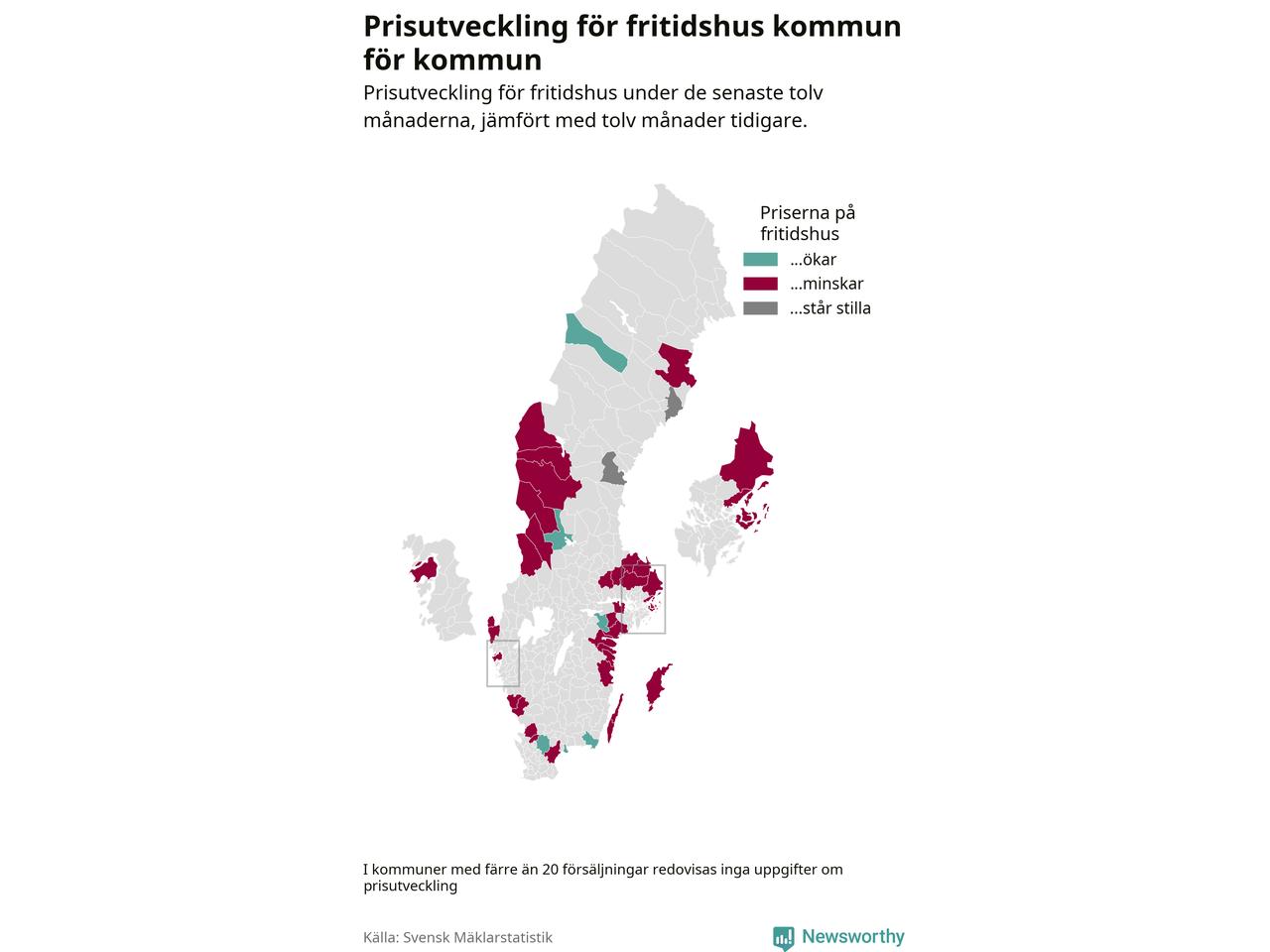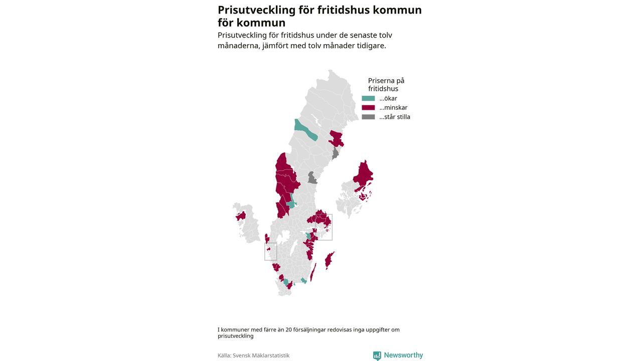 Priserna på fritidshus sjunker i 33 av landets kommuner, medan de stiger i sex (i merparten av de resterande kommunerna redovisas inga prisförändringsuppgifter på grund av få försäljningar). Kartan intill visar den geografiska spridningen.