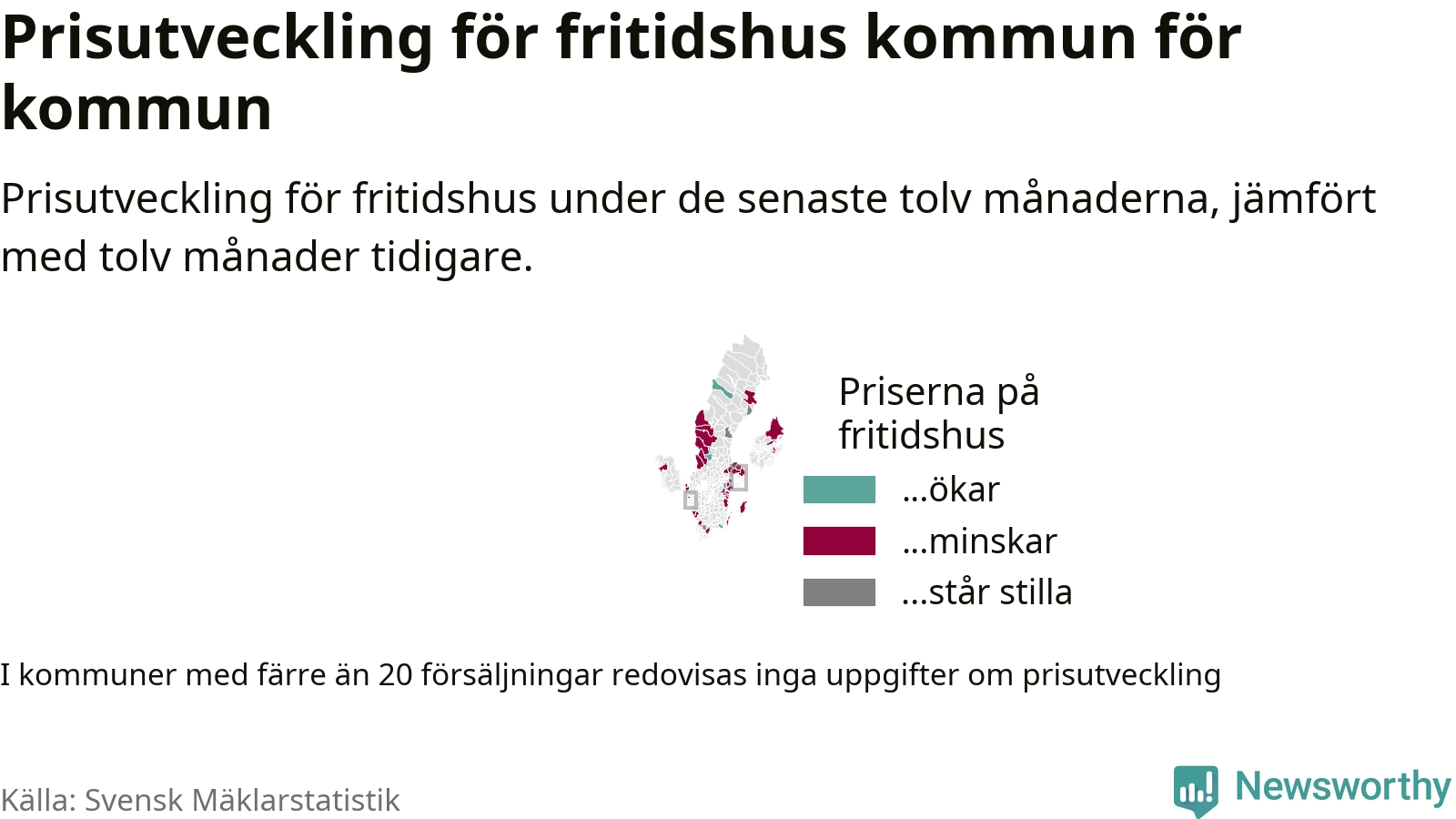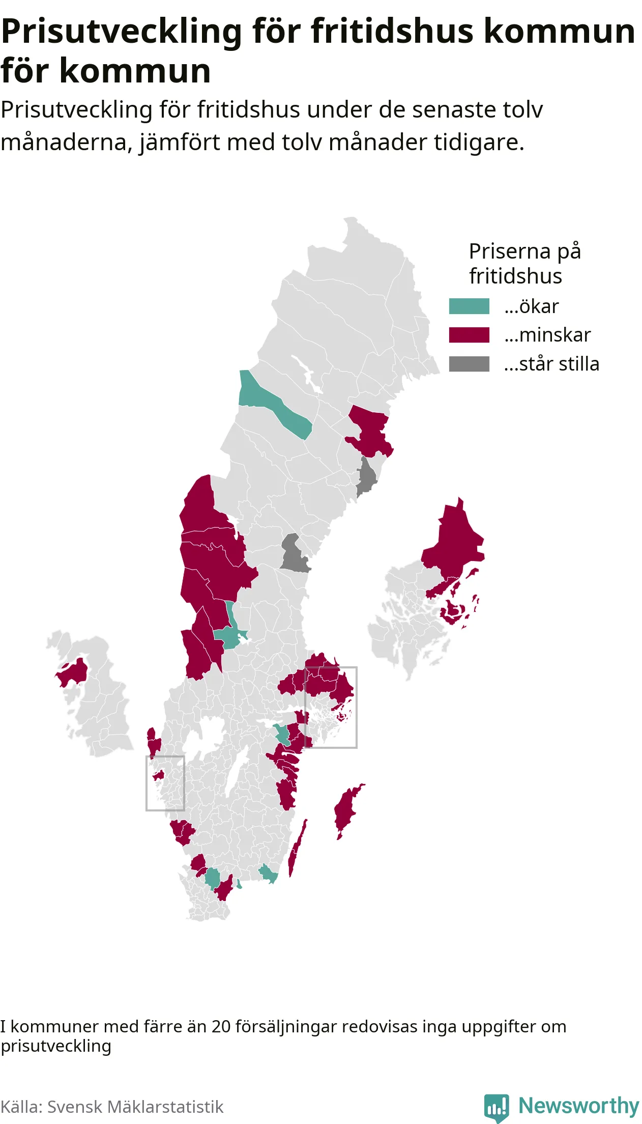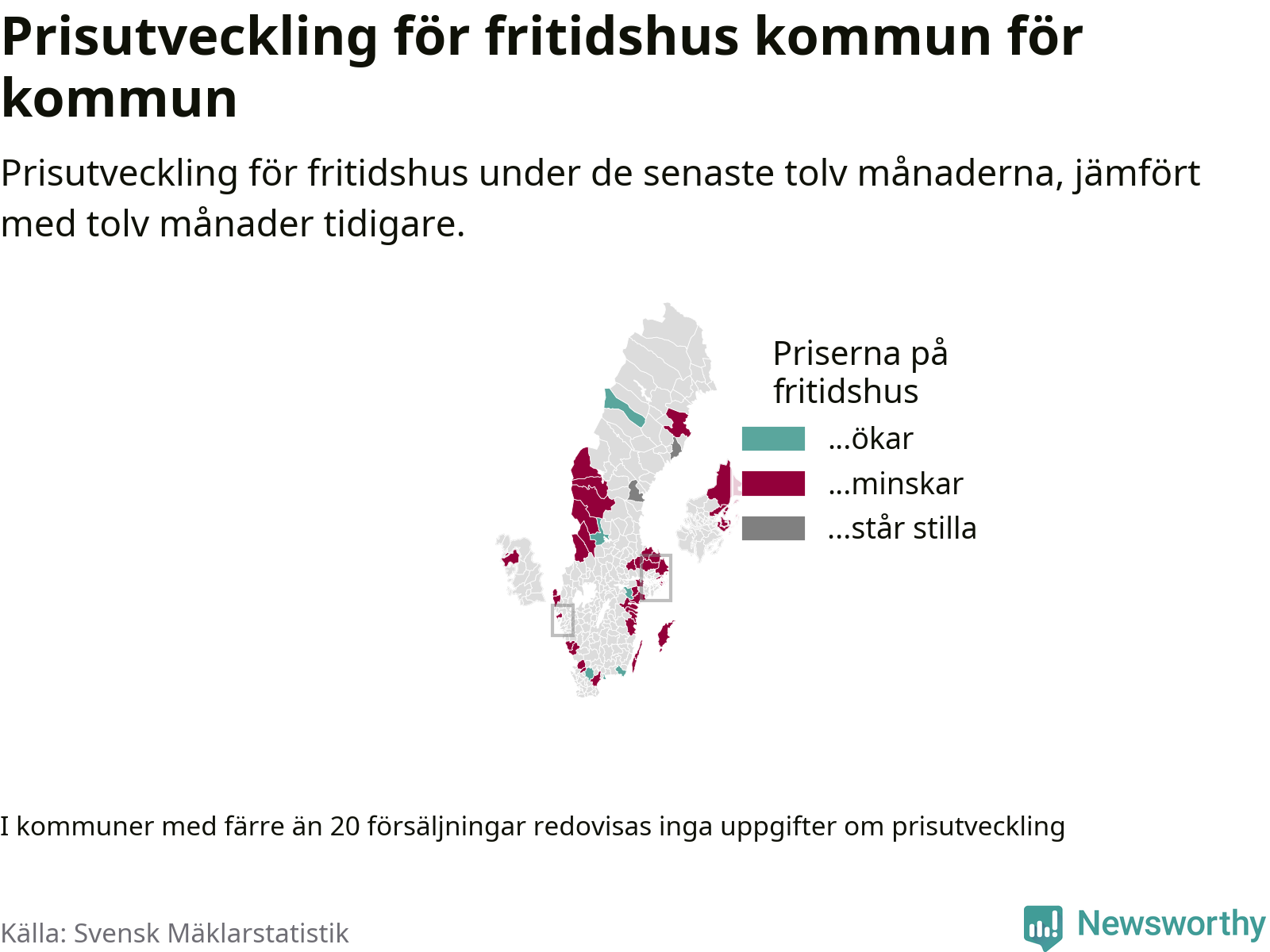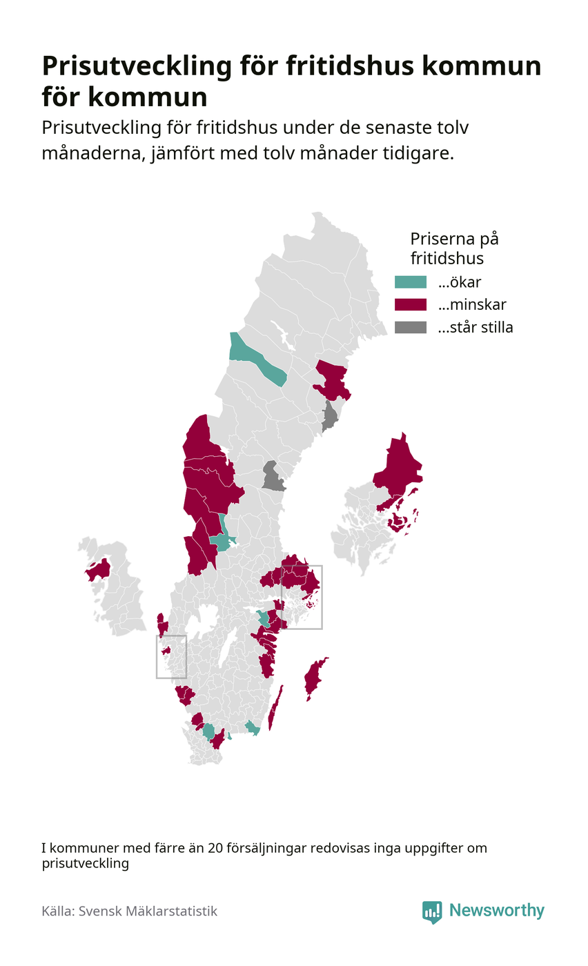 Priserna på fritidshus sjunker i 33 av landets kommuner, medan de stiger i sex (i merparten av de resterande kommunerna redovisas inga prisförändringsuppgifter på grund av få försäljningar). Kartan intill visar den geografiska spridningen.
