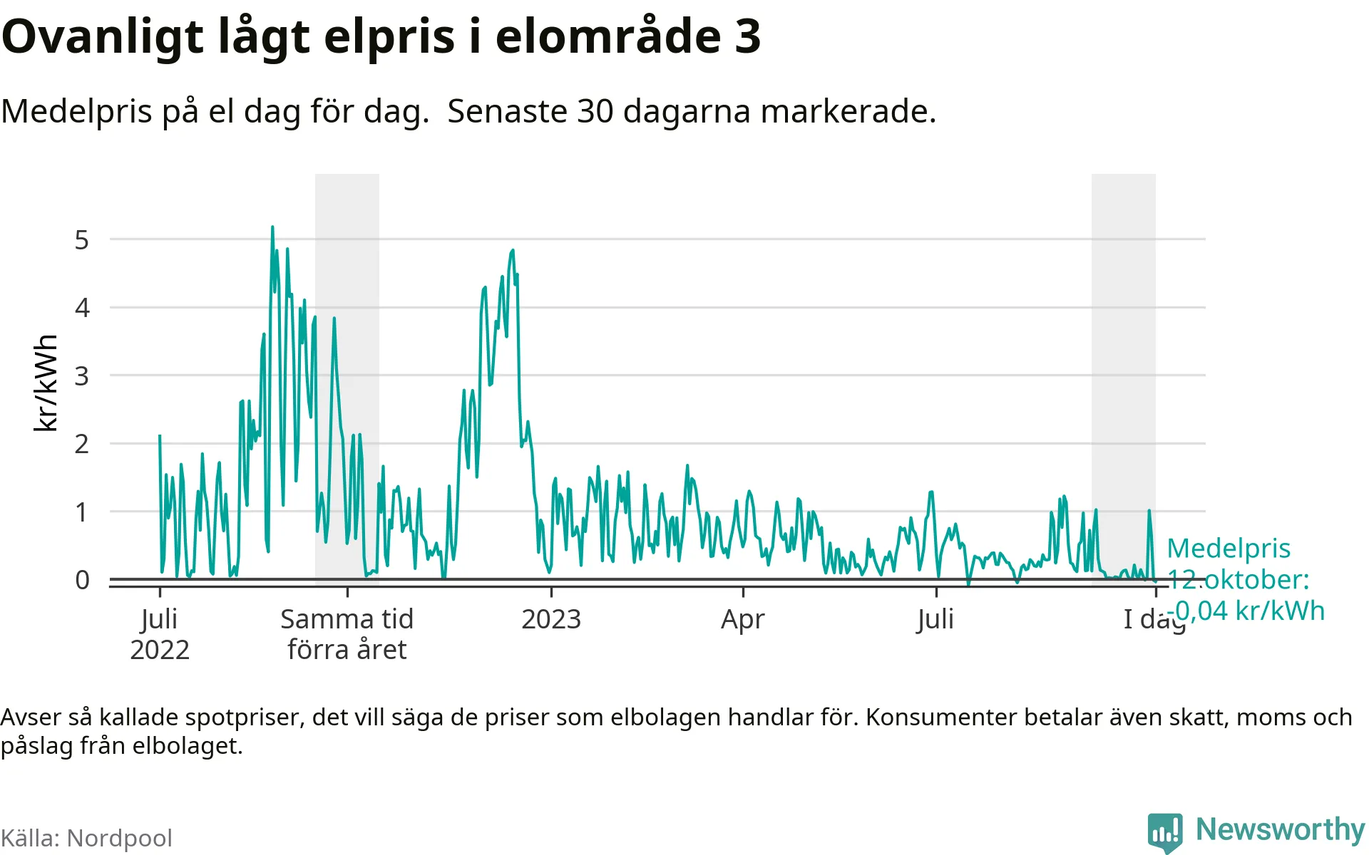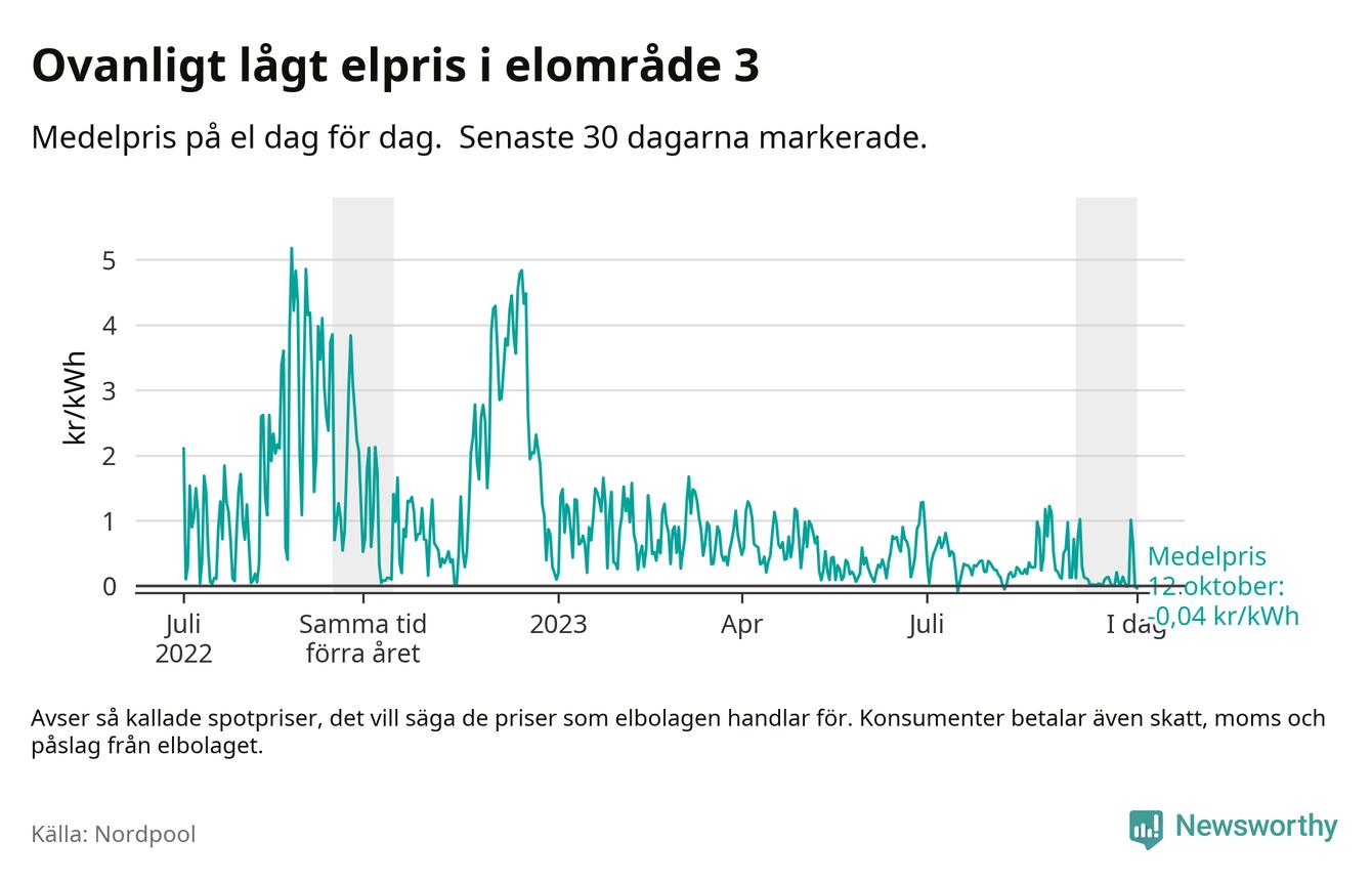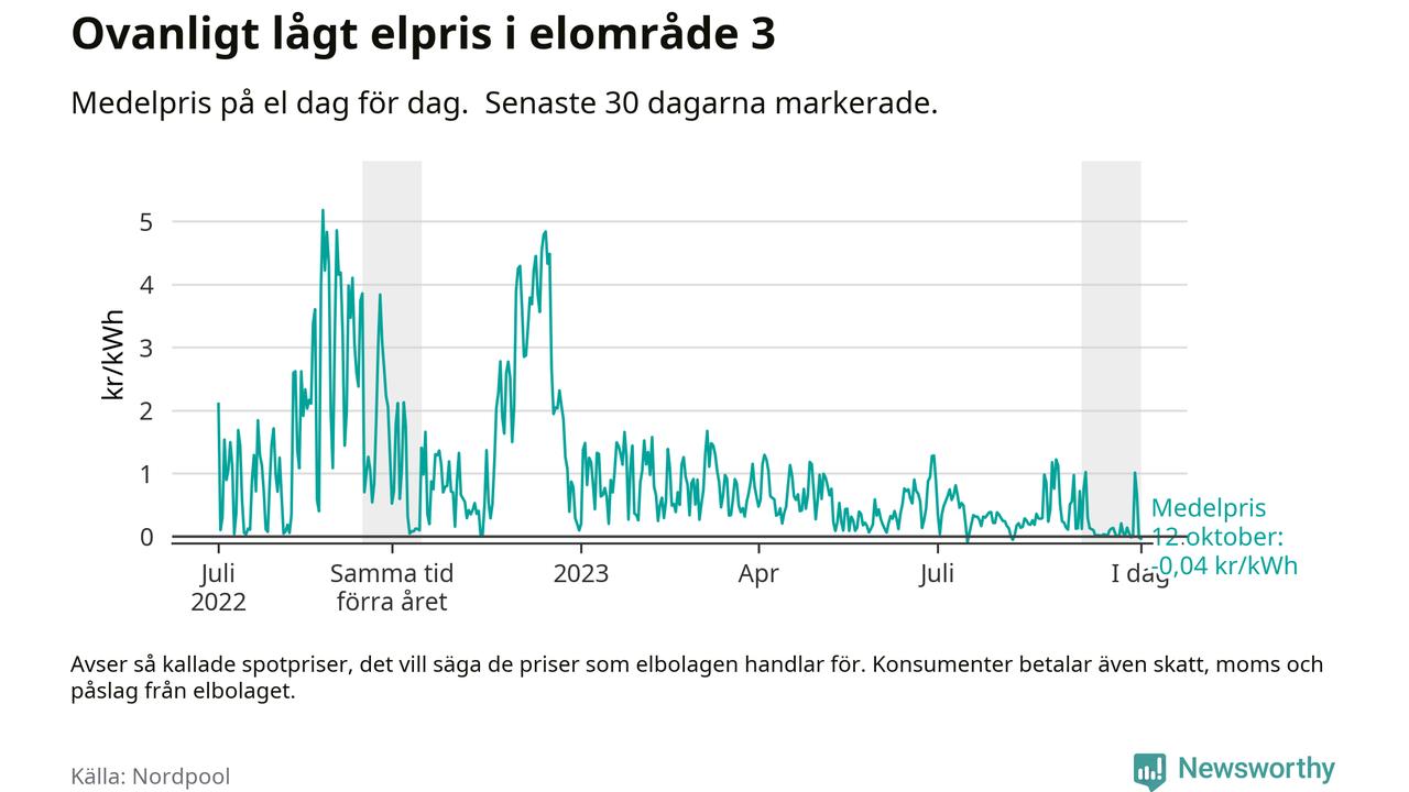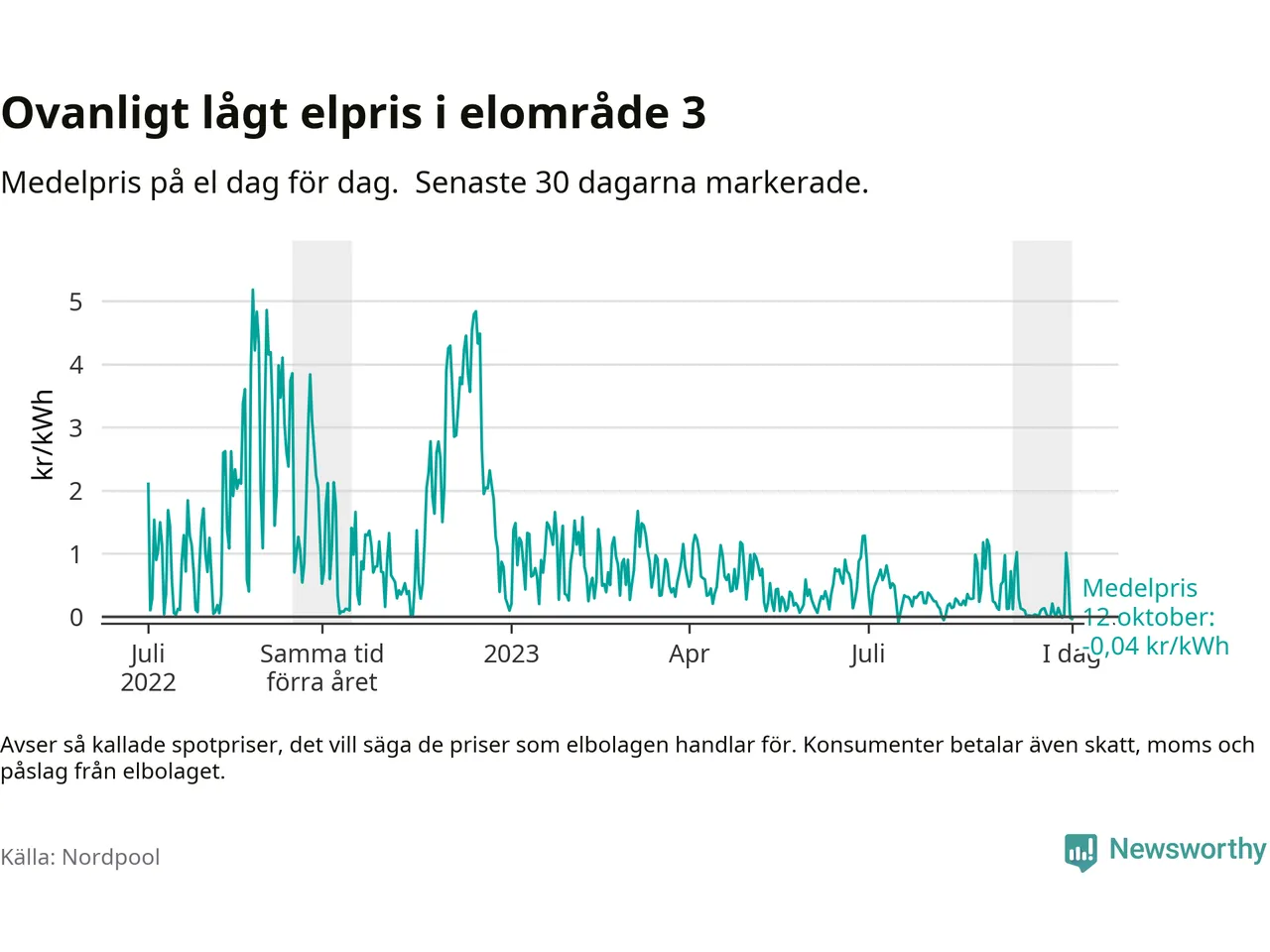 Dygnspriset på el är på torsdag, den 12 oktober, −0,04 kronor i elområde 3 på den nordiska elbörsen Nordpool. Det är det tredje lägsta dygnspriset sedan 2019.