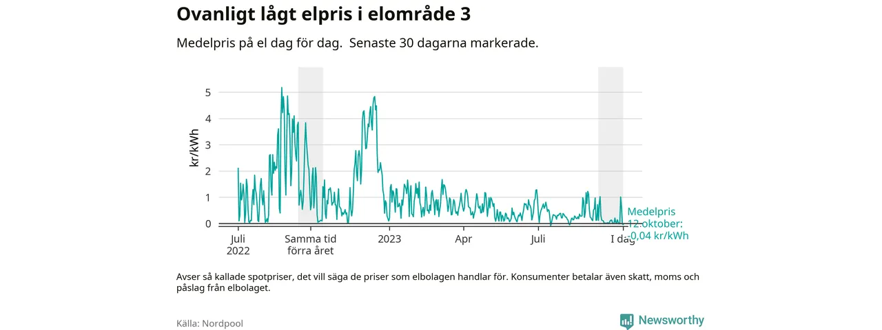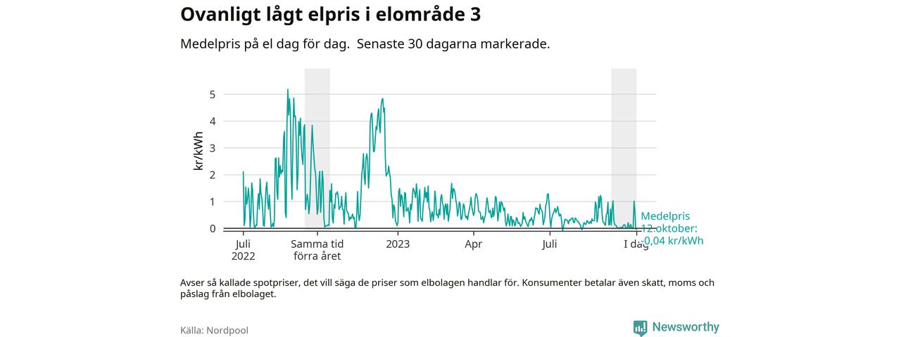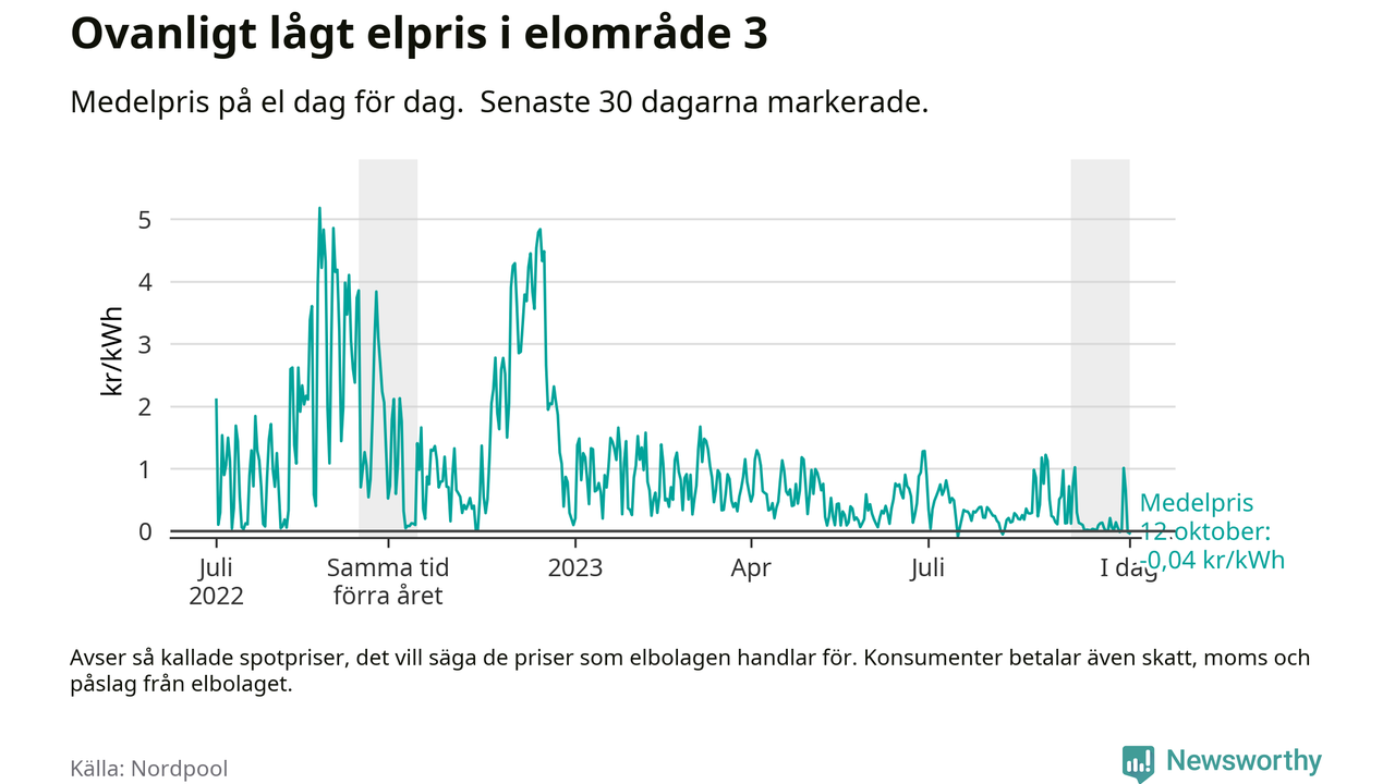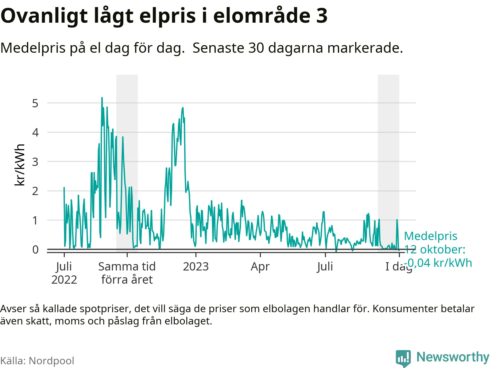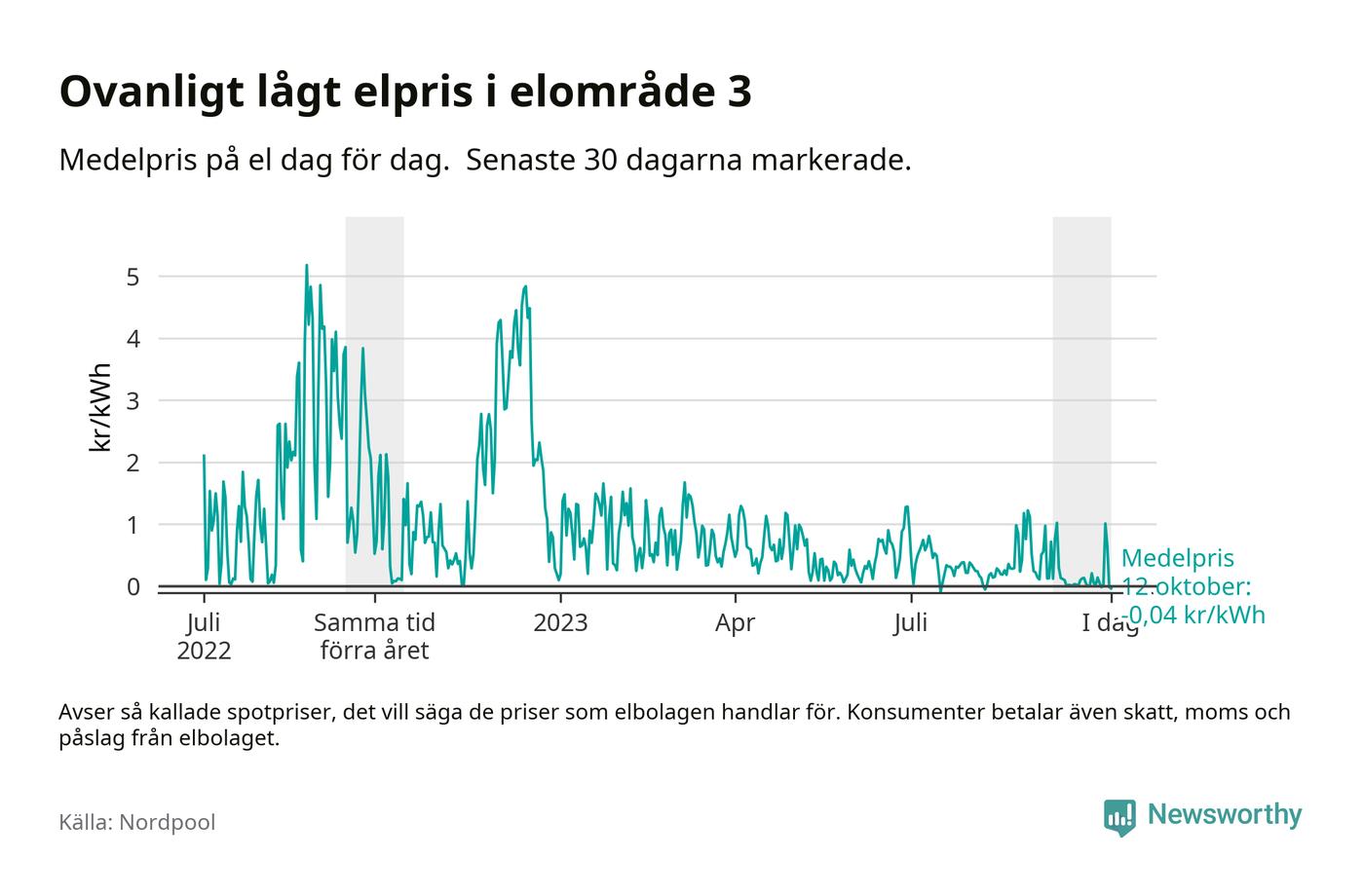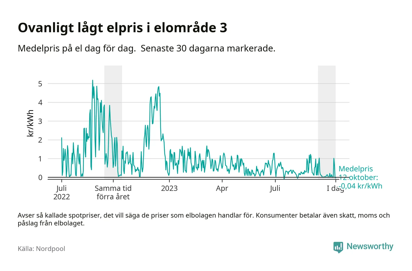 Dygnspriset på el är på torsdag, den 12 oktober, −0,04 kronor i elområde 3 på den nordiska elbörsen Nordpool. Det är det tredje lägsta dygnspriset sedan 2019.