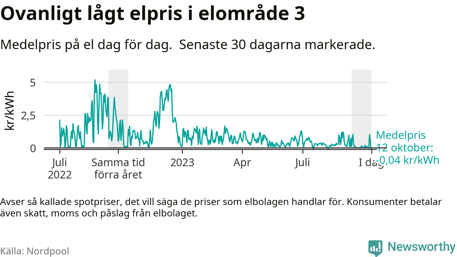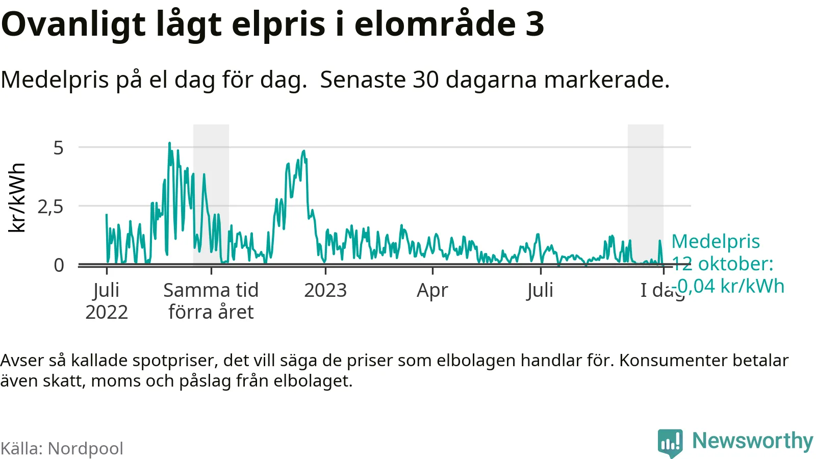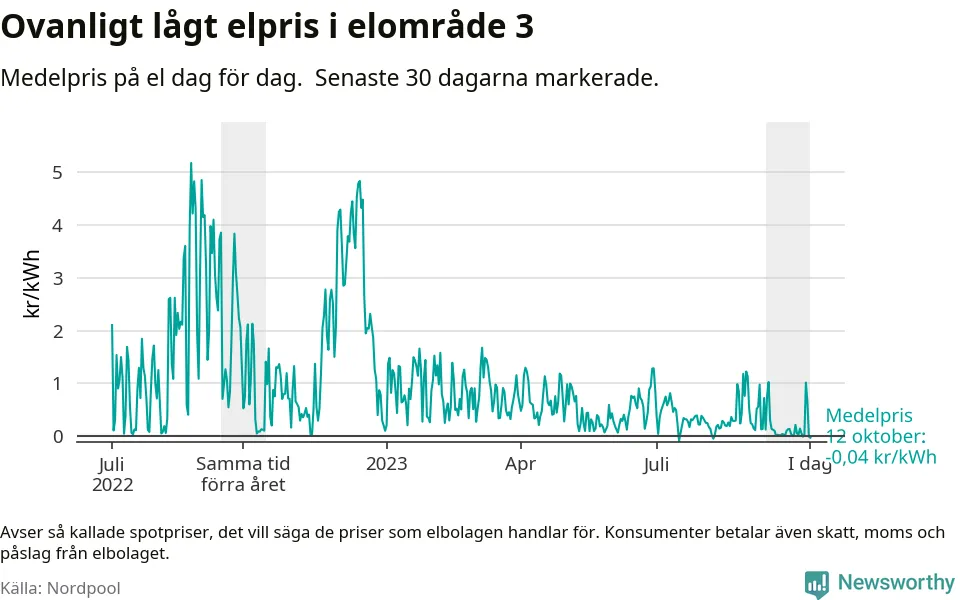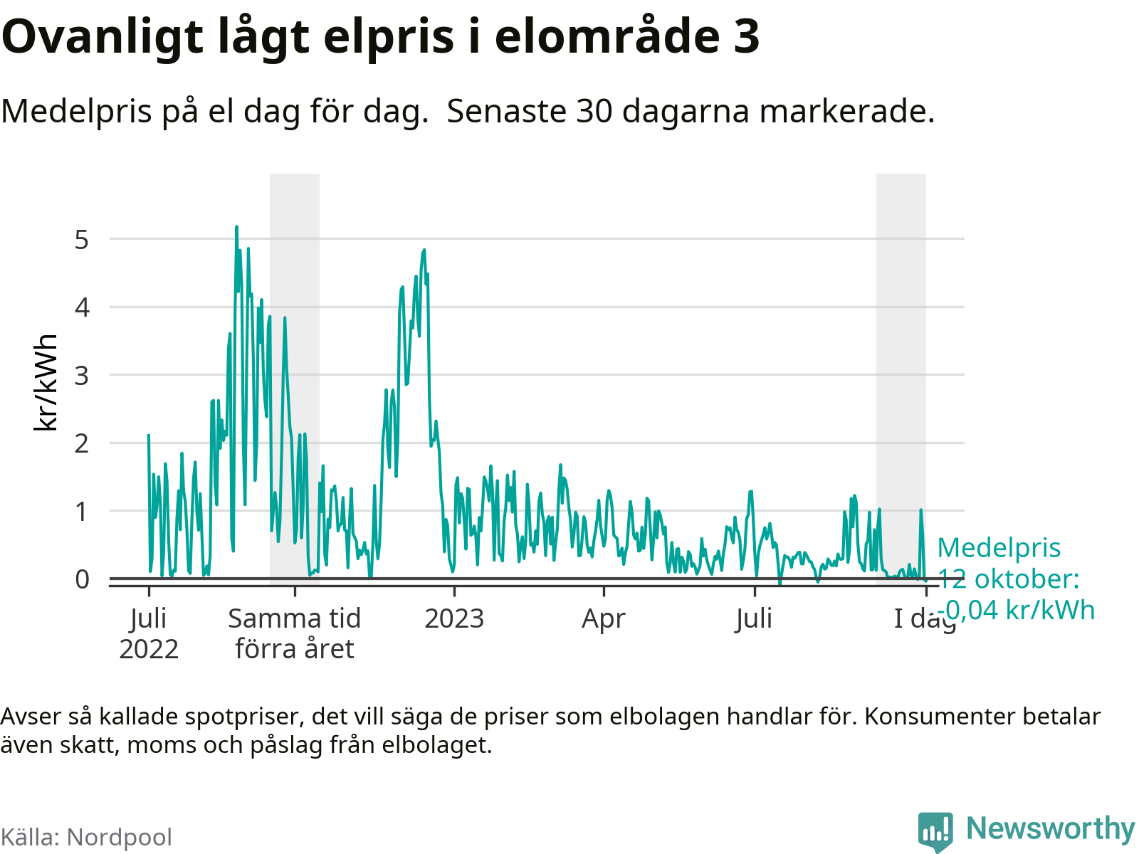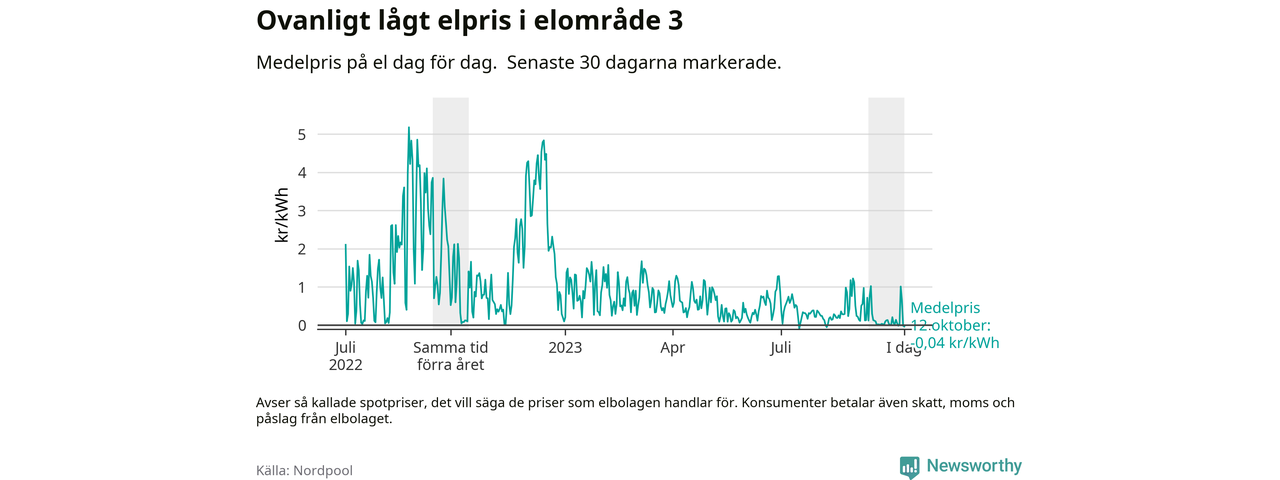 Dygnspriset på el är på torsdag, den 12 oktober, −0,04 kronor i elområde 3 på den nordiska elbörsen Nordpool. Det är det tredje lägsta dygnspriset sedan 2019.