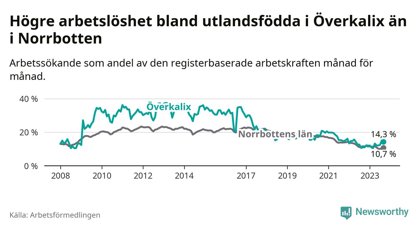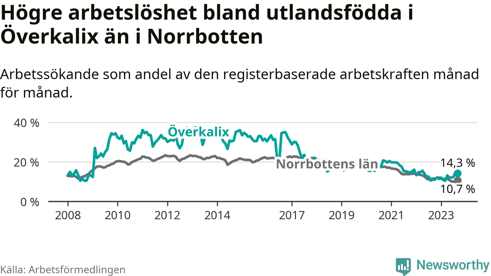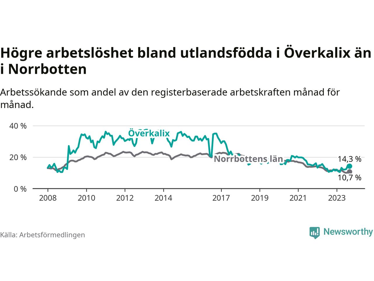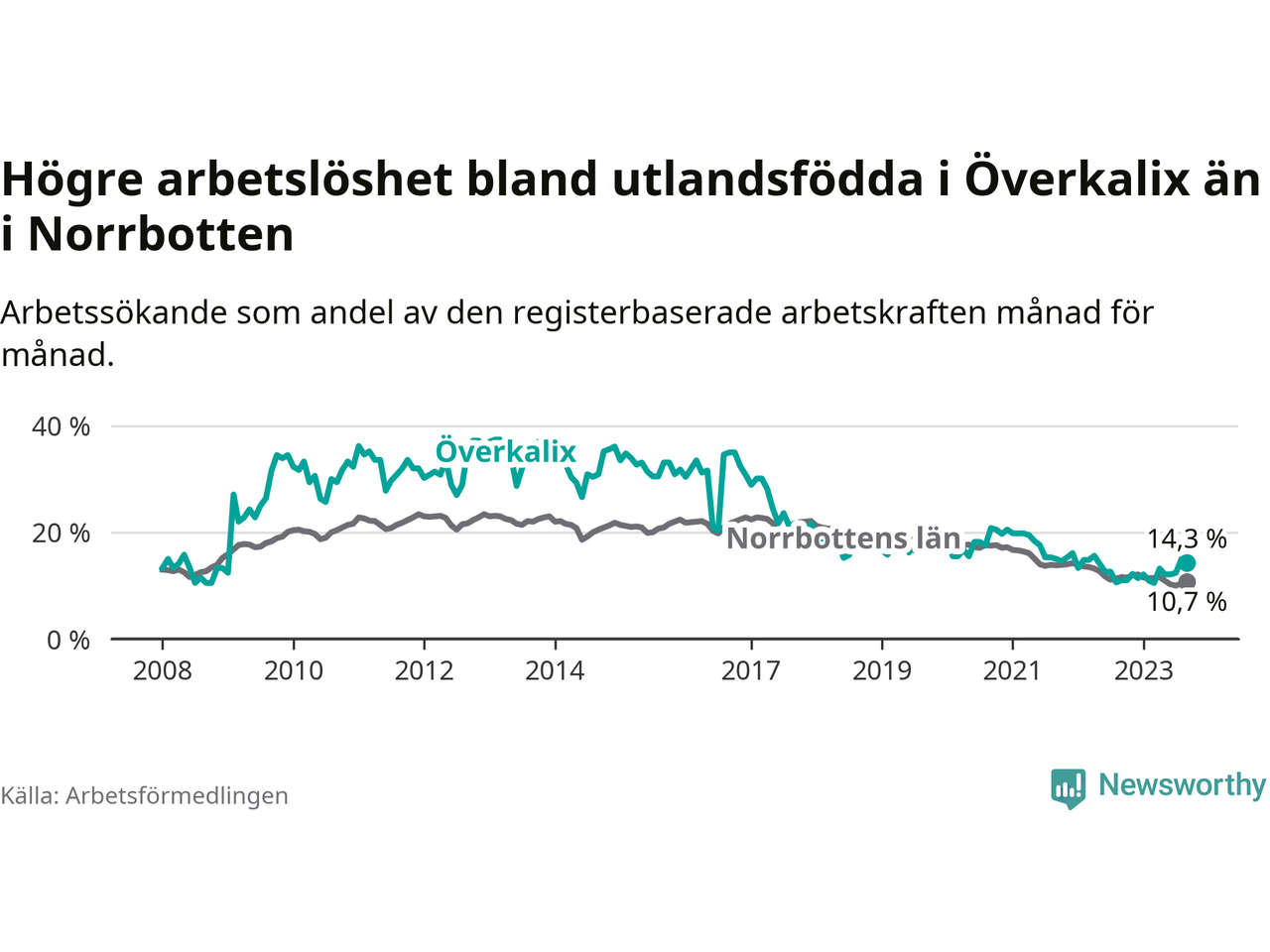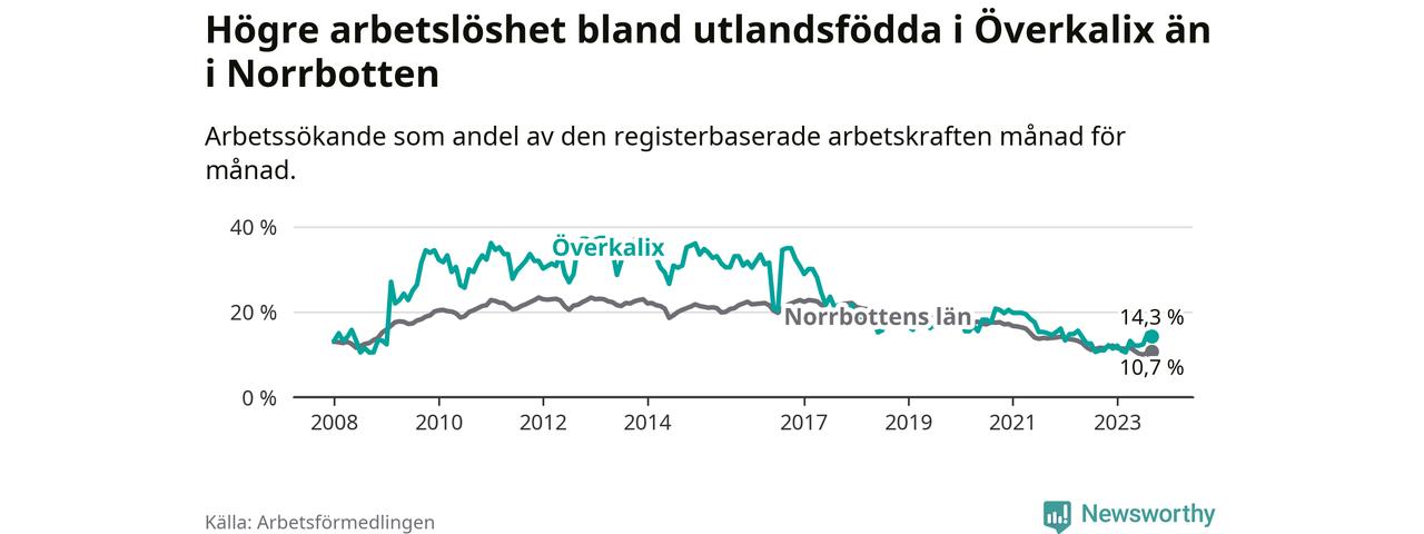 Arbetslösheten bland utlandsfödda var 14,3 procent i Överkalix under september månad, motsvarande 34 av 238 personer. Det är 3,3 procentenheter fler än vid samma tidpunkt i fjol (+10 om man räknar personer).