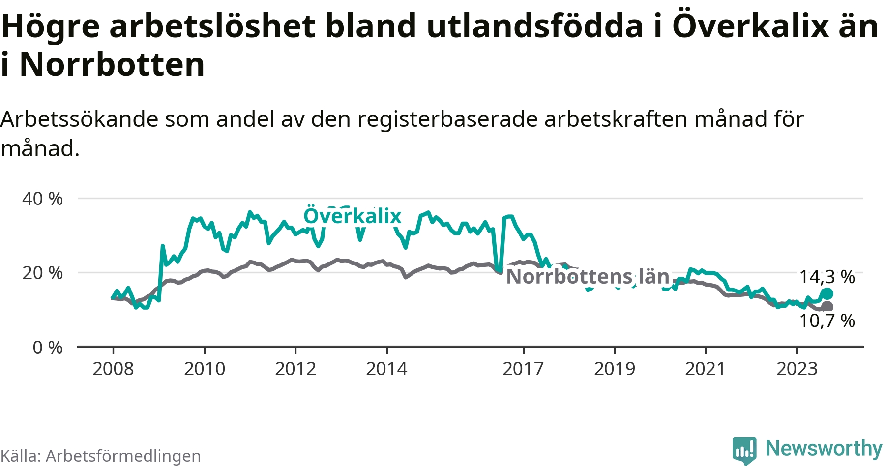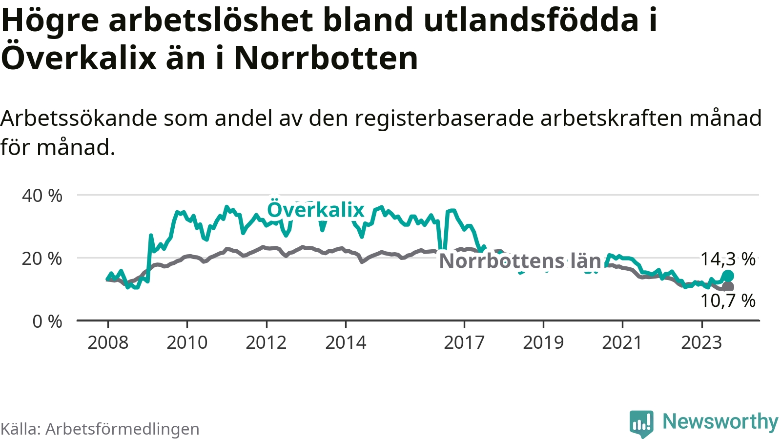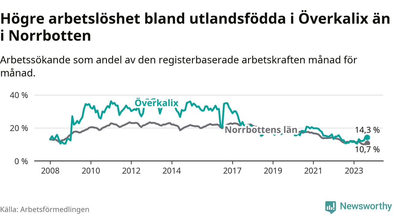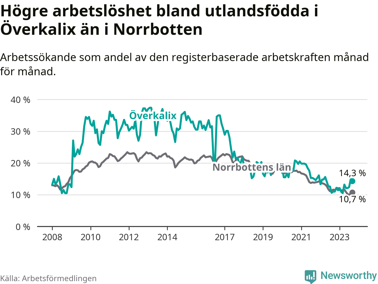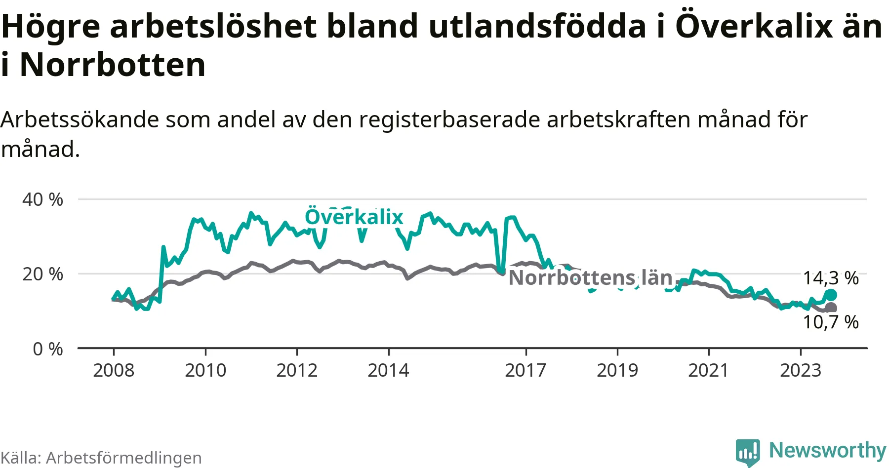 Arbetslösheten bland utlandsfödda var 14,3 procent i Överkalix under september månad, motsvarande 34 av 238 personer. Det är 3,3 procentenheter fler än vid samma tidpunkt i fjol (+10 om man räknar personer).