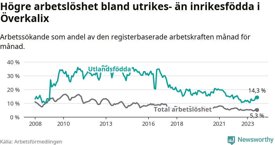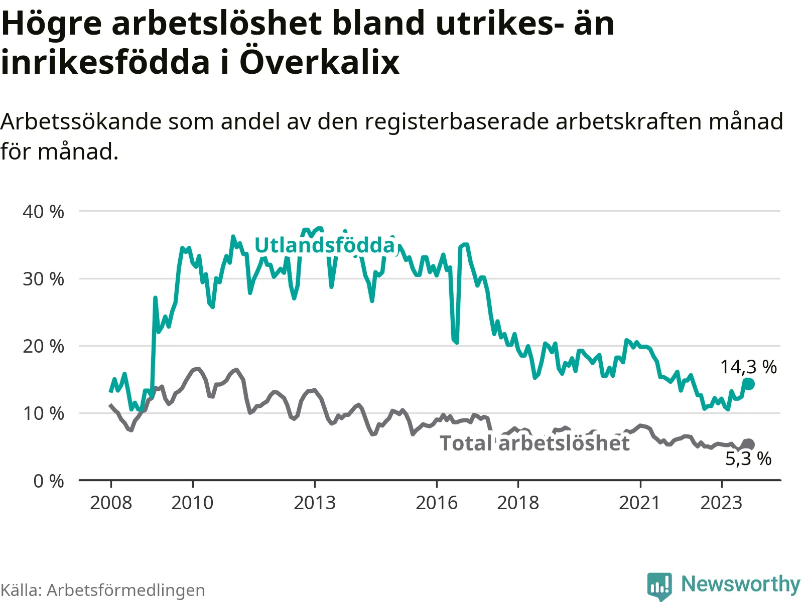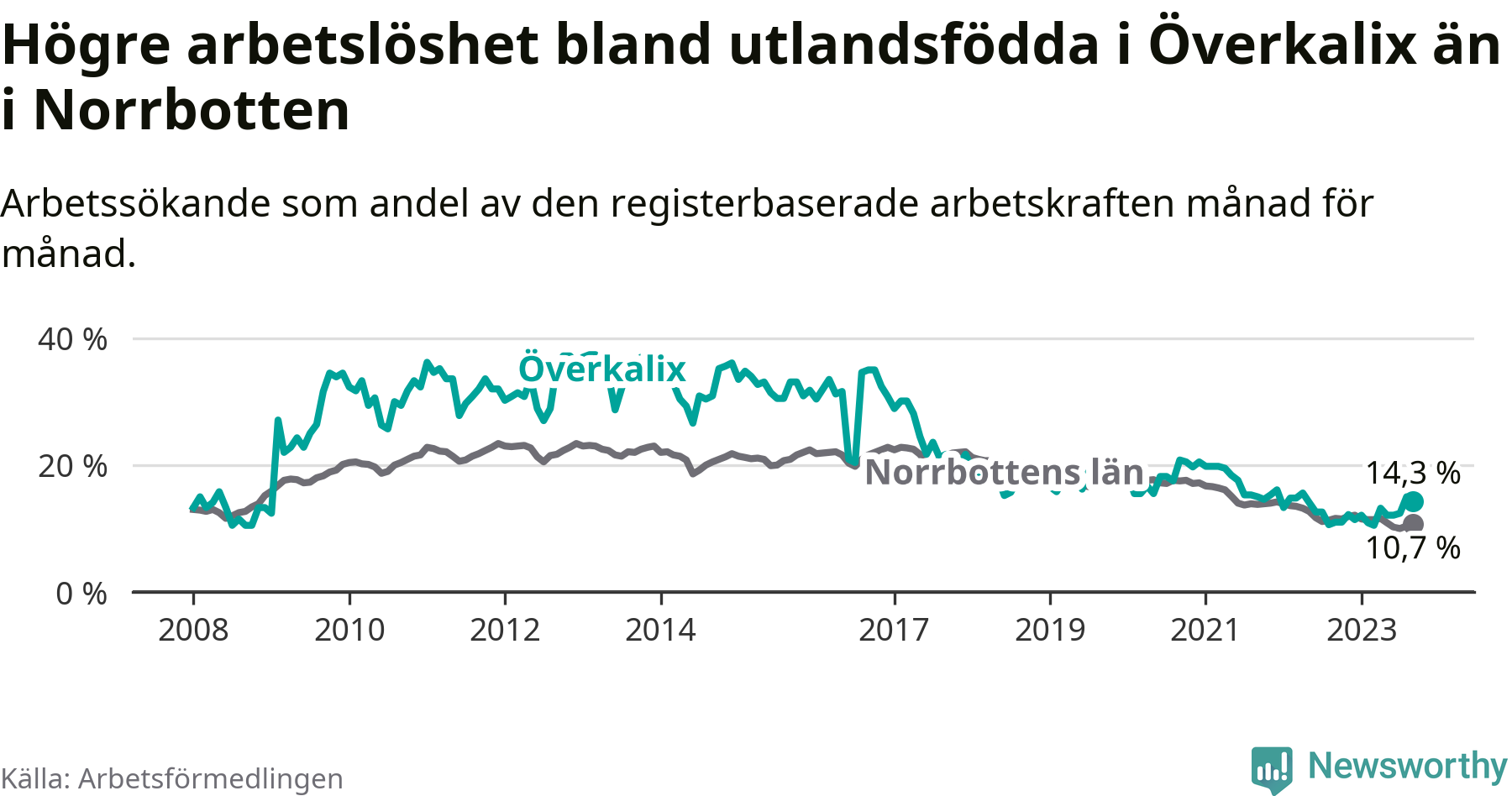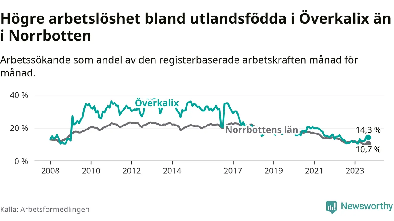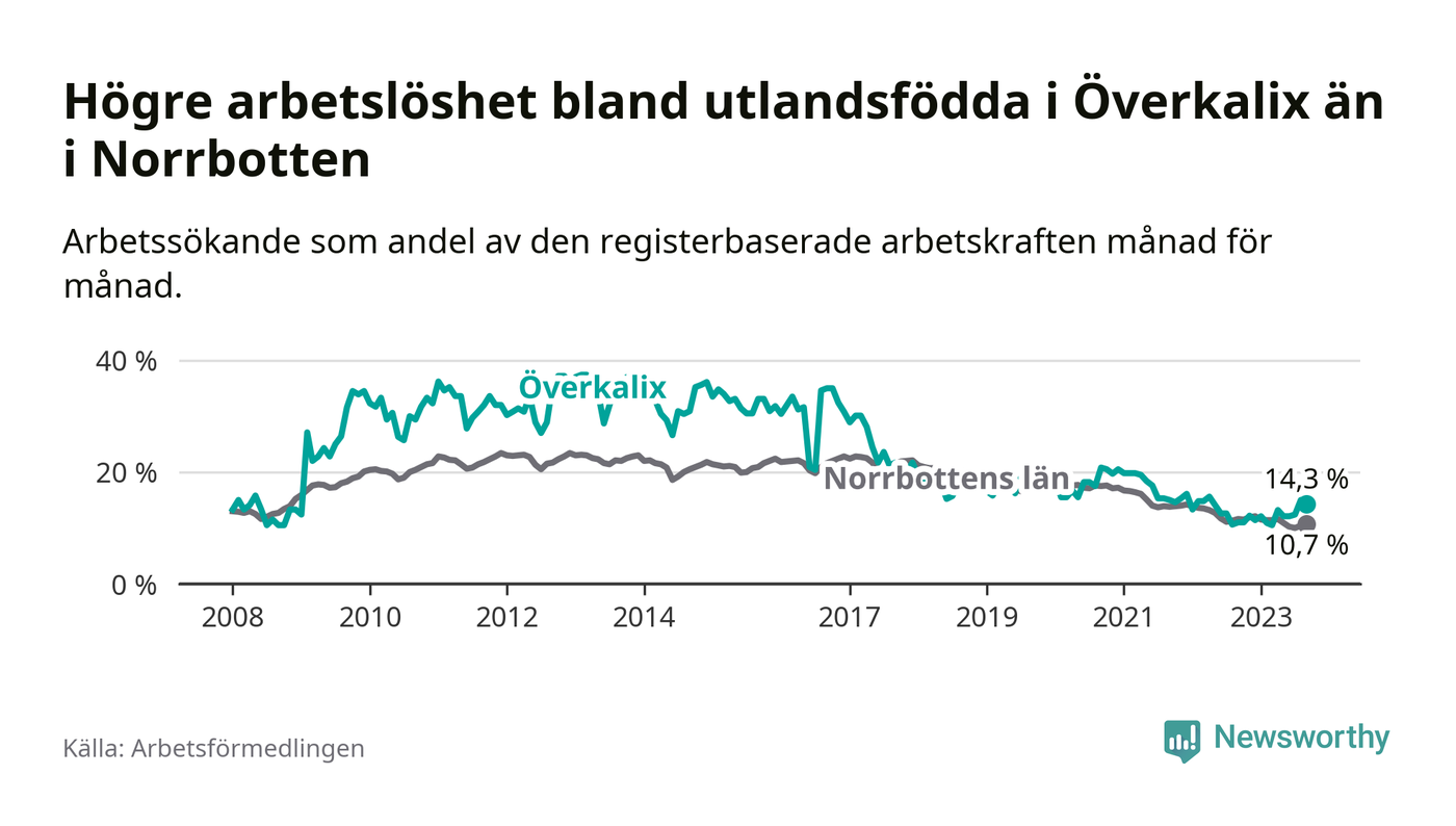 Arbetslösheten bland utlandsfödda var 14,3 procent i Överkalix under september månad, motsvarande 34 av 238 personer. Det är 3,3 procentenheter fler än vid samma tidpunkt i fjol (+10 om man räknar personer).