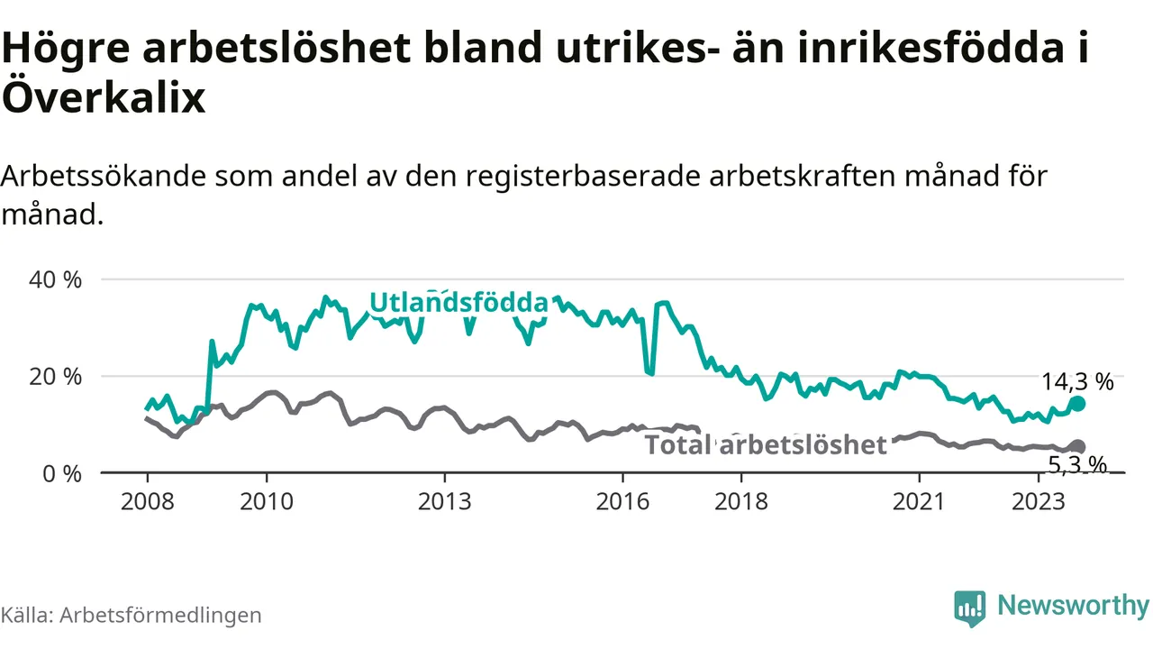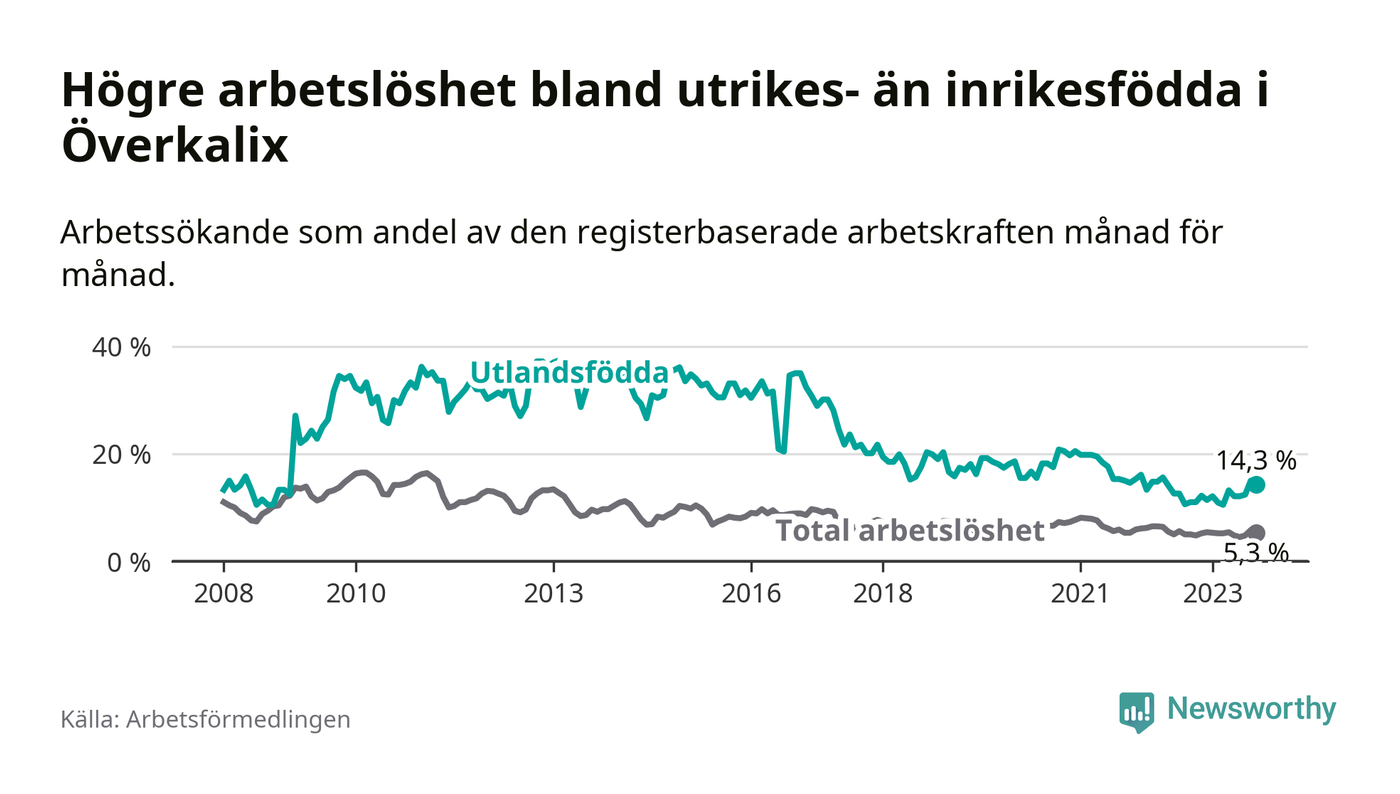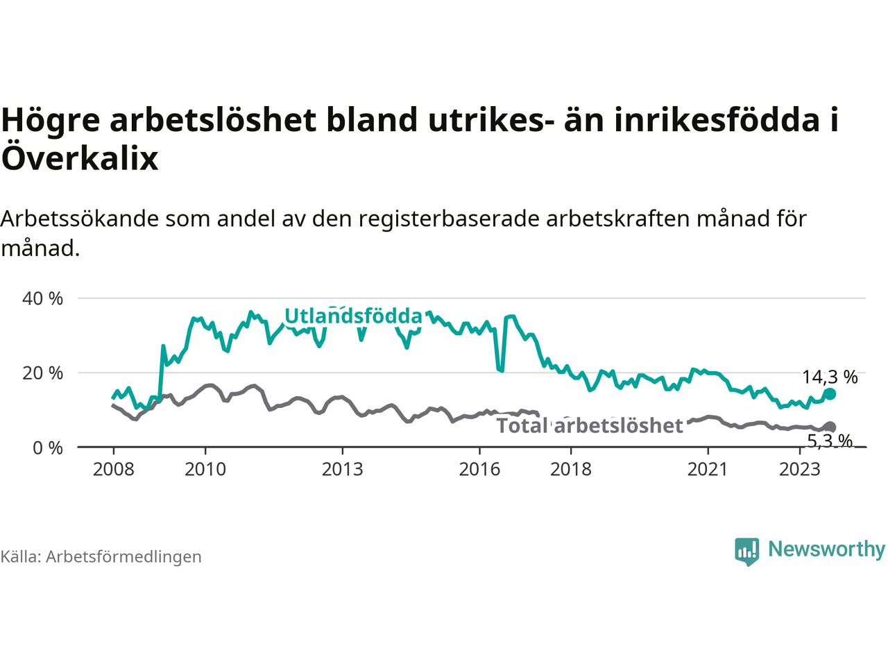 Den senaste månadsstatistiken från Arbetsförmedlingen visar på en uppgång i arbetslöshet bland utlandsfödda i Överkalix kommun med 3,3 procentenheter. Arbetslösheten bland invånare födda i ett annat land låg i september på 14,3 procent.
