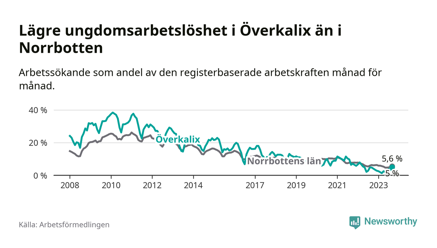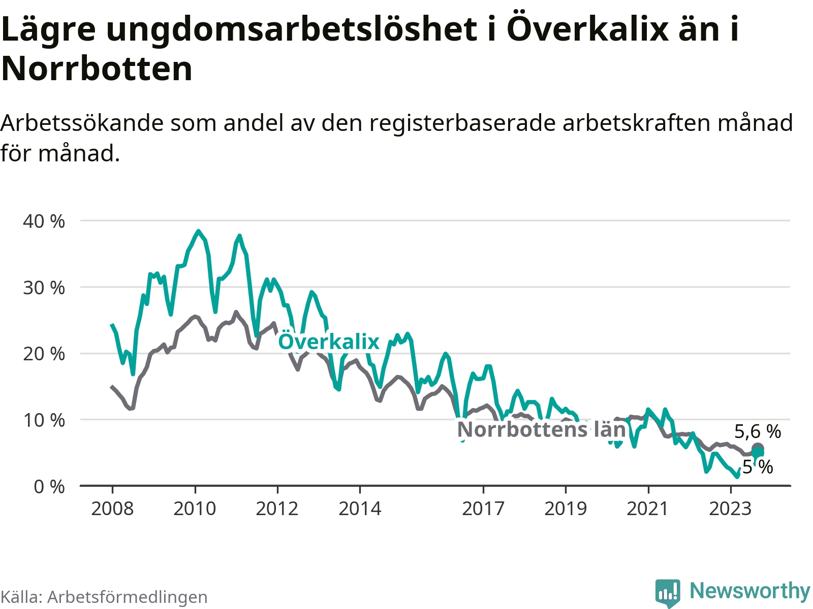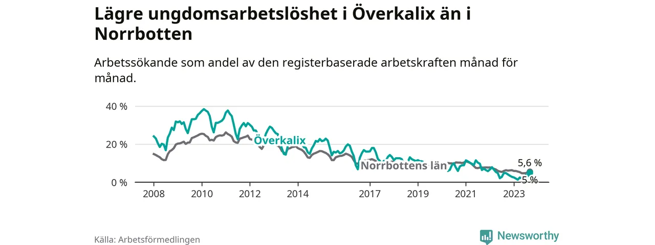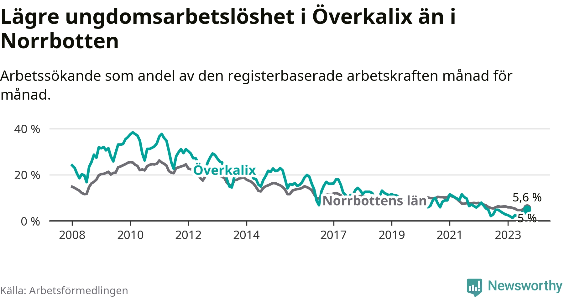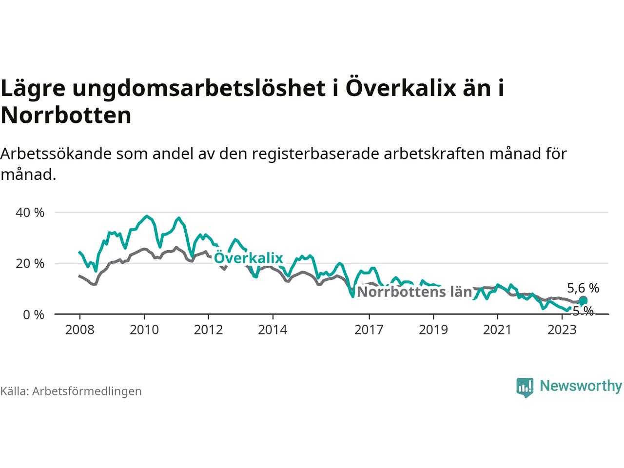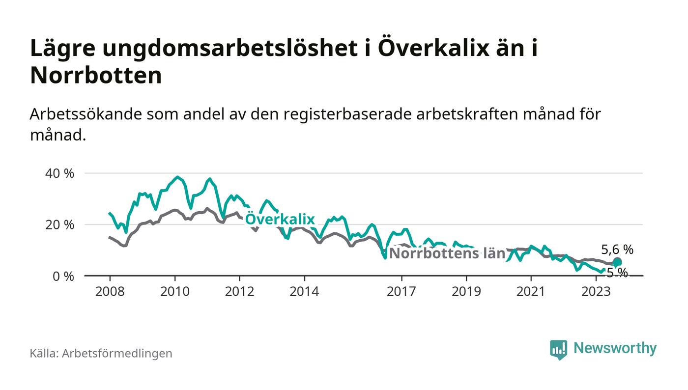Medan Överkalix har högre total arbetslöshet än Norrbotten, ligger ungdomsarbetslösheten 0,6 procentenheter lägre i Överkalix.