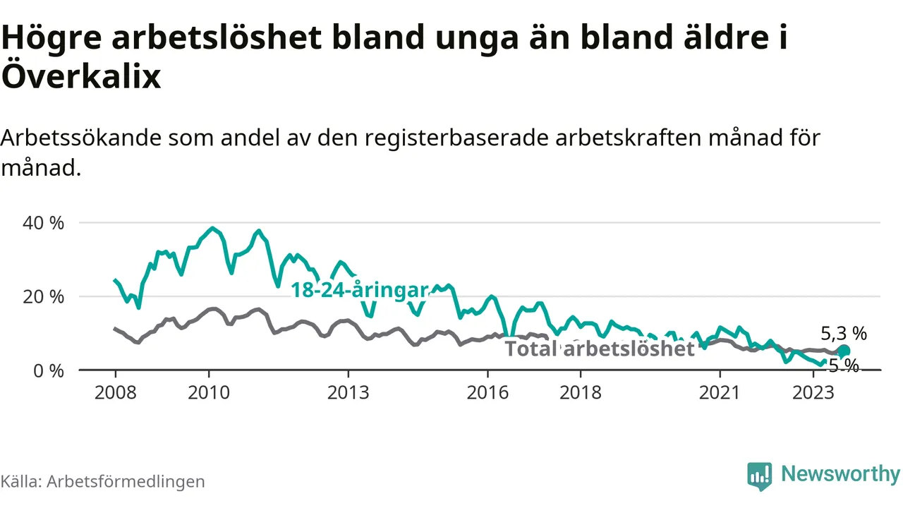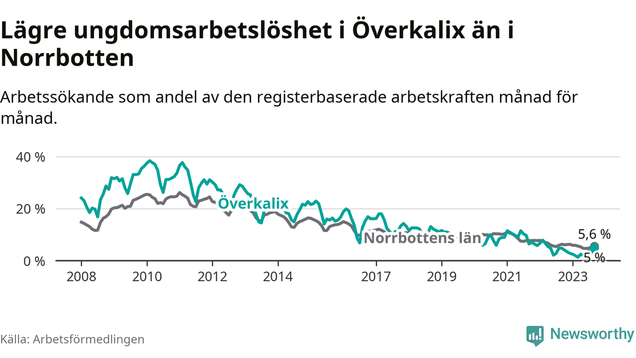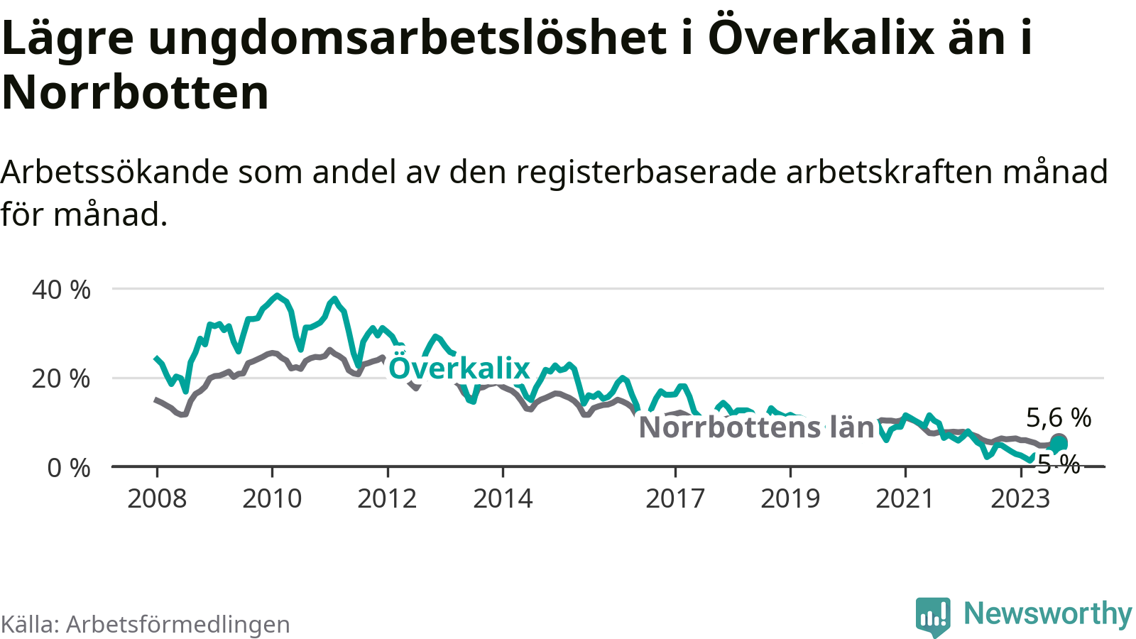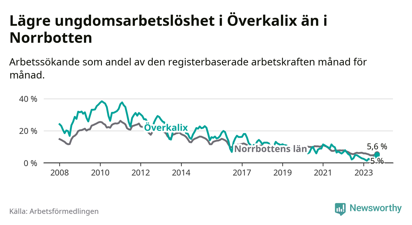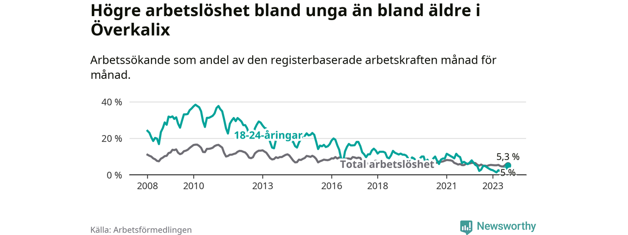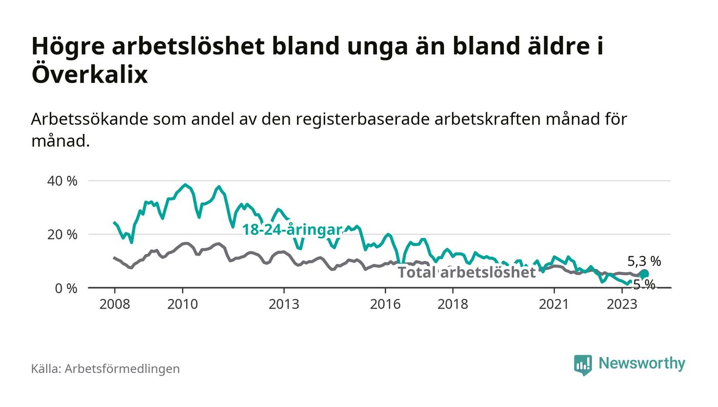 Medan Överkalix har högre total arbetslöshet än Norrbotten, ligger ungdomsarbetslösheten 0,6 procentenheter lägre i Överkalix.
