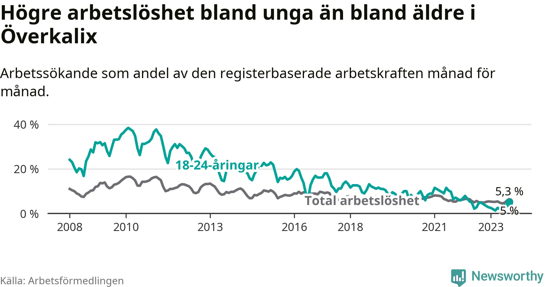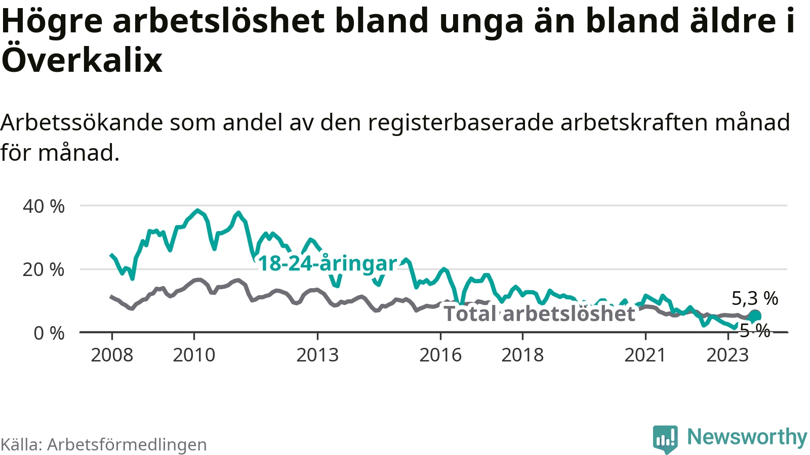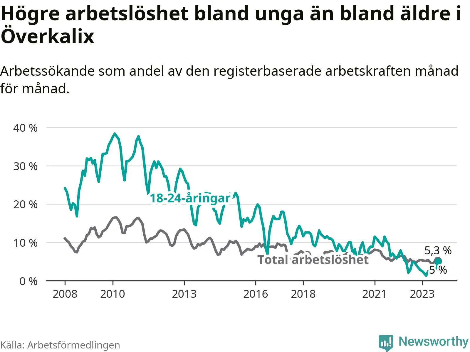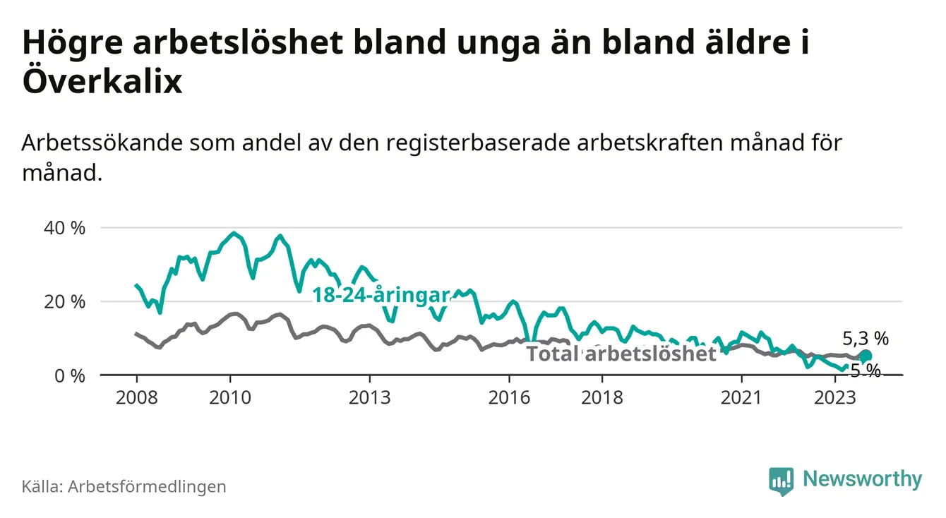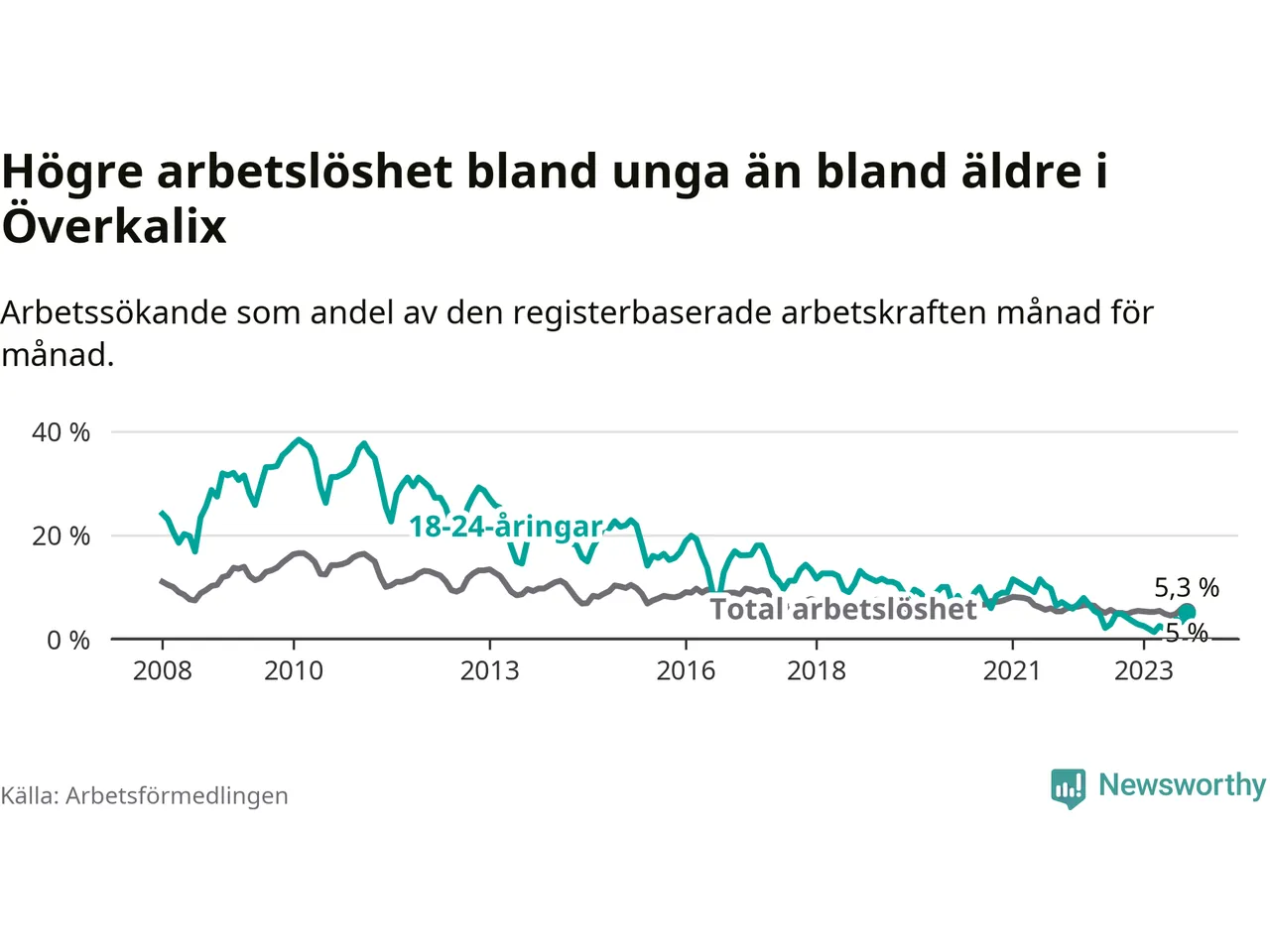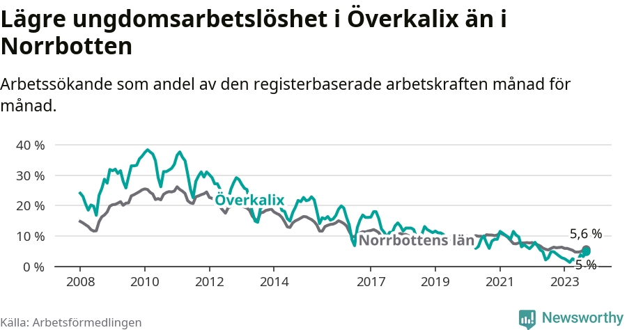 Medan Överkalix har högre total arbetslöshet än Norrbotten, ligger ungdomsarbetslösheten 0,6 procentenheter lägre i Överkalix.
