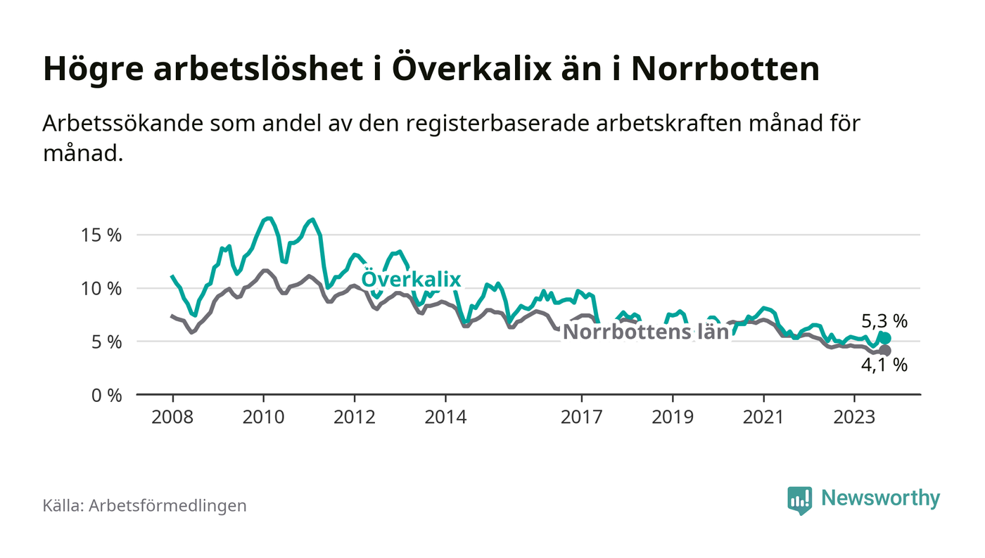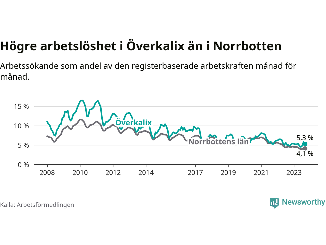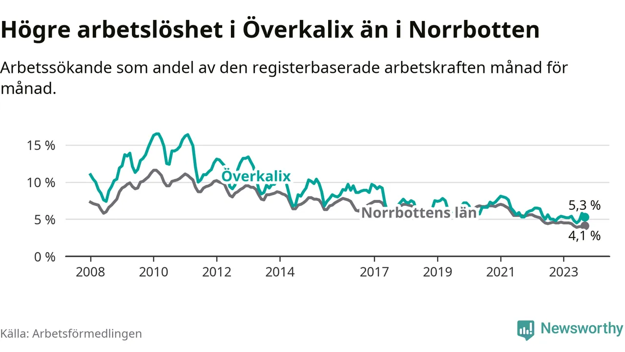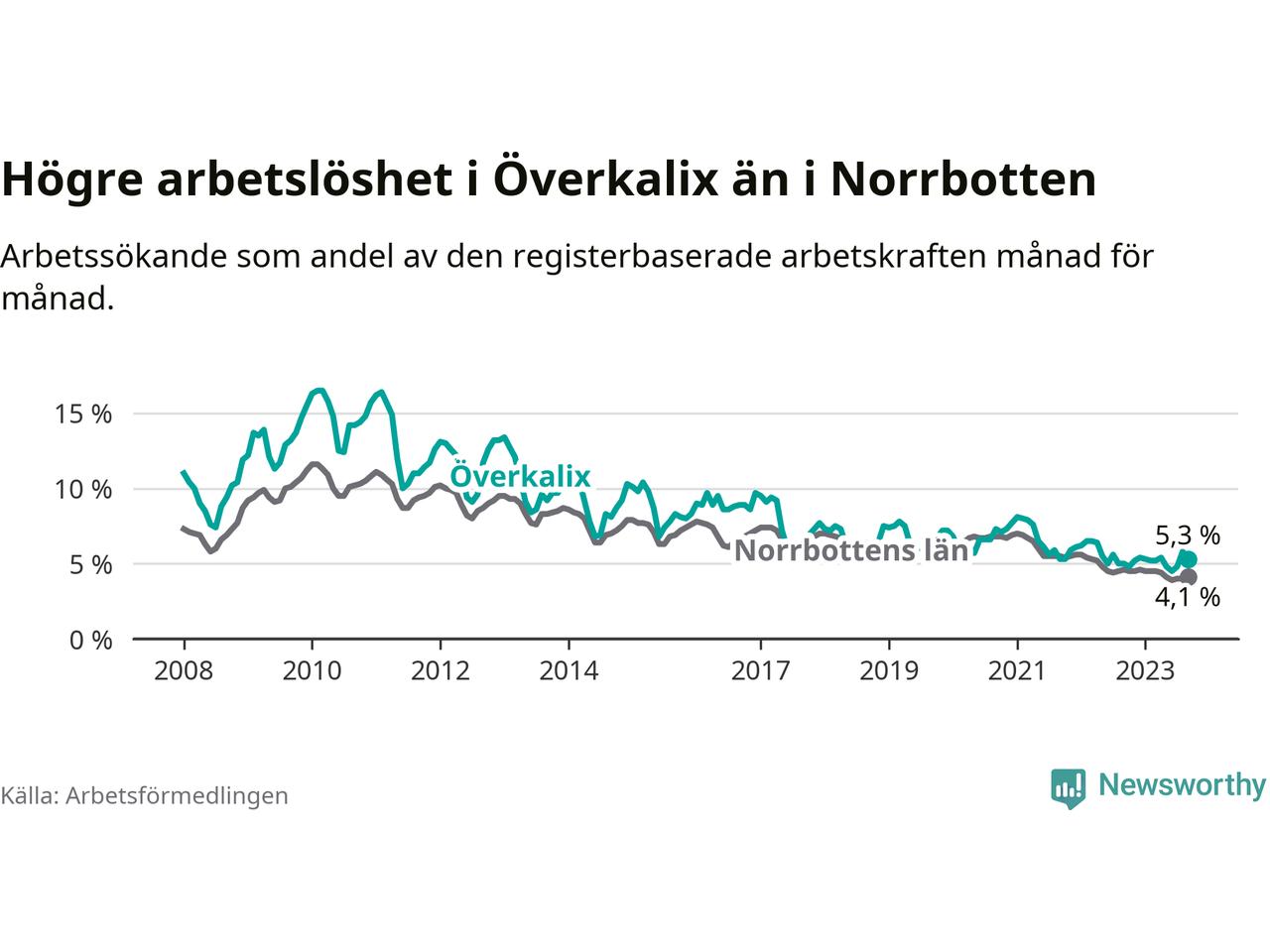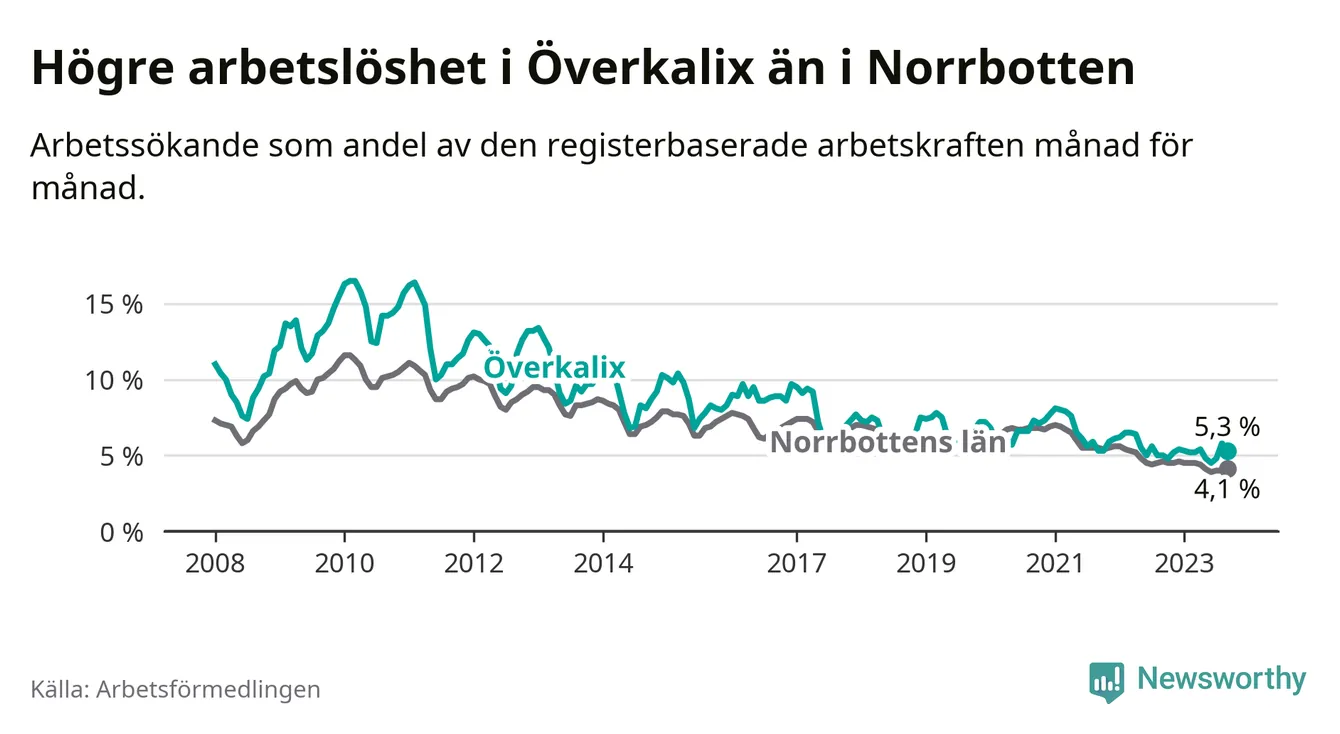 Överkalix hade redan tidigare högre arbetslöshet än snittet i hela Norrbottens län och nu växer klyftan (5,3 procent i kommunen, jämfört med 4,1 procent i hela länet). Kiruna har den lägsta arbetslösheten i länet (2,2 procent), medan Haparanda har den högsta (7,1 procent). För att Överkalix skulle komma ner i samma arbetslöshetsnivå som Kiruna skulle 45 personer behöva sysselsättas.