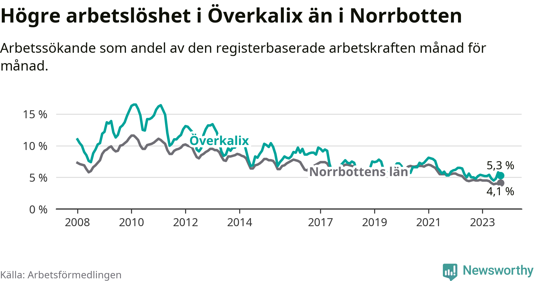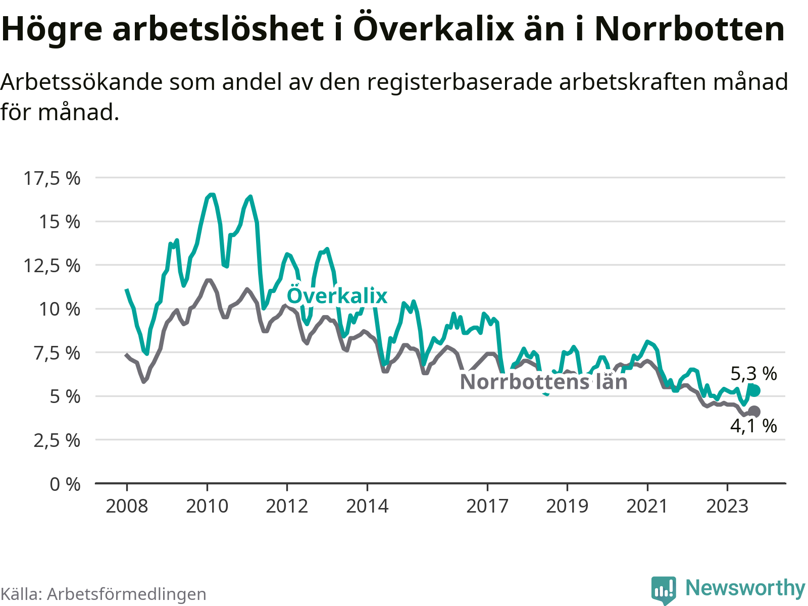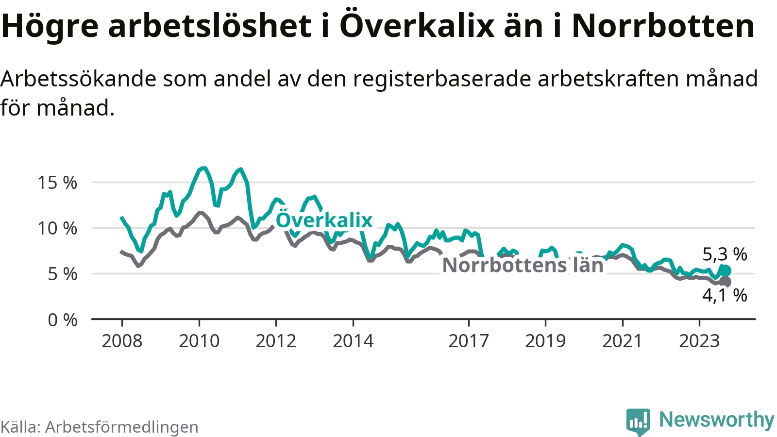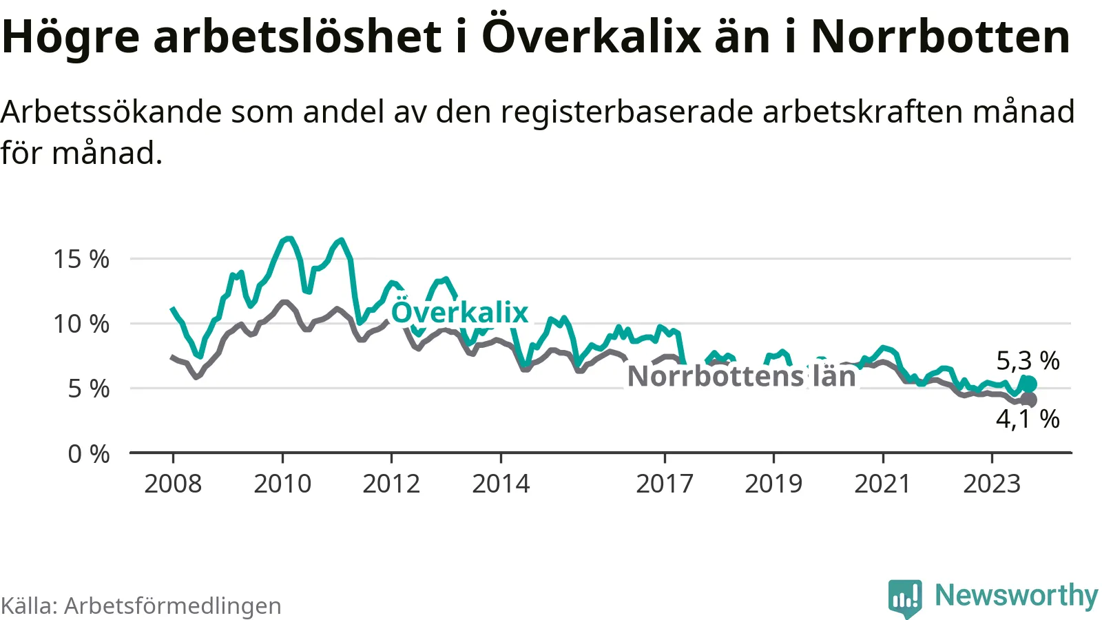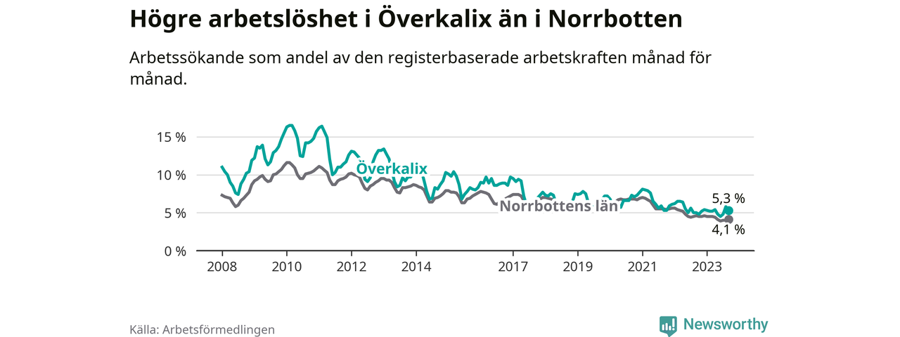 Överkalix hade redan tidigare högre arbetslöshet än snittet i hela Norrbottens län och nu växer klyftan (5,3 procent i kommunen, jämfört med 4,1 procent i hela länet). Kiruna har den lägsta arbetslösheten i länet (2,2 procent), medan Haparanda har den högsta (7,1 procent). För att Överkalix skulle komma ner i samma arbetslöshetsnivå som Kiruna skulle 45 personer behöva sysselsättas.
