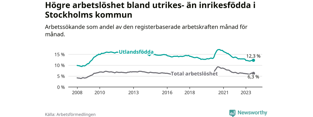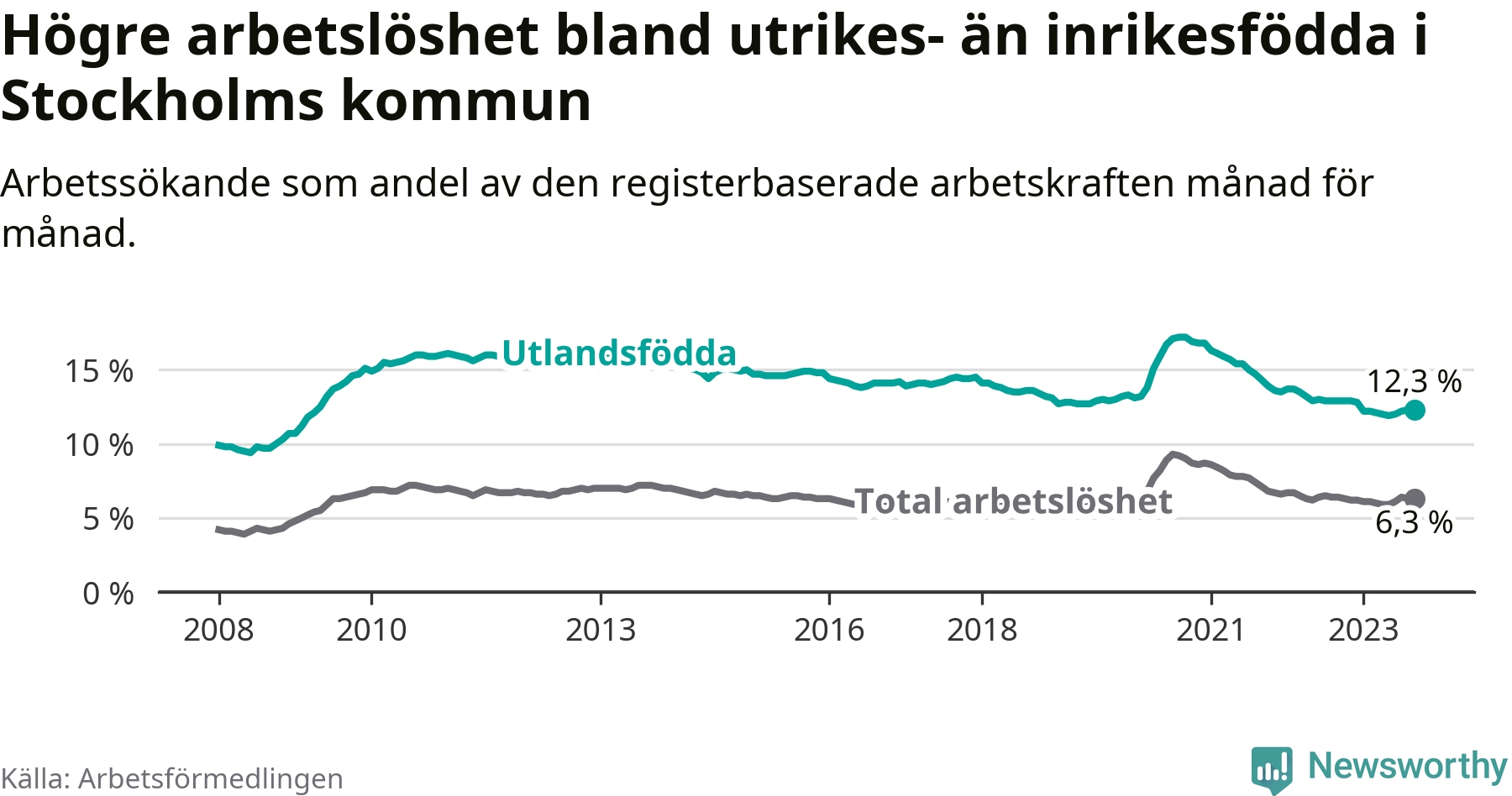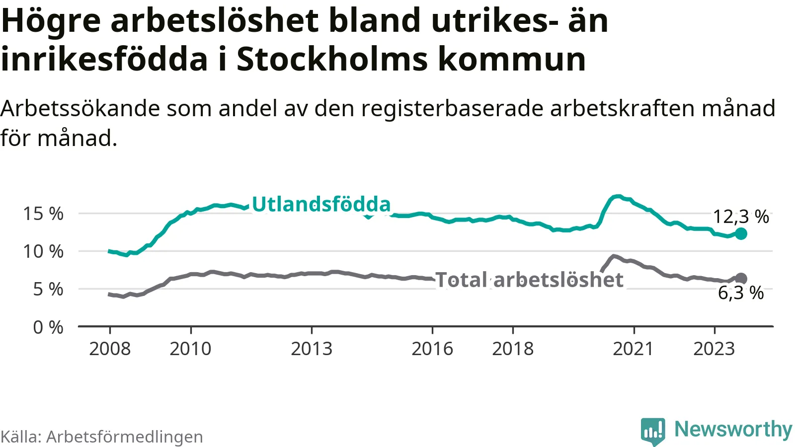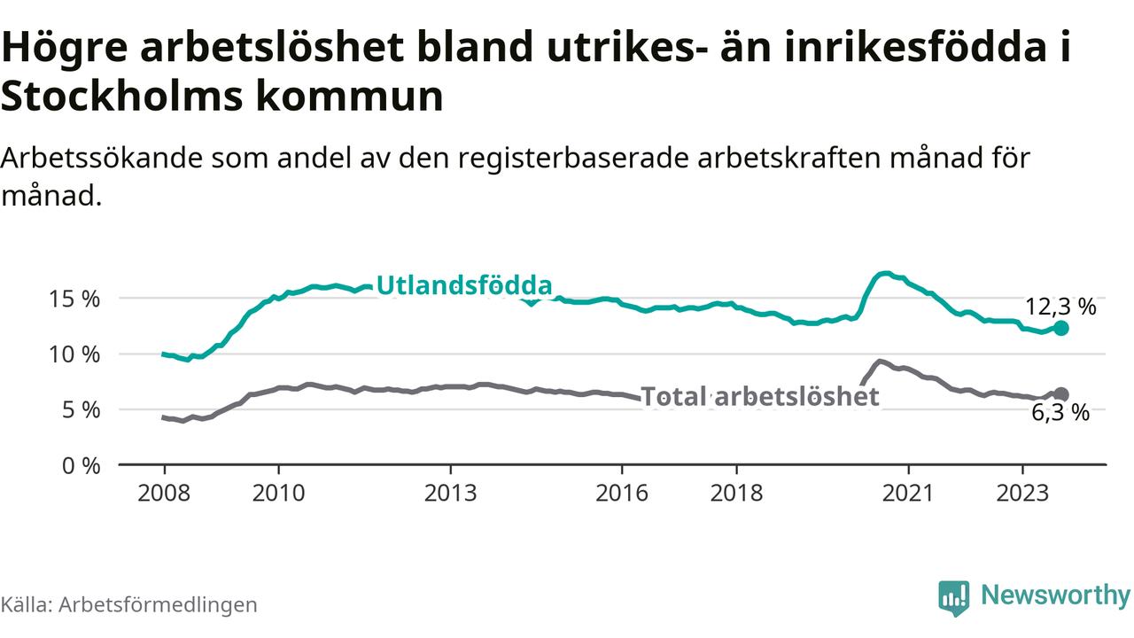 | Bland utlandsfödda | 12,3 % | −0,6 % ▼ | 12,2 % | −0,5 % ▼ | 15,2 % | −1,0 % ▼ |