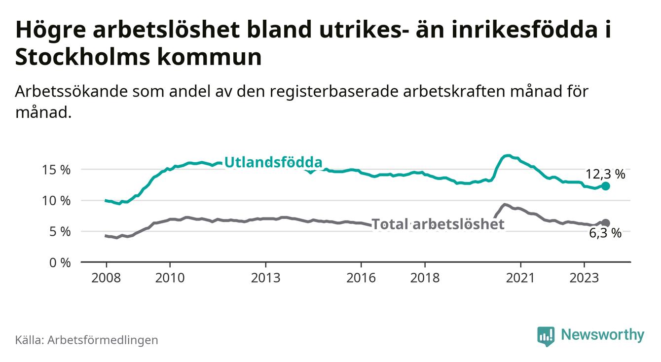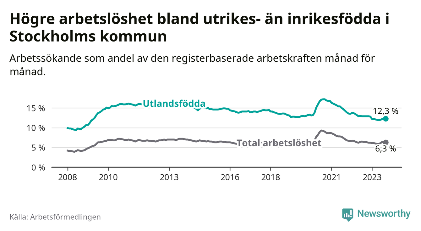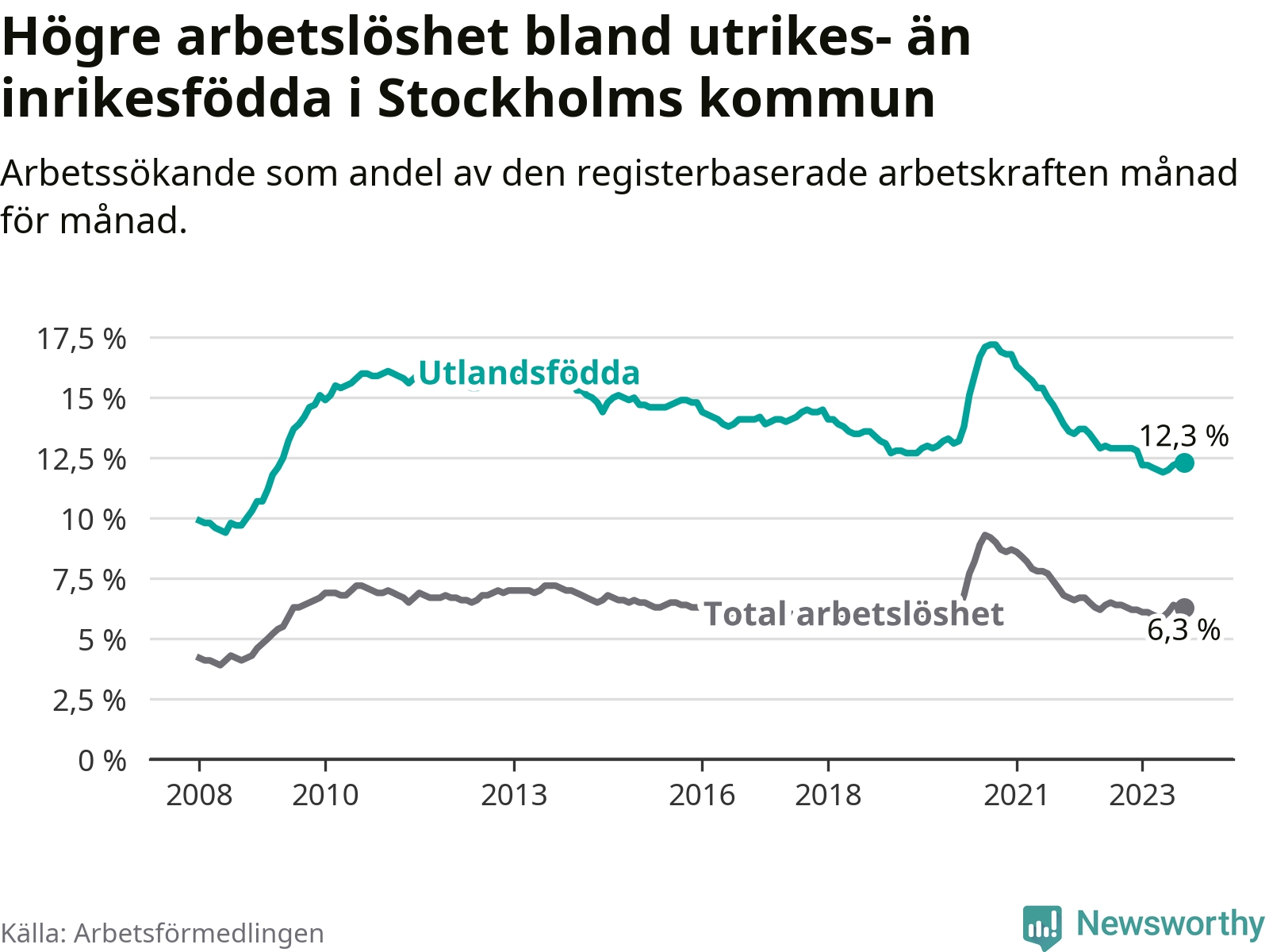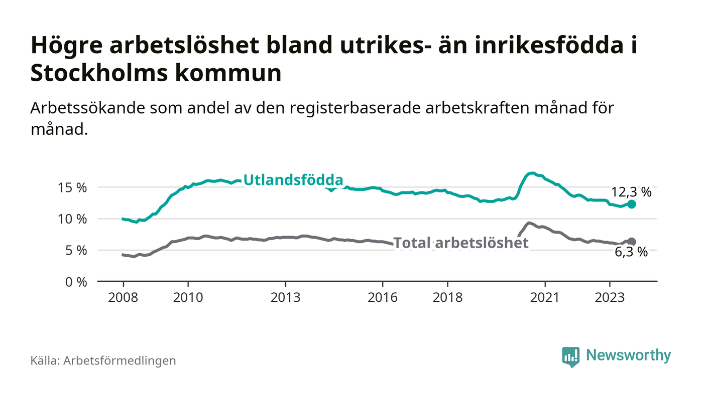 | Bland utlandsfödda | 12,3 % | −0,6 % ▼ | 12,2 % | −0,5 % ▼ | 15,2 % | −1,0 % ▼ |