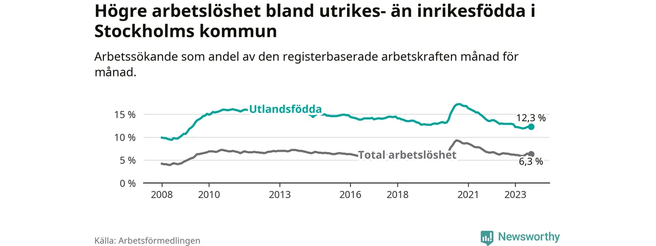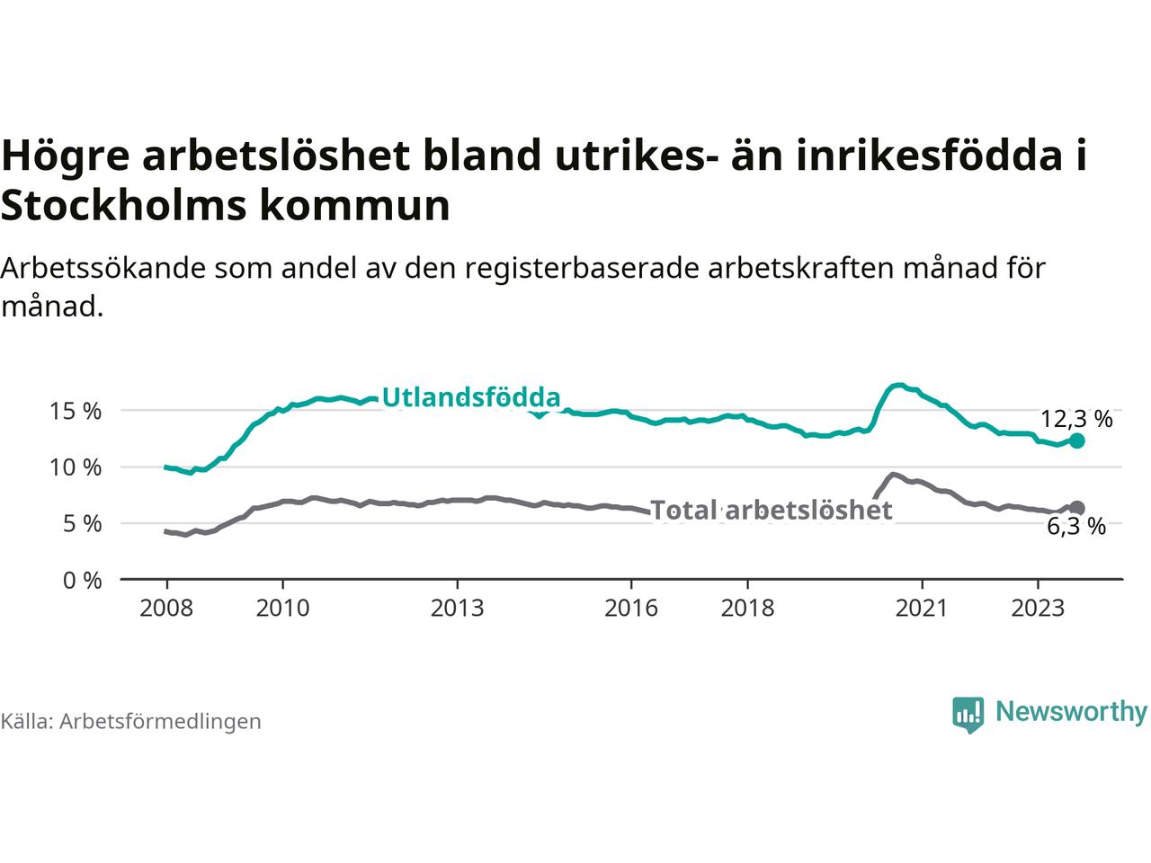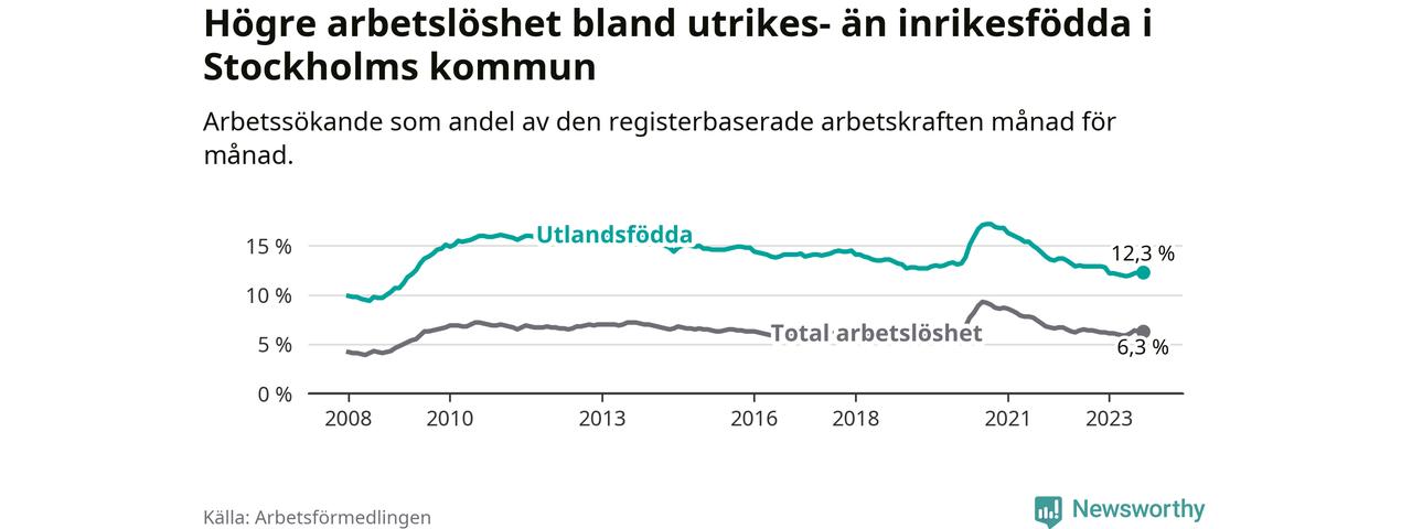 Arbetslösheten bland utlandsfödda var 12,3 procent i Stockholm under september månad, motsvarande 19 484 av 158 407 personer. Det är 0,6 procentenheter färre än vid samma tidpunkt i fjol (+108 om man räknar personer). Därmed har de utlandsföddas arbetslöshet varit lägre än vid samma tidpunkt i fjol i över två år i sträck. Sedan april 2021 har arbetslösheten bland utlandsfödda minskat från 15,7 till 12,3 procent.