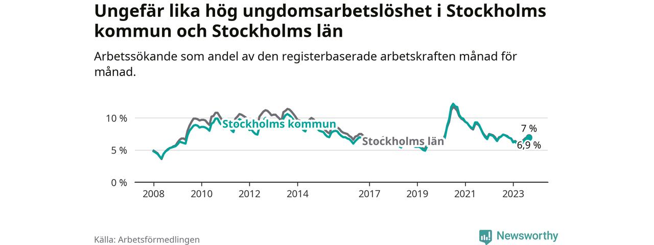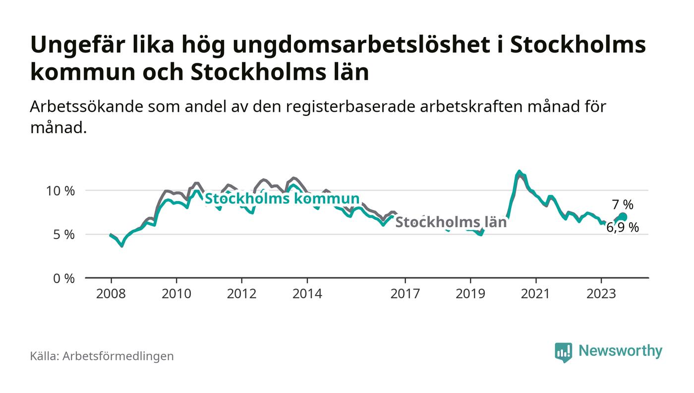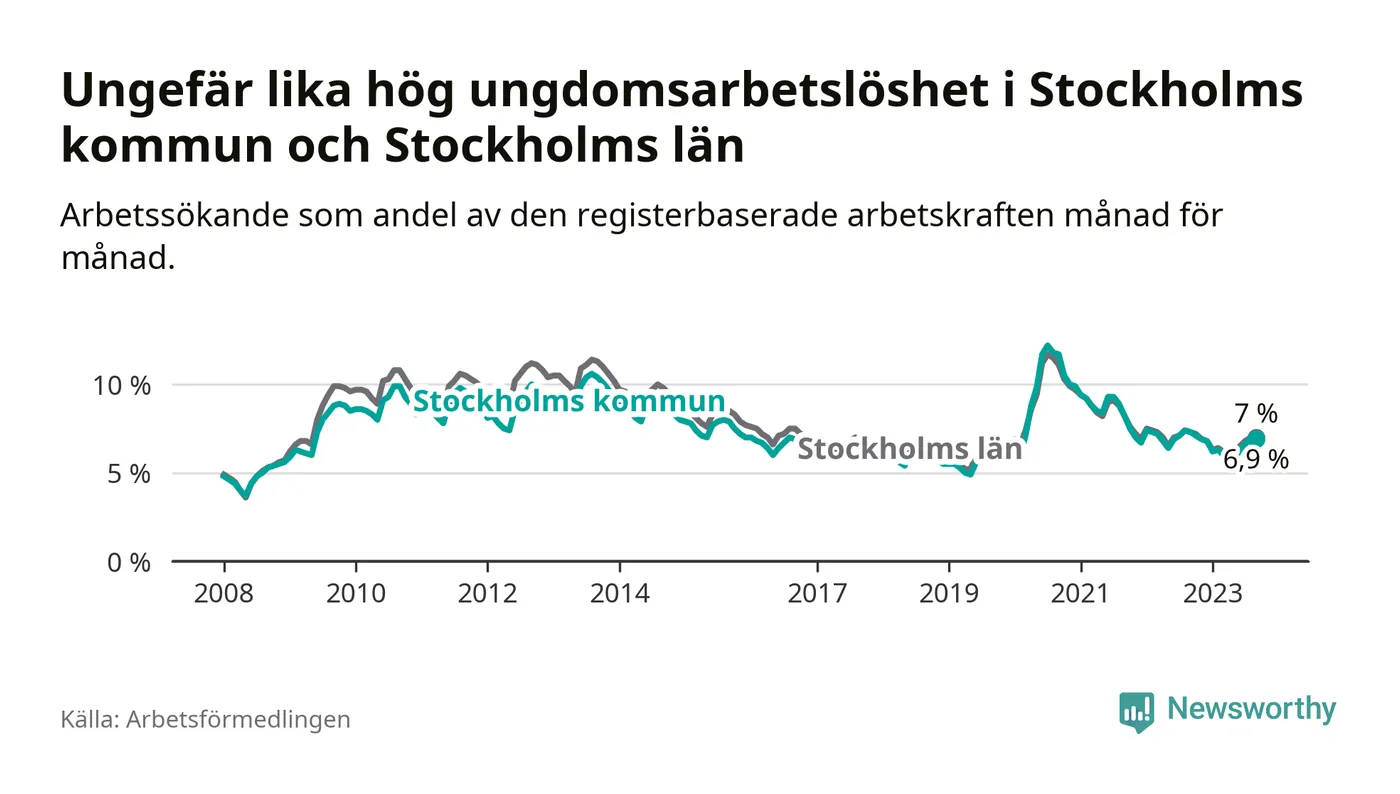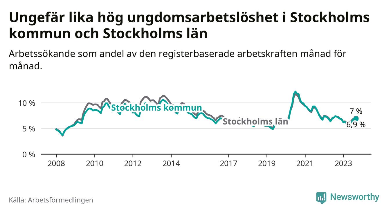 Precis som den totala arbetslösheten ligger ungdomsarbetslösheten i Stockholm på i stort sett samma nivå som i Stockholms län som helhet.