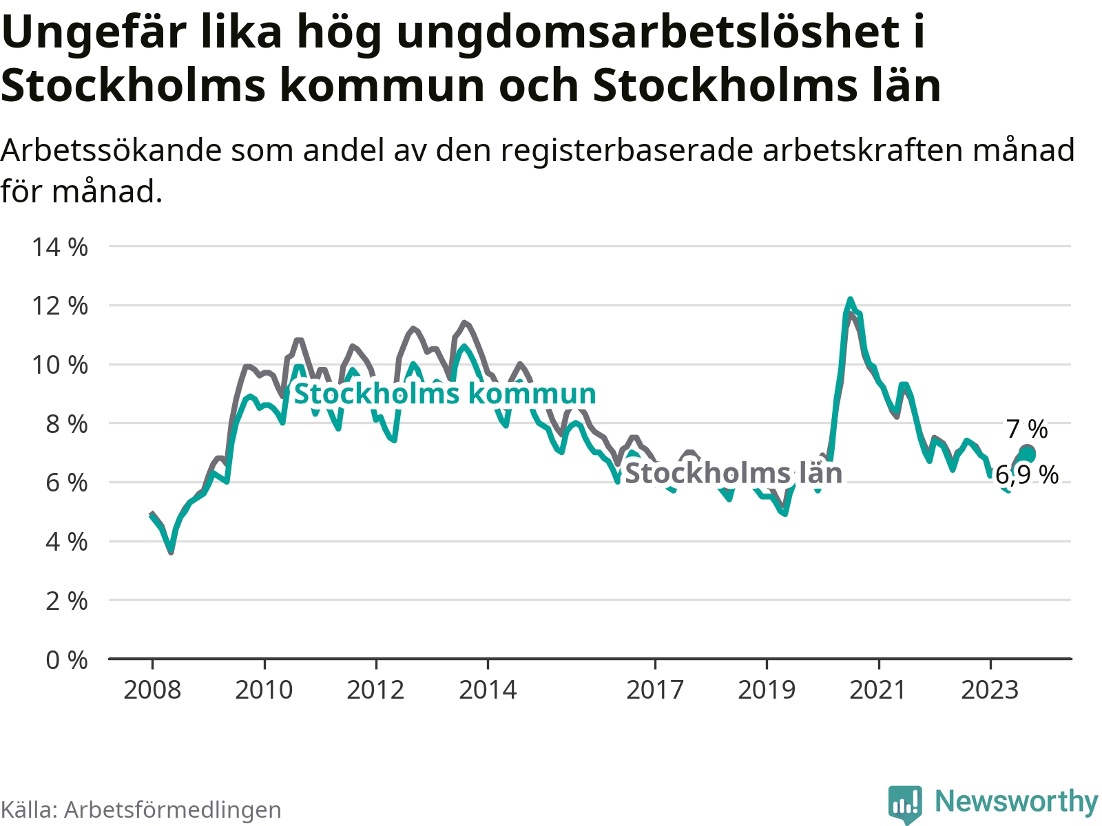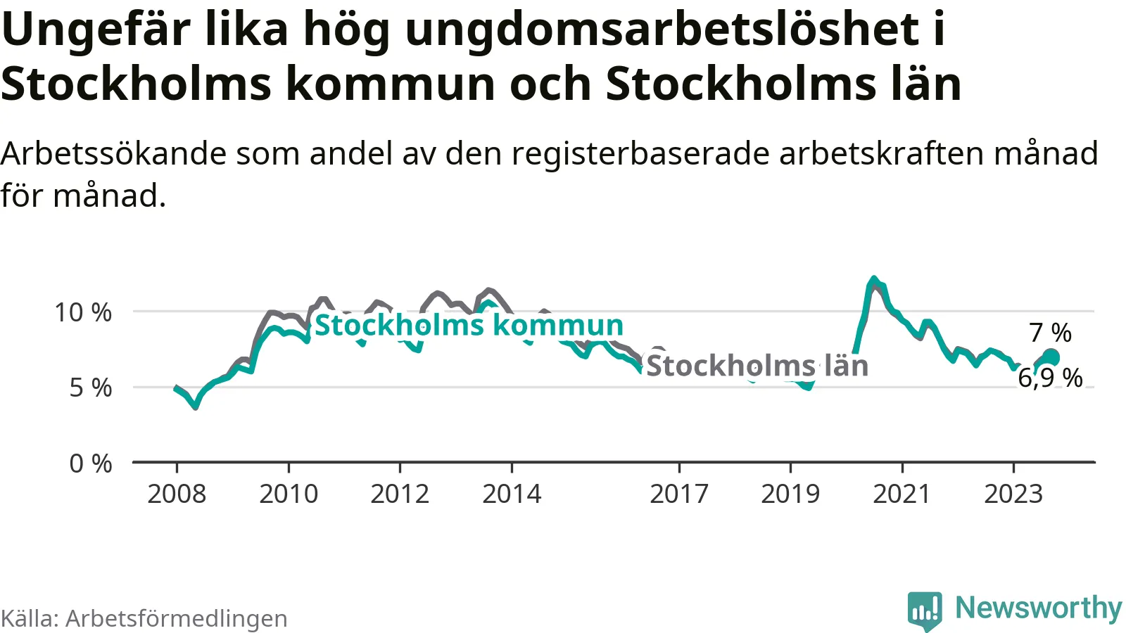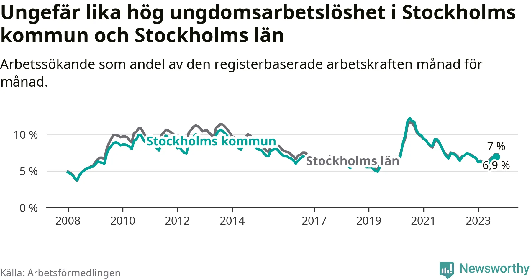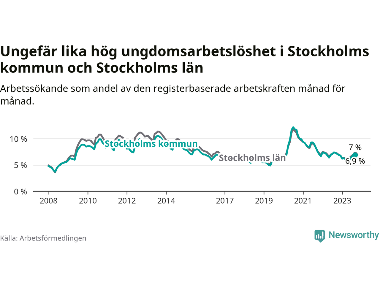Precis som den totala arbetslösheten ligger ungdomsarbetslösheten i Stockholm på i stort sett samma nivå som i Stockholms län som helhet.