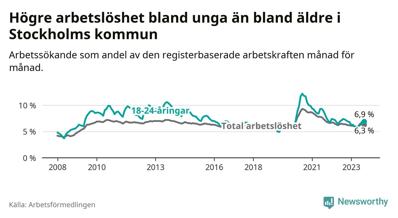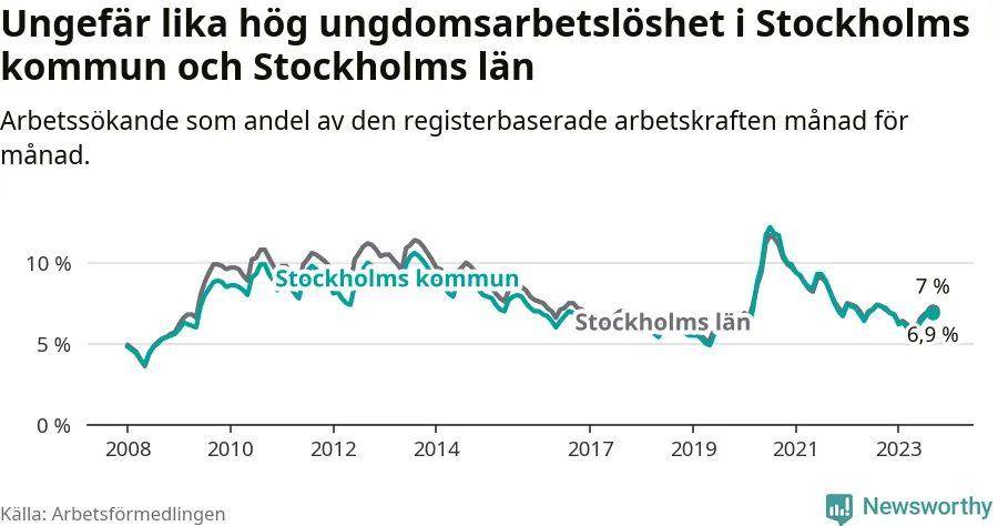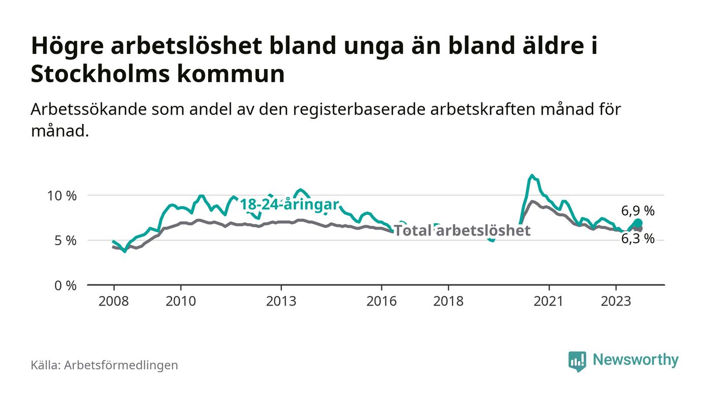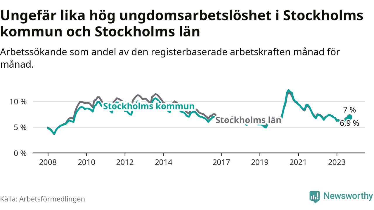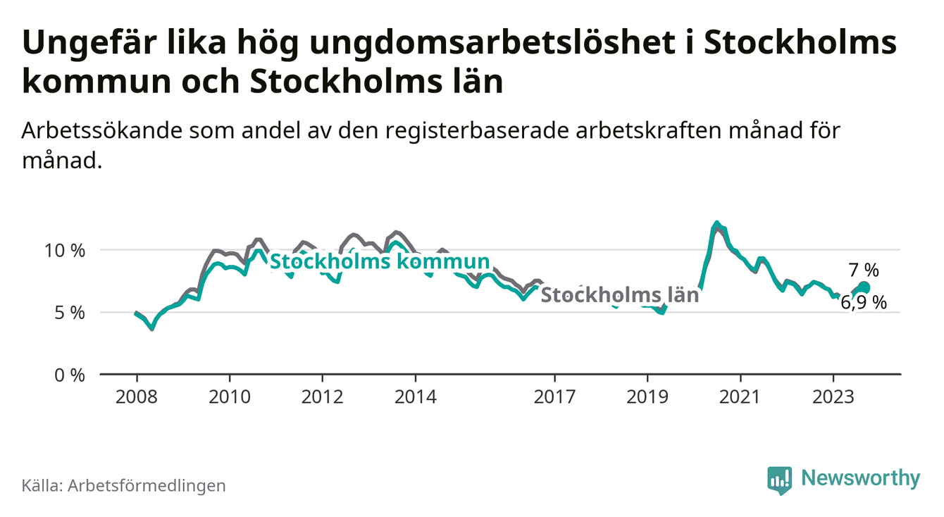Precis som den totala arbetslösheten ligger ungdomsarbetslösheten i Stockholm på i stort sett samma nivå som i Stockholms län som helhet.