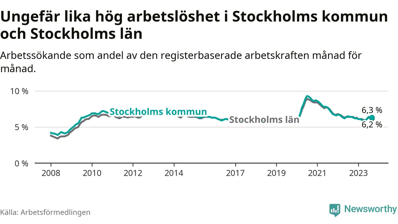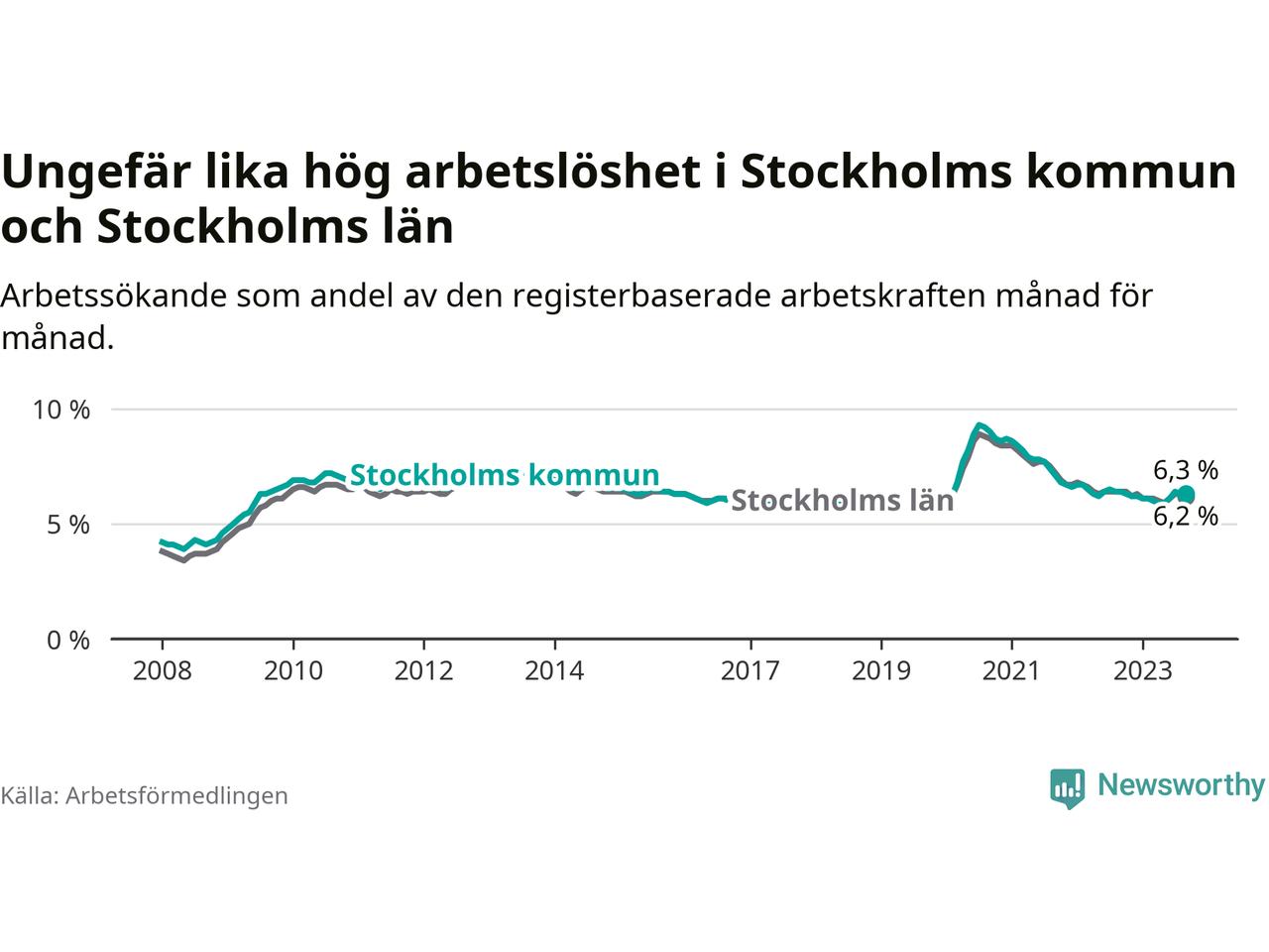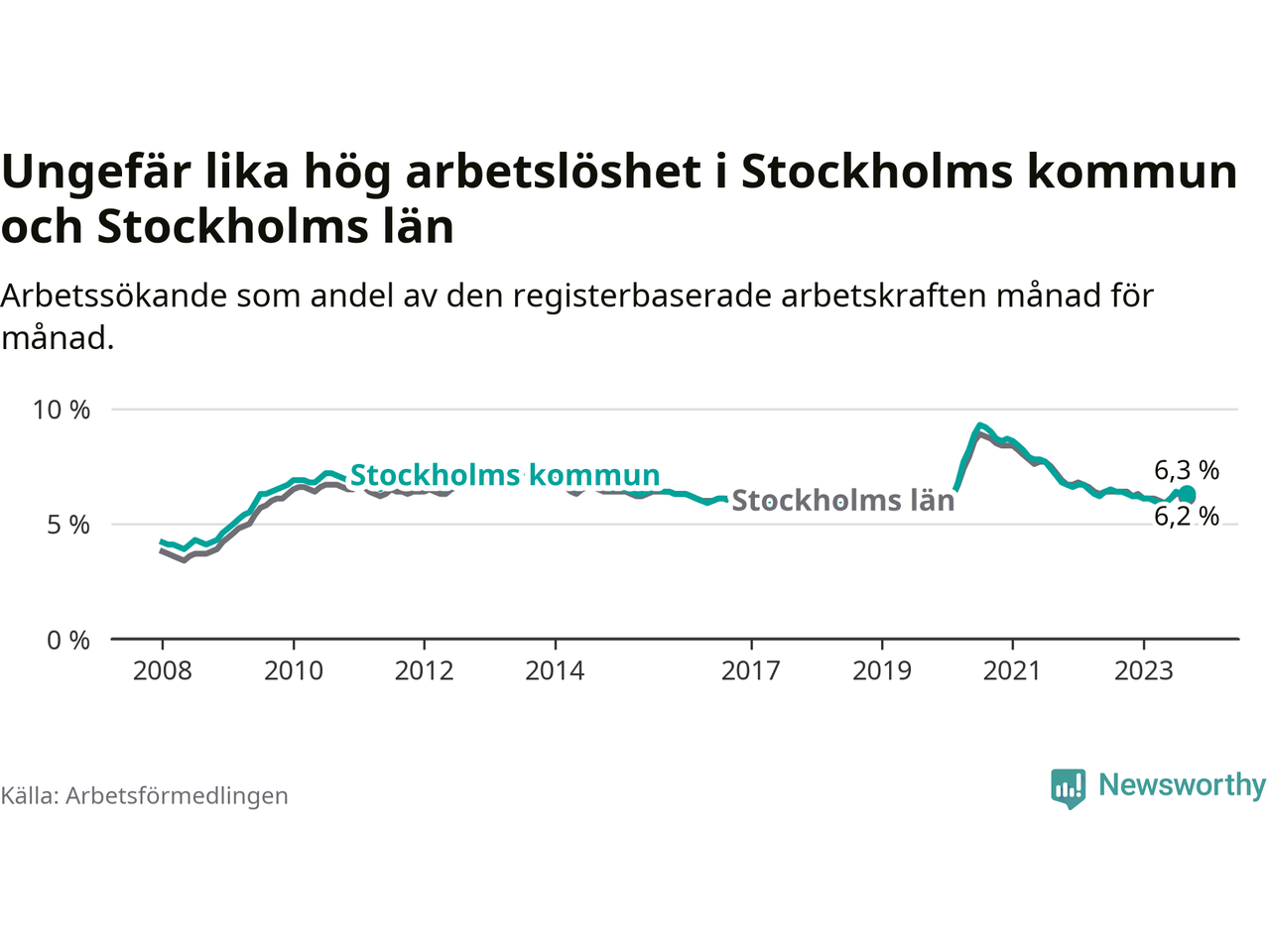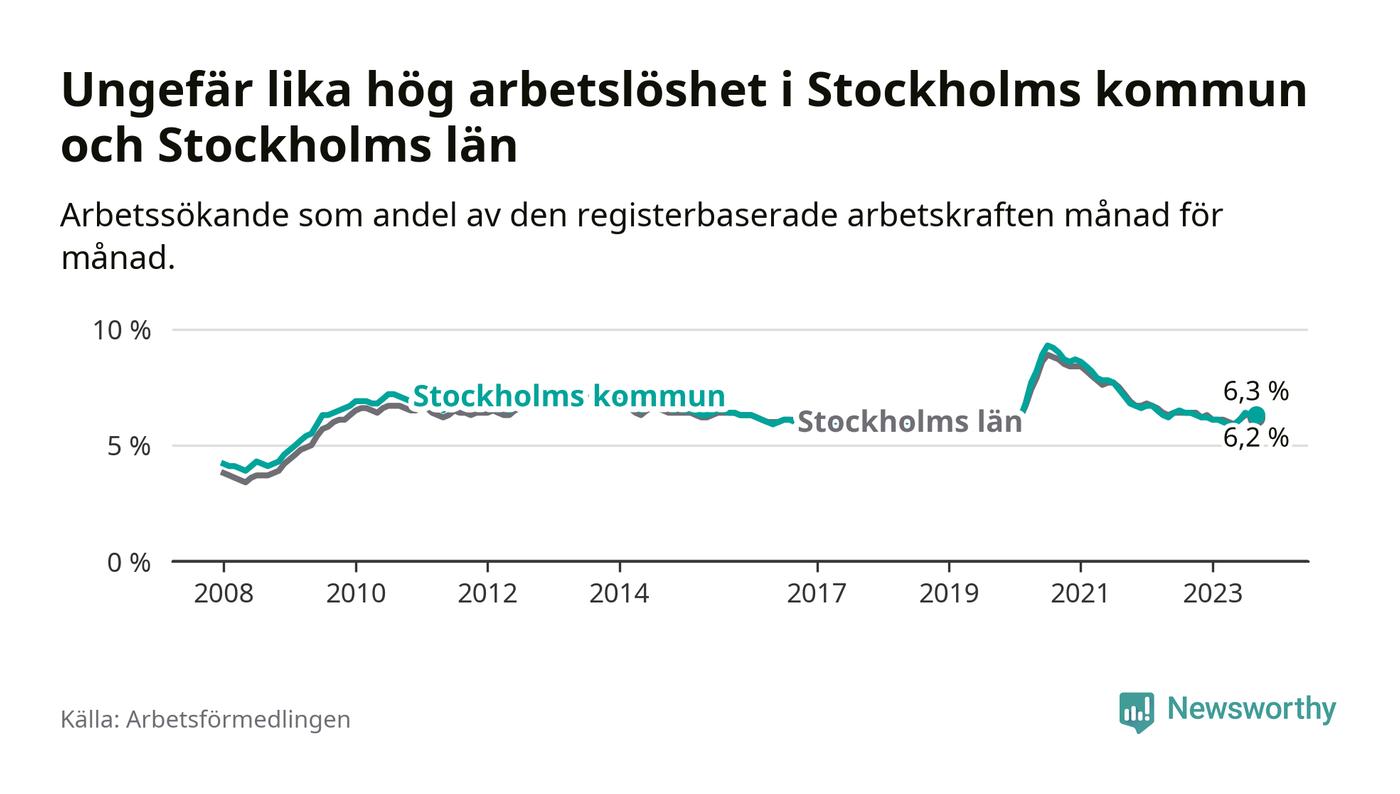 Under september månad rapporterade Stockholms kommun en total arbetslöshet på 6,3 procent. Det är en minskning jämfört med samma tidpunkt i fjol (−0,1 procentenheter). Även i Stockholms län sjunker arbetslösheten .
