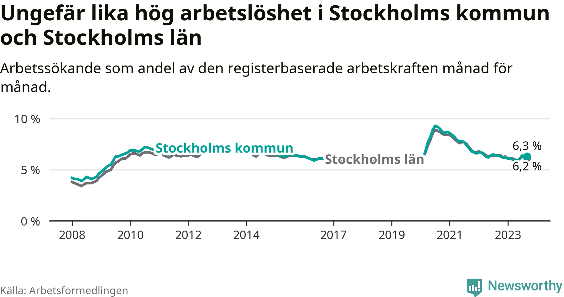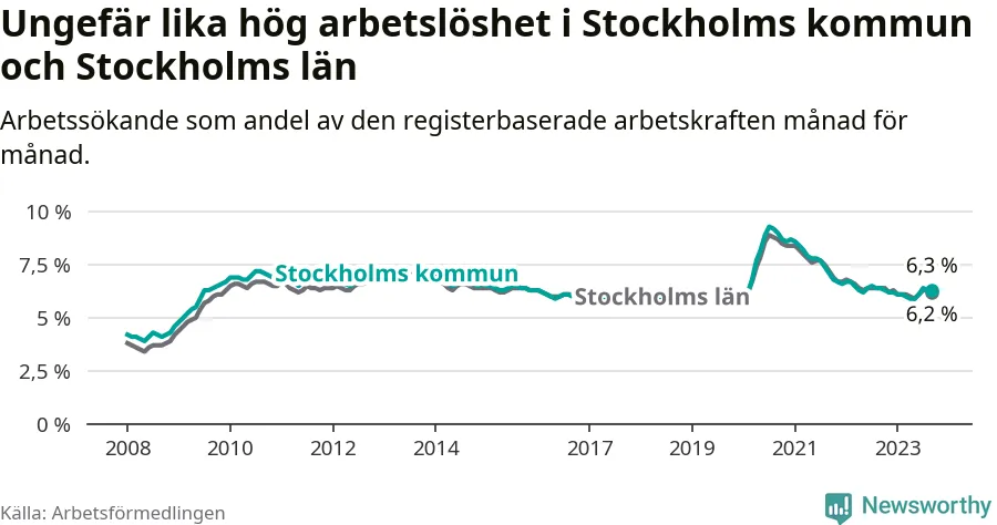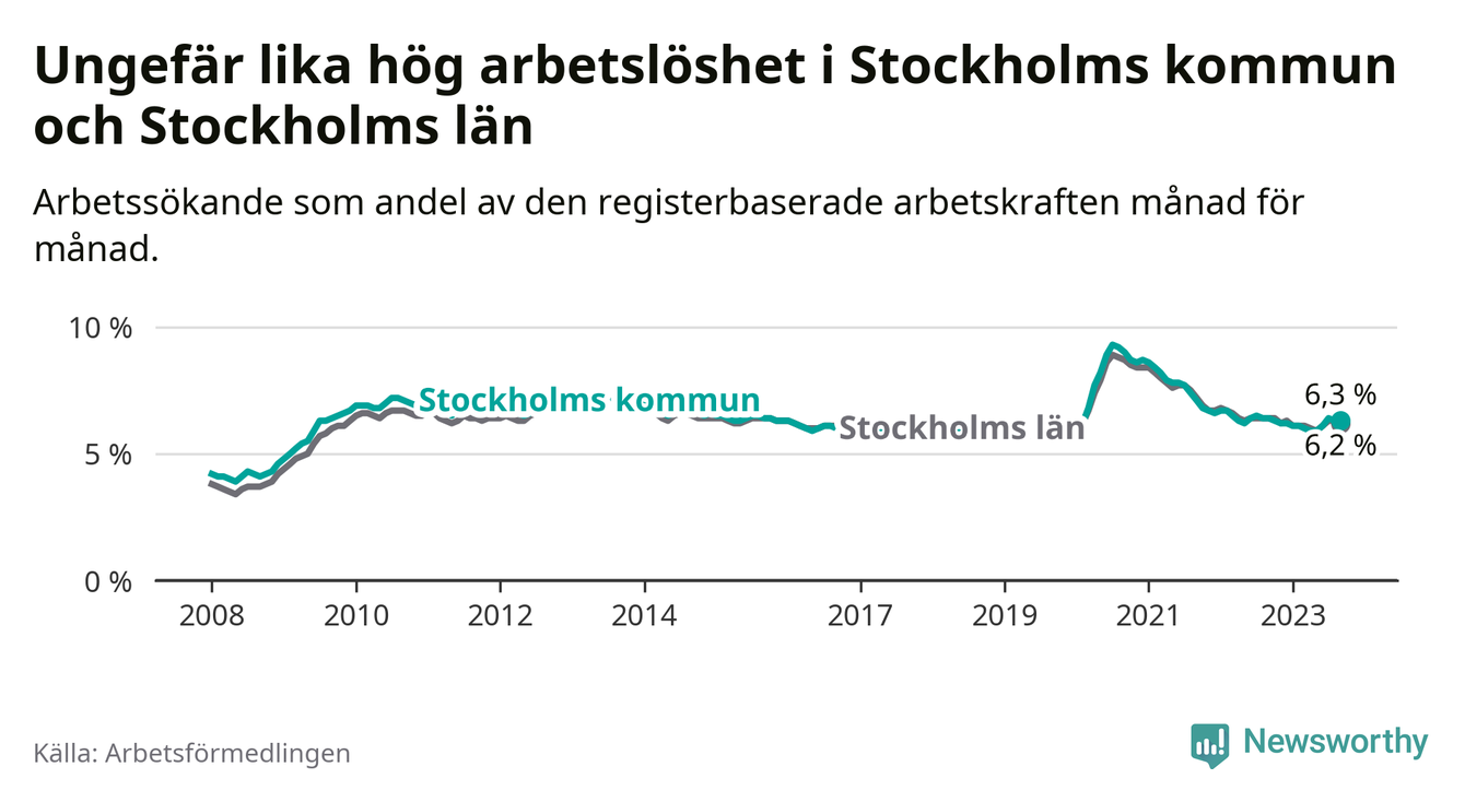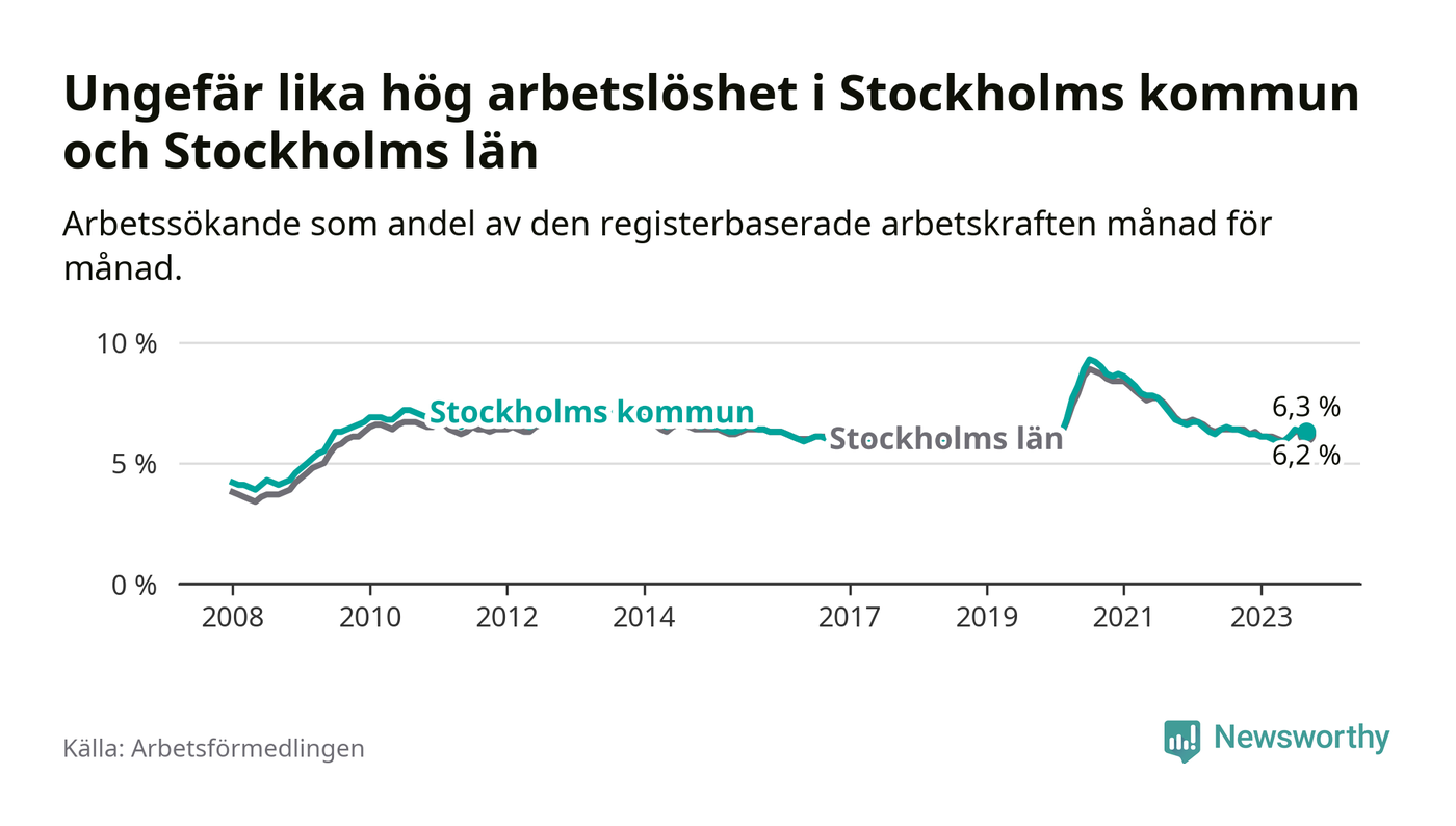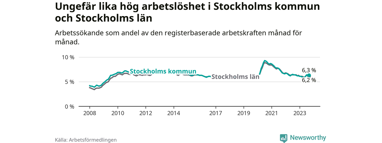 Under september månad rapporterade Stockholms kommun en total arbetslöshet på 6,3 procent. Det är en minskning jämfört med samma tidpunkt i fjol (−0,1 procentenheter). Även i Stockholms län sjunker arbetslösheten .