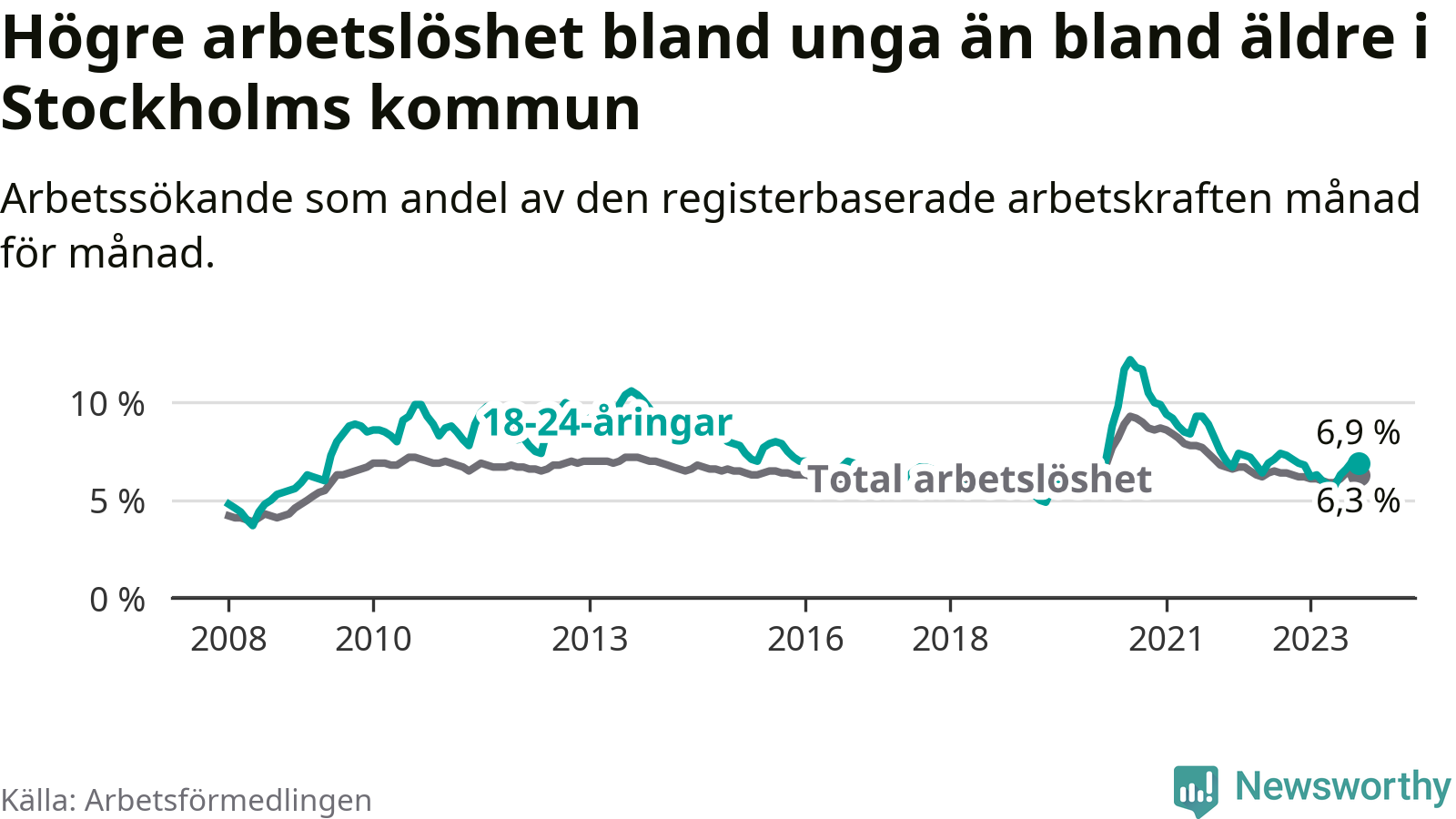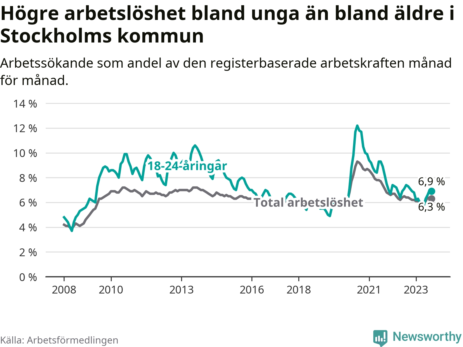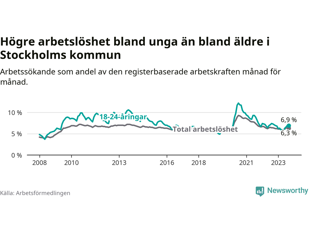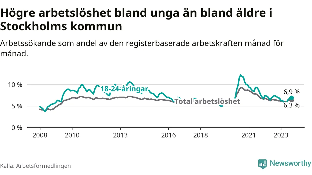I och med den senaste månadens nedgång har de ungas arbetslöshet i Stockholm sjunkit nio månader i följd (ner från 6,8 procent i december 2022 till 6,9 procent nu).