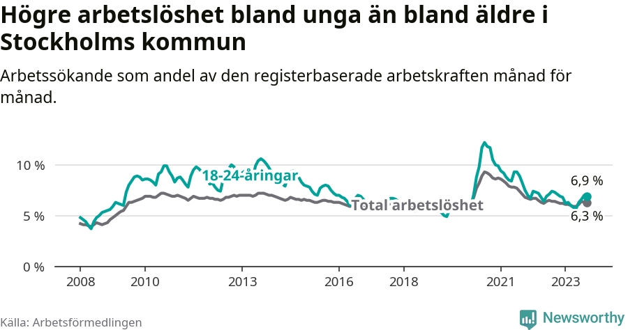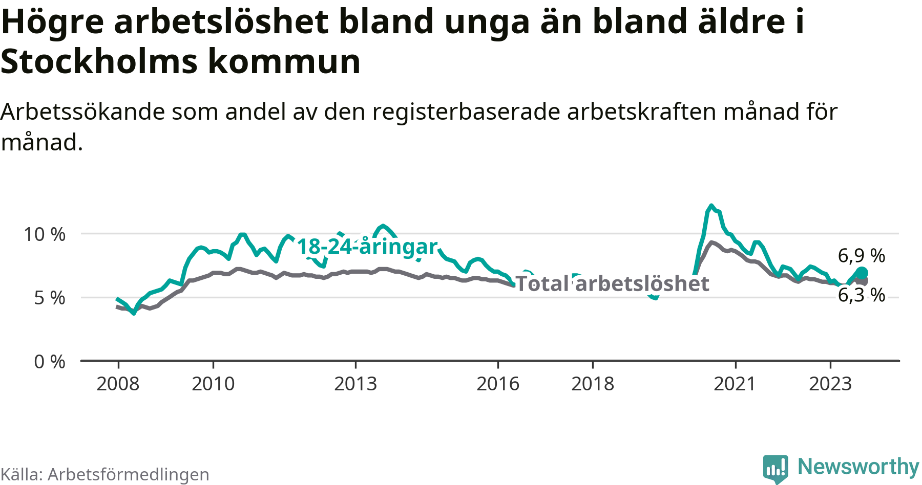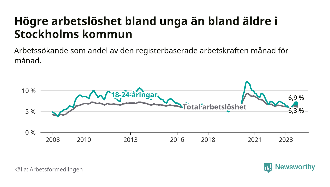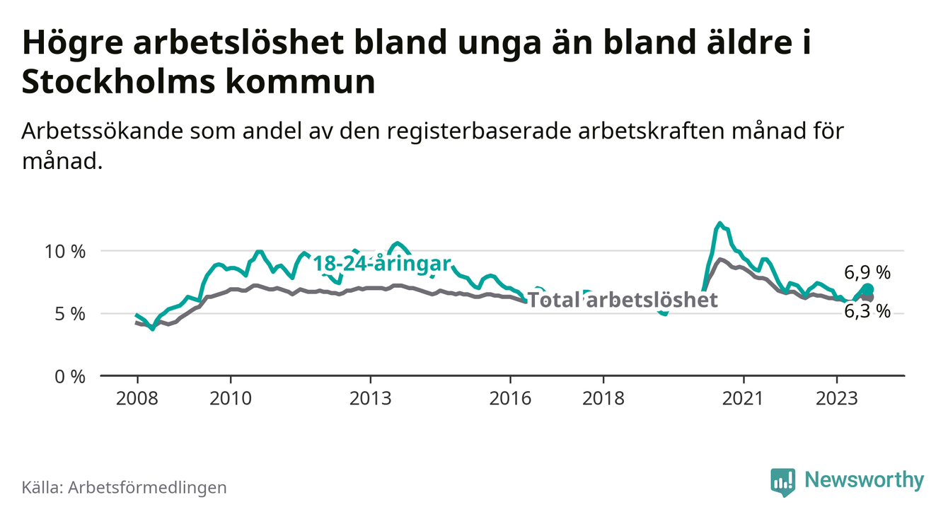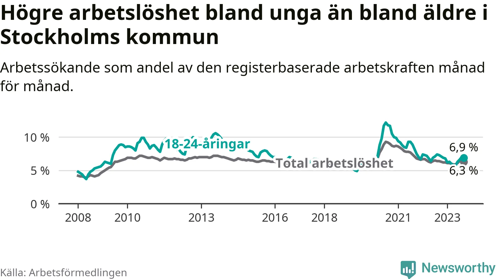 I och med den senaste månadens nedgång har de ungas arbetslöshet i Stockholm sjunkit nio månader i följd (ner från 6,8 procent i december 2022 till 6,9 procent nu).