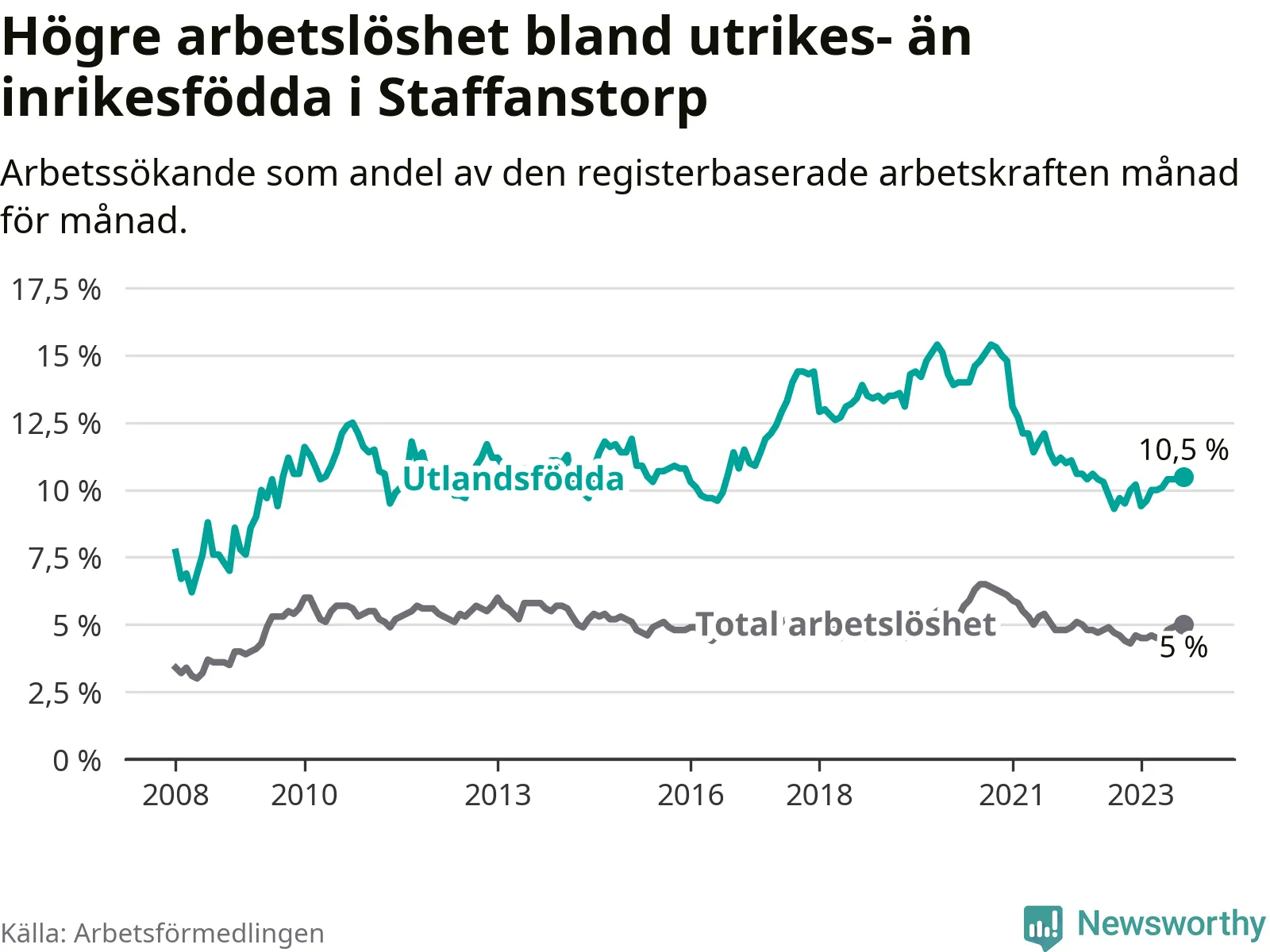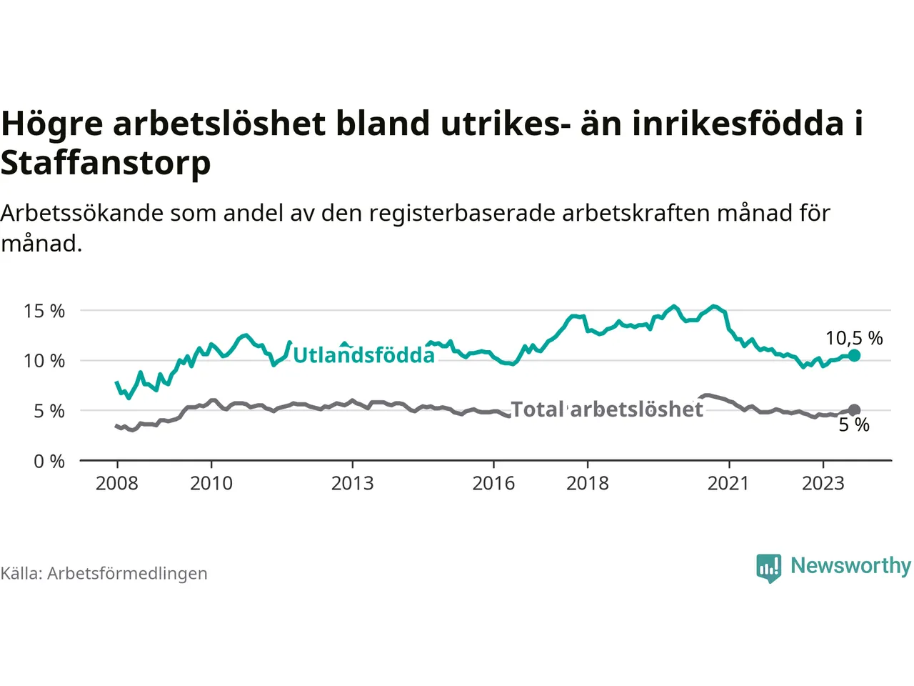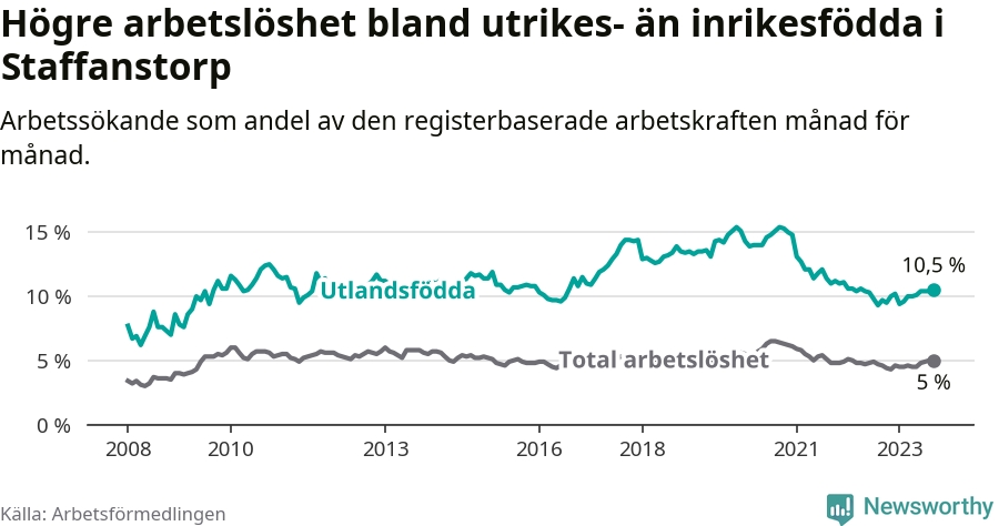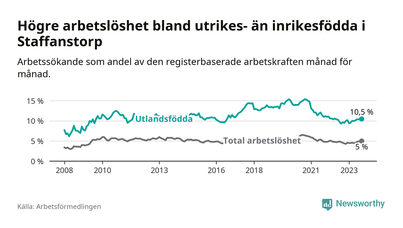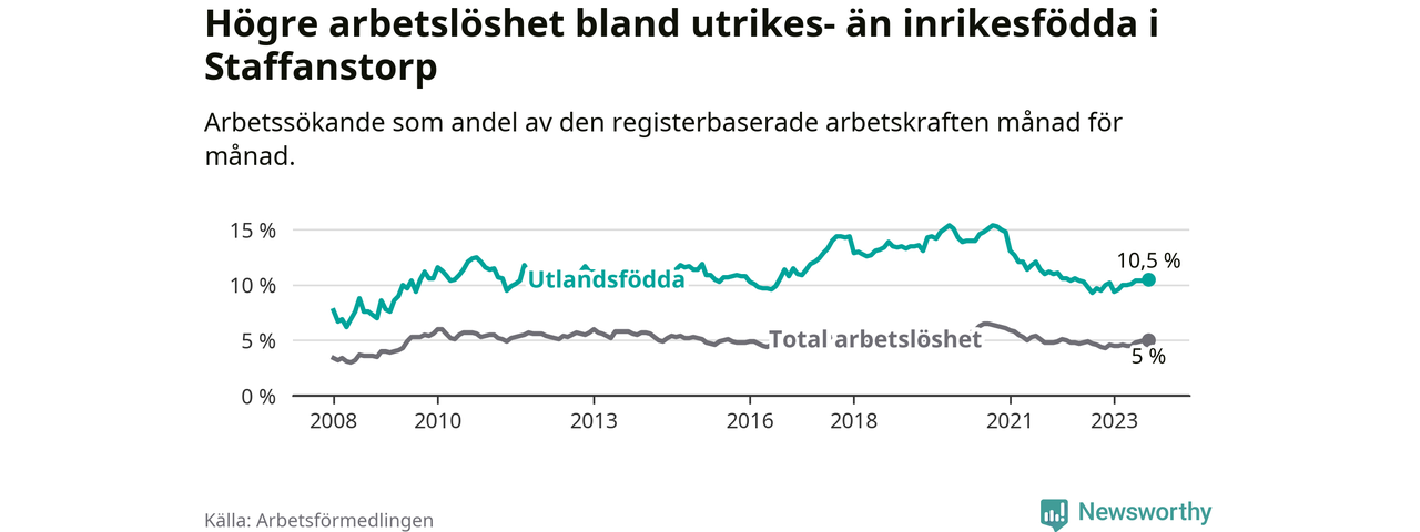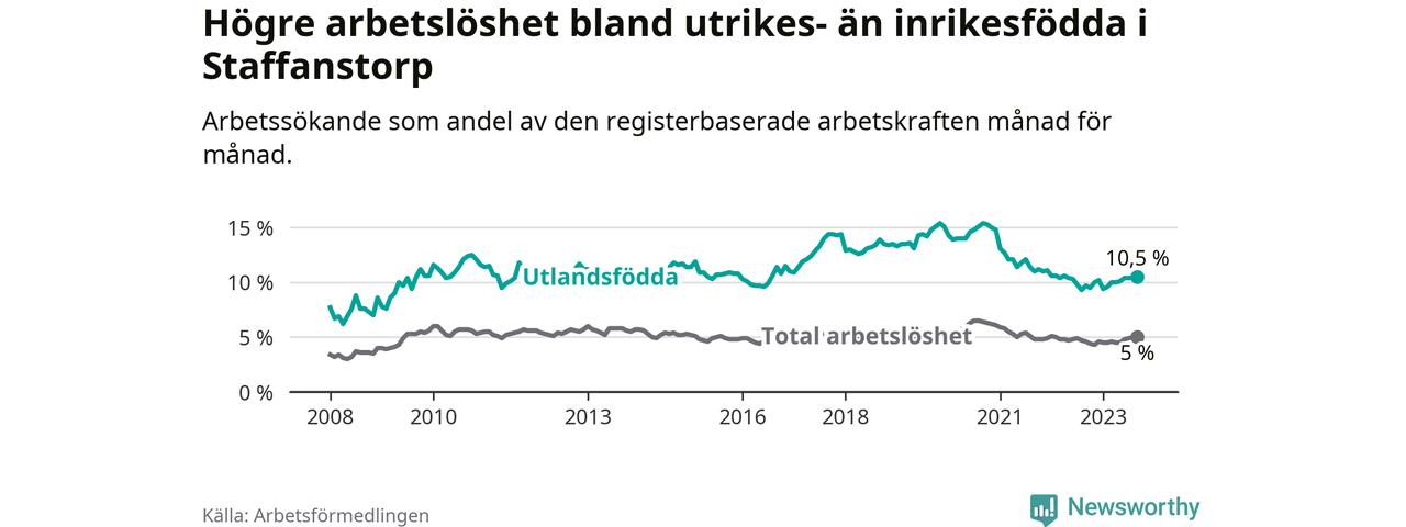 Arbetslösheten bland utlandsfödda var 10,5 procent i Staffanstorp under september månad, motsvarande 256 av 2 438 personer. Det är 0,8 procentenheter fler än vid samma tidpunkt i fjol (+40 om man räknar personer).