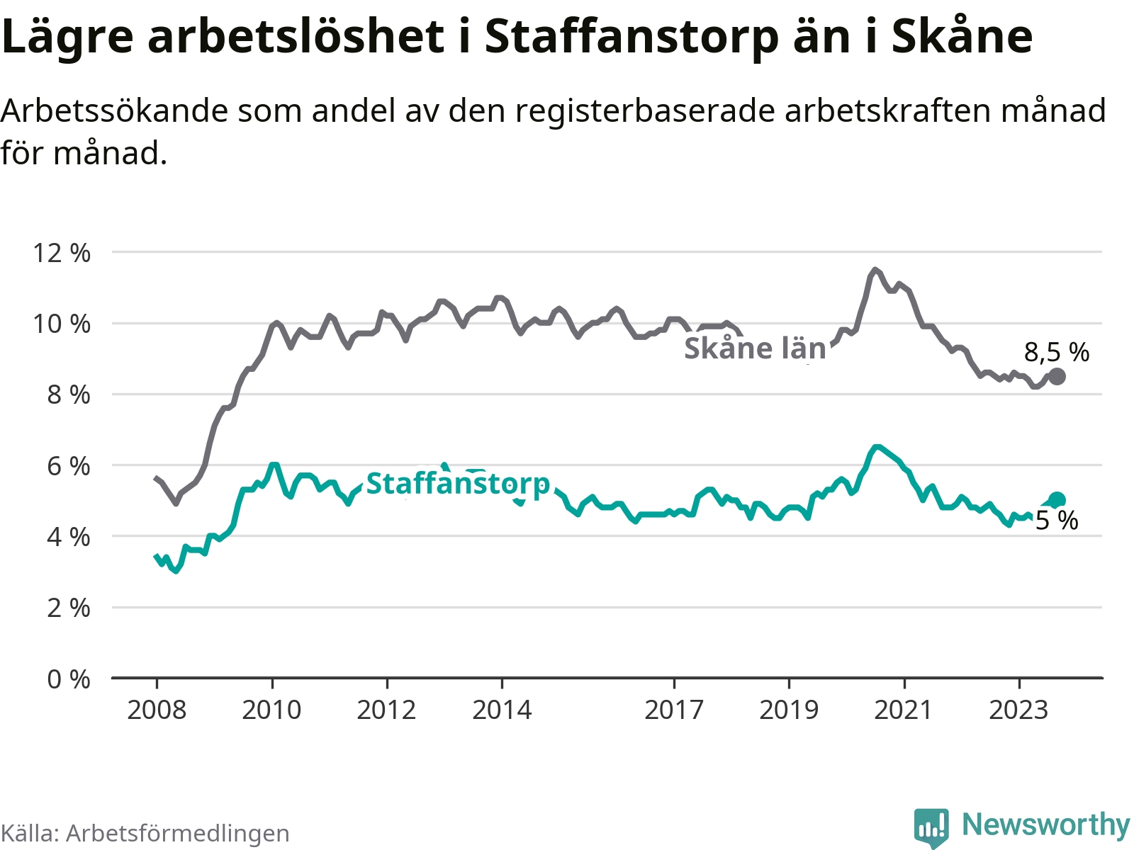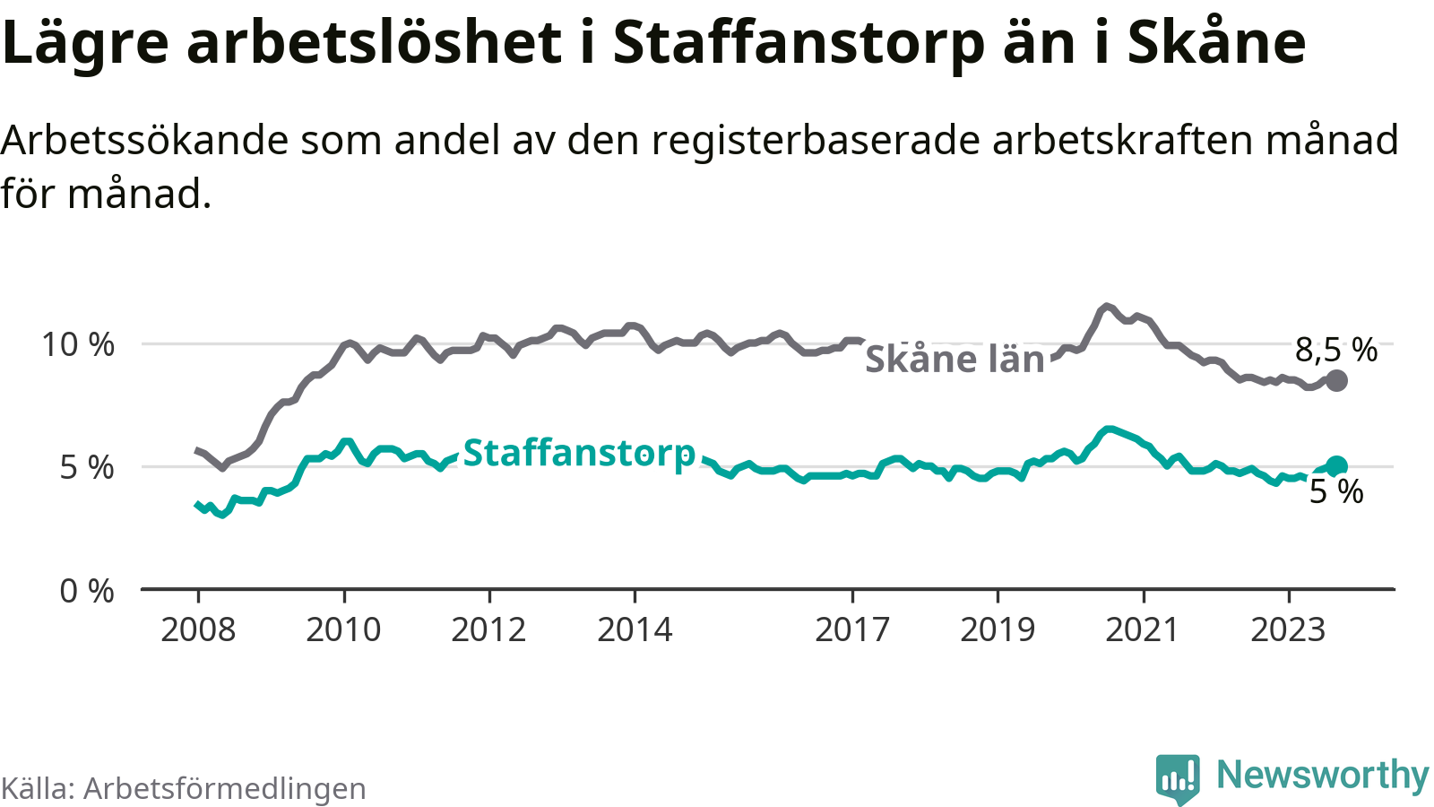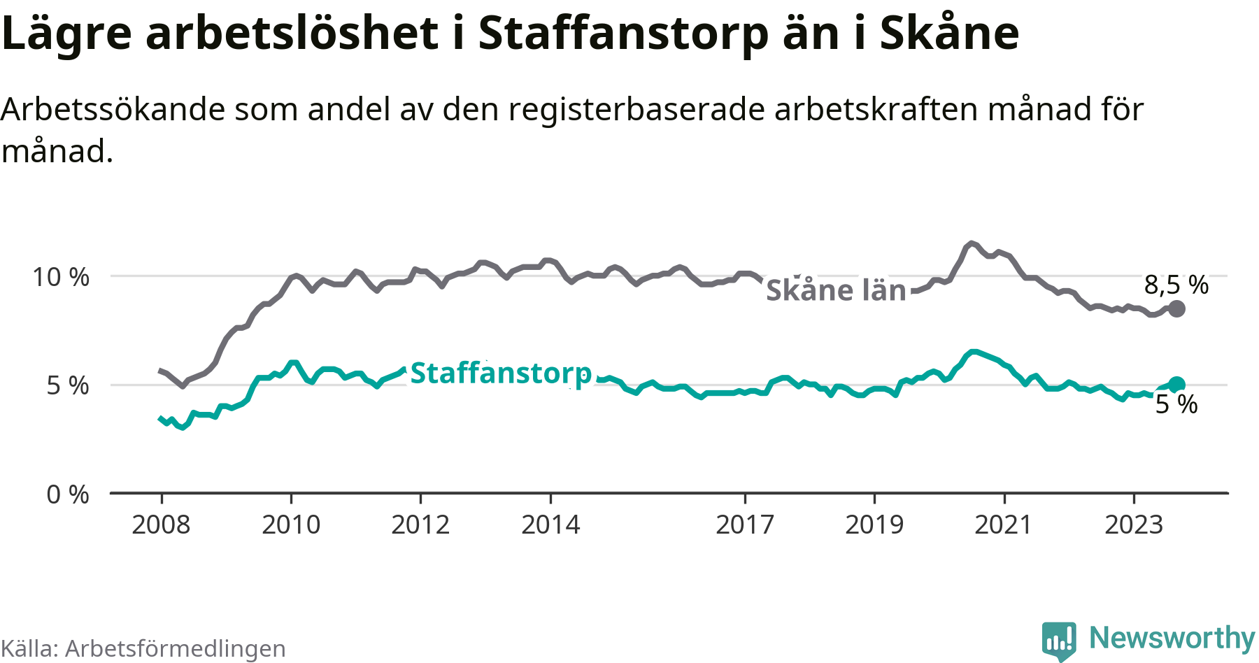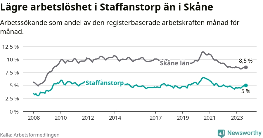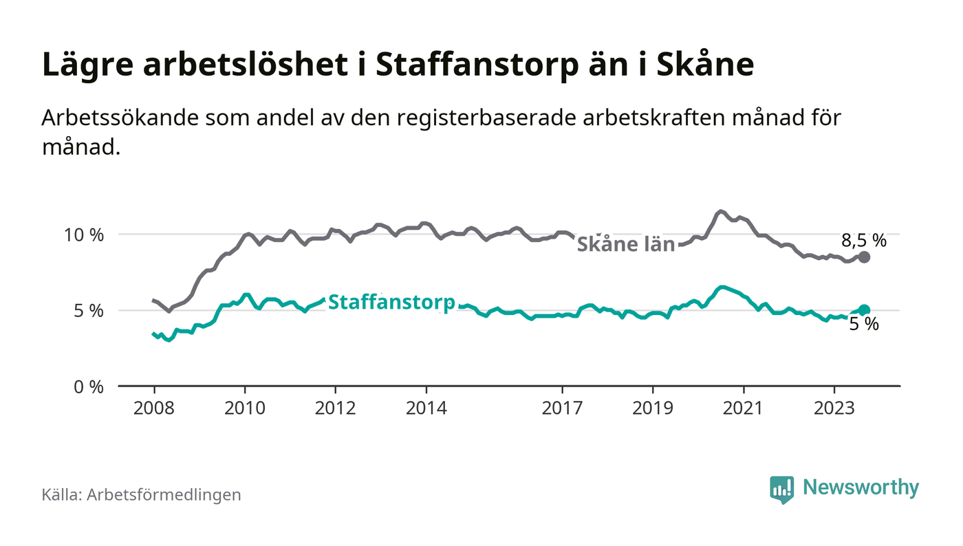 Även om arbetslösheten i Staffanstorp alltså ökar, så ligger den fortfarande under snittet i hela Skåne län (5,0 procent i kommunen, jämfört med 8,5 procent i hela länet). Vellinge har den lägsta arbetslösheten i länet (3,3 procent), medan Malmö har den högsta (12,2 procent). För att Staffanstorp skulle komma ner i samma arbetslöshetsnivå som Vellinge skulle 220 personer behöva sysselsättas.