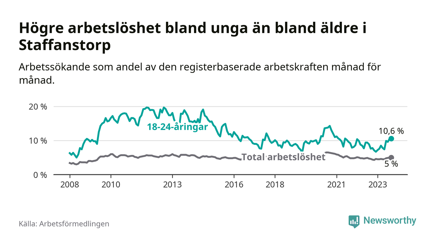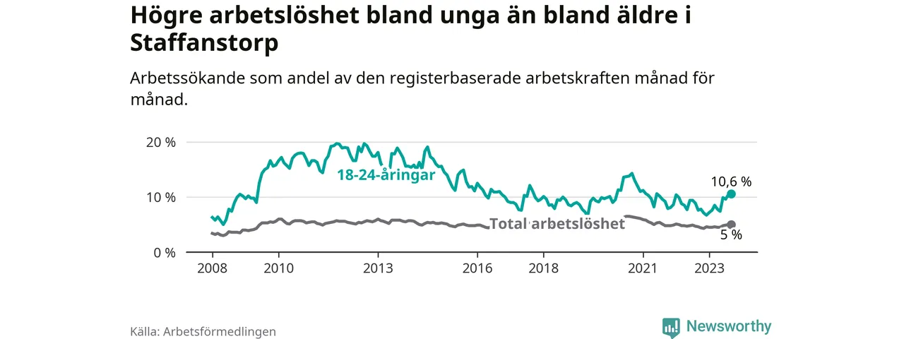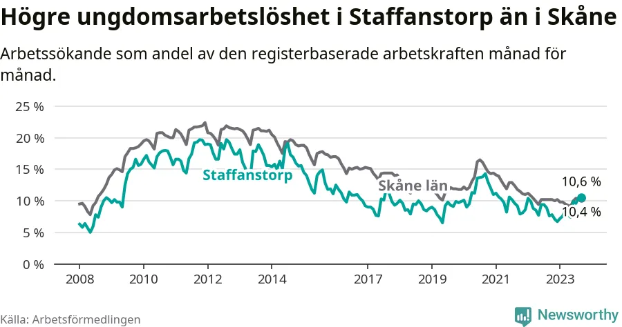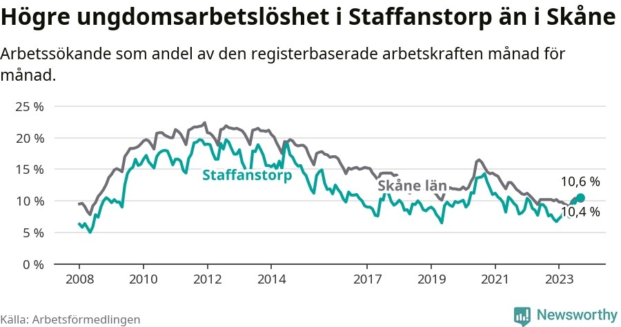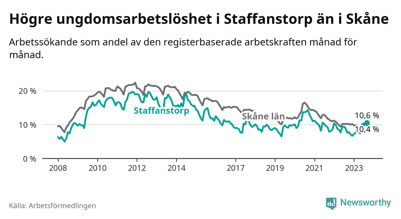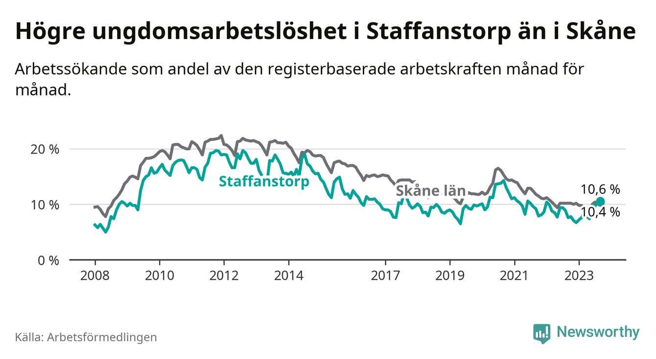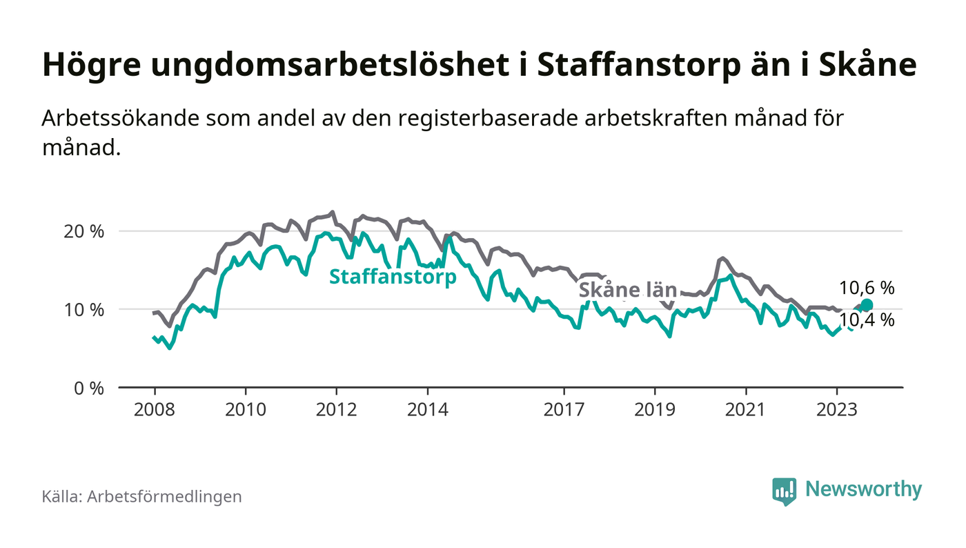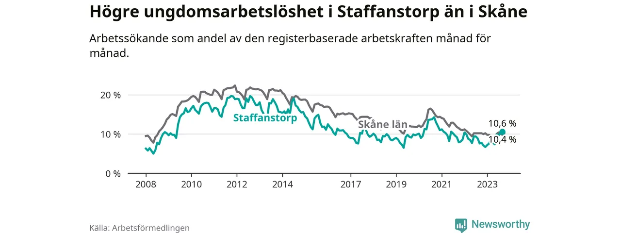 Medan Staffanstorp har lägre total arbetslöshet än Skåne, ligger ungdomsarbetslösheten 0,2 procentenheter högre i Staffanstorp.