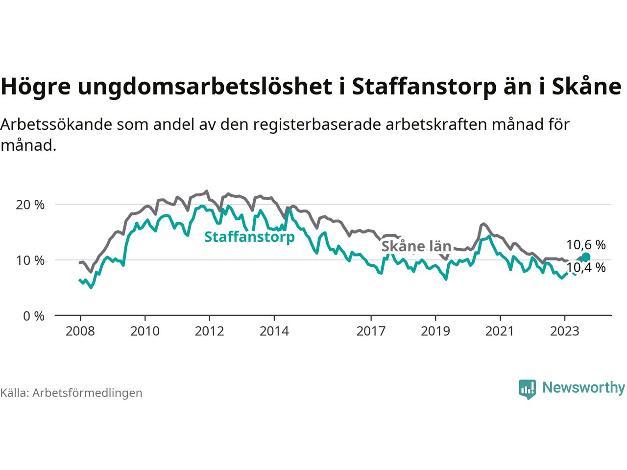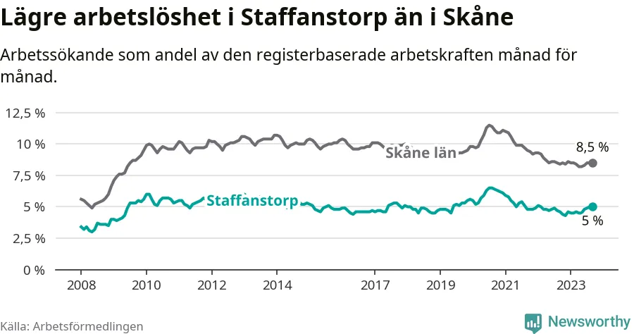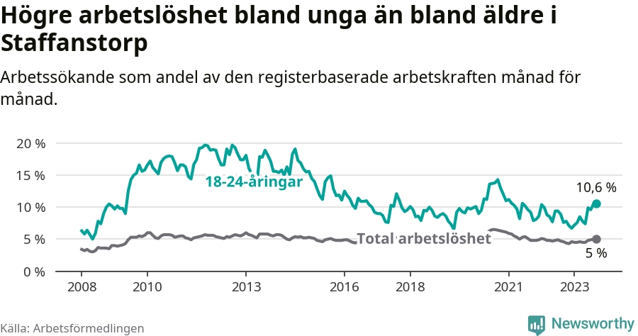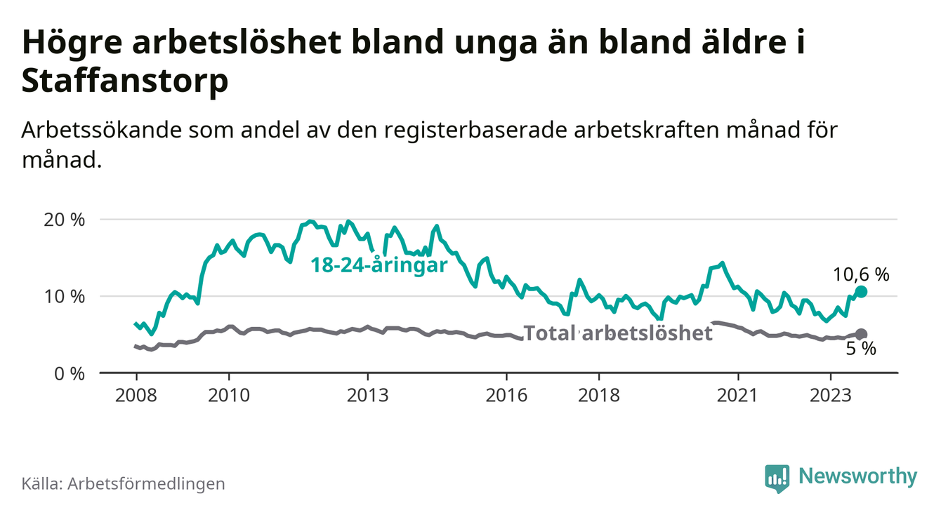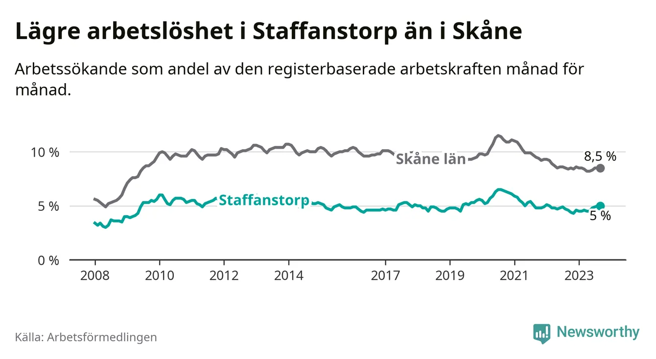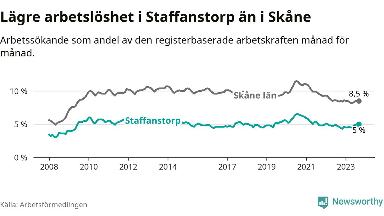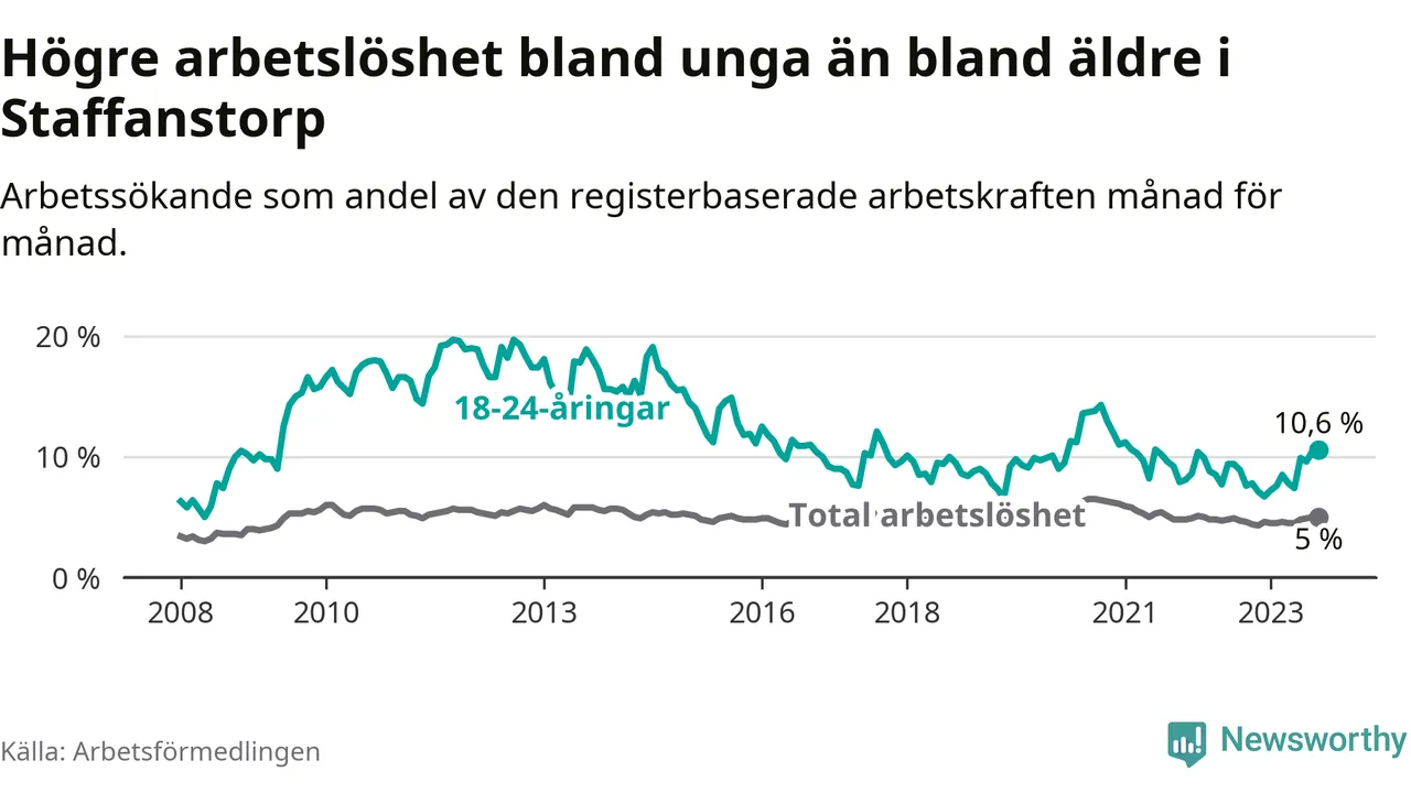 Medan Staffanstorp har lägre total arbetslöshet än Skåne, ligger ungdomsarbetslösheten 0,2 procentenheter högre i Staffanstorp.