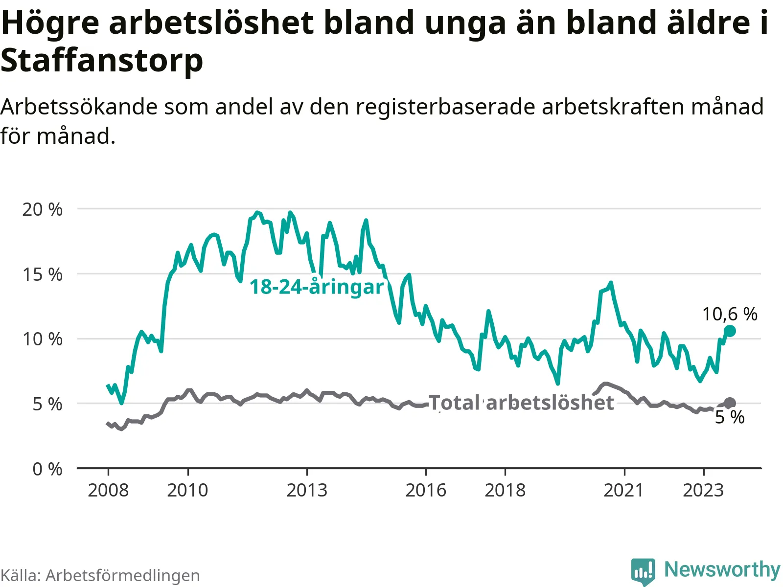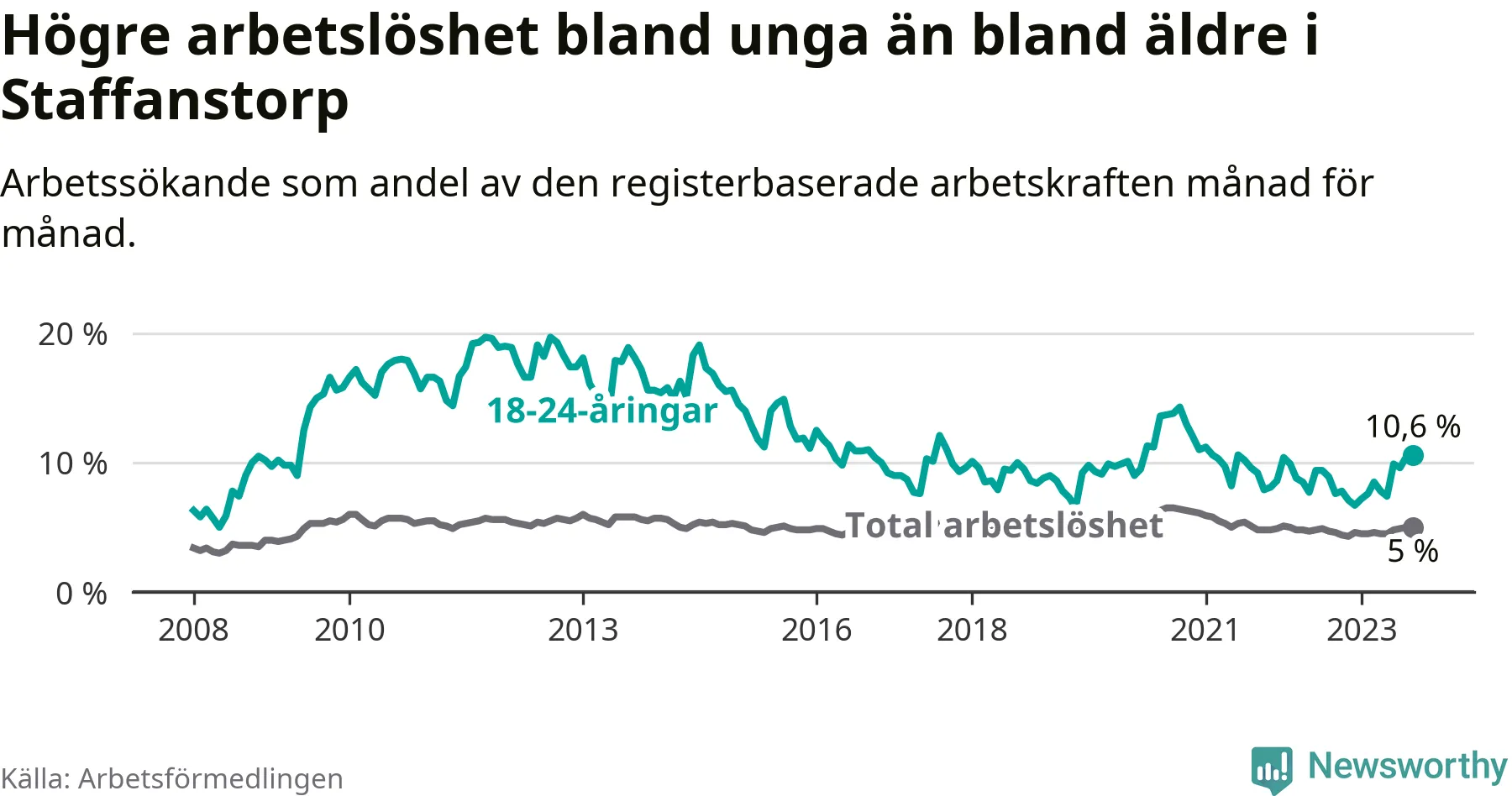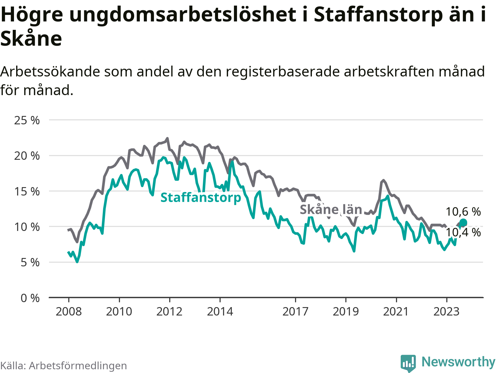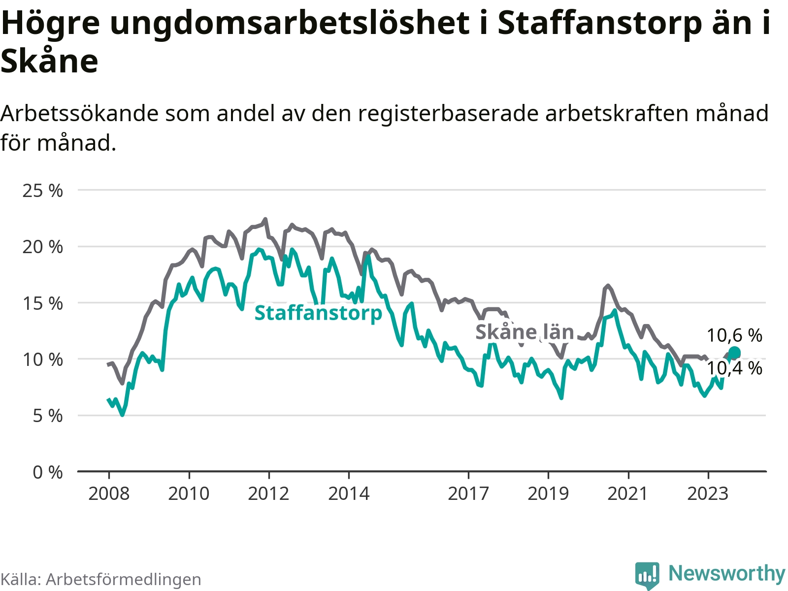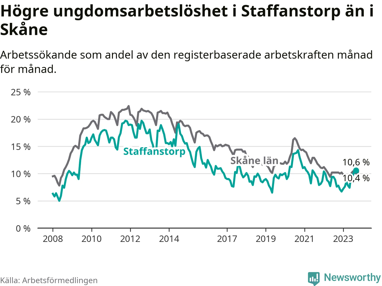 Medan Staffanstorp har lägre total arbetslöshet än Skåne, ligger ungdomsarbetslösheten 0,2 procentenheter högre i Staffanstorp.