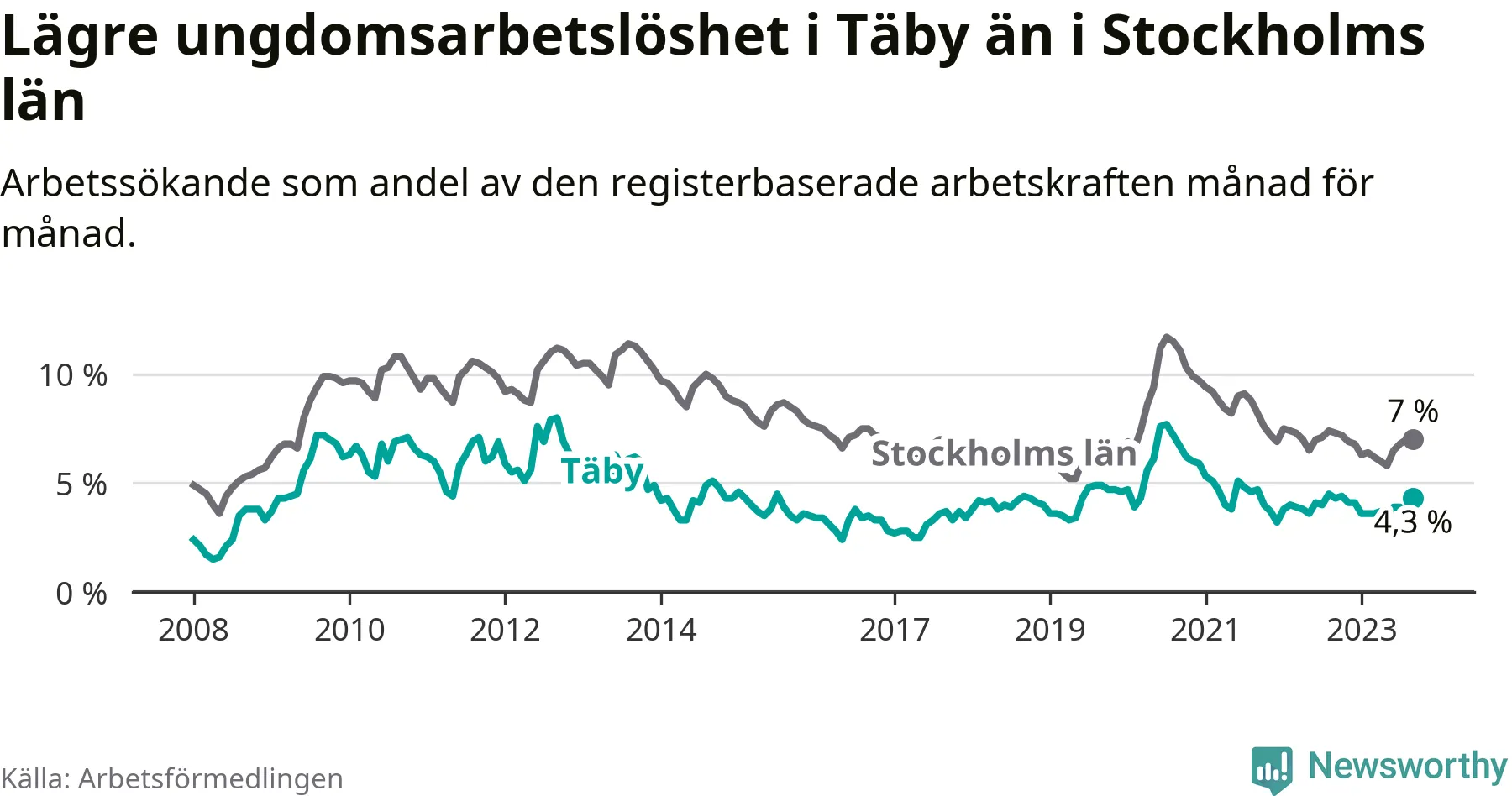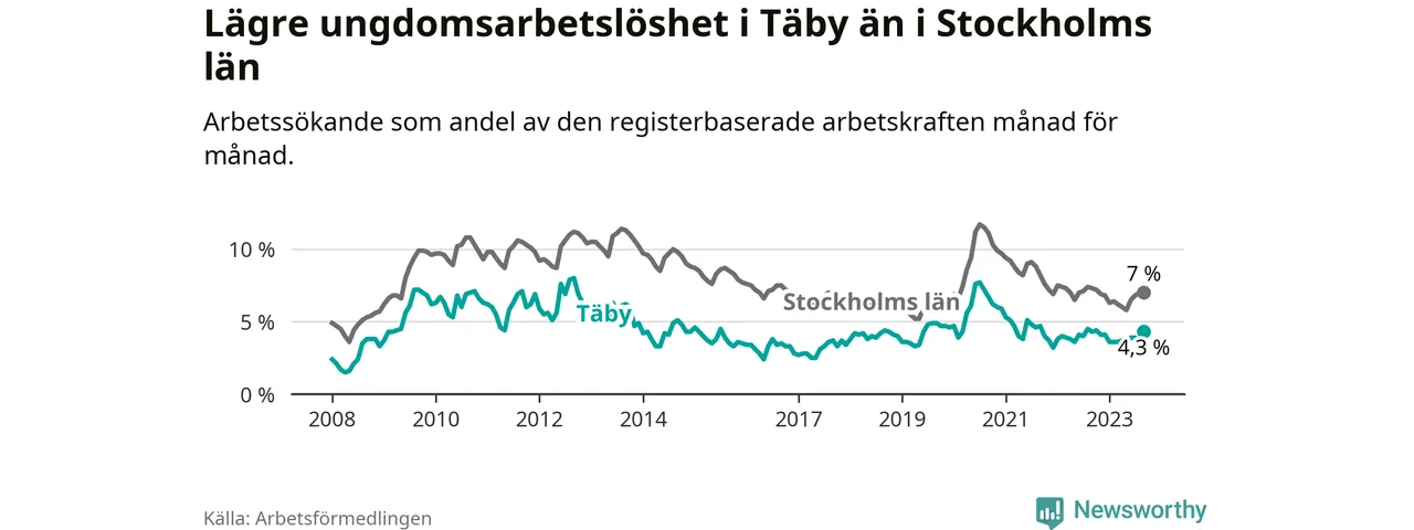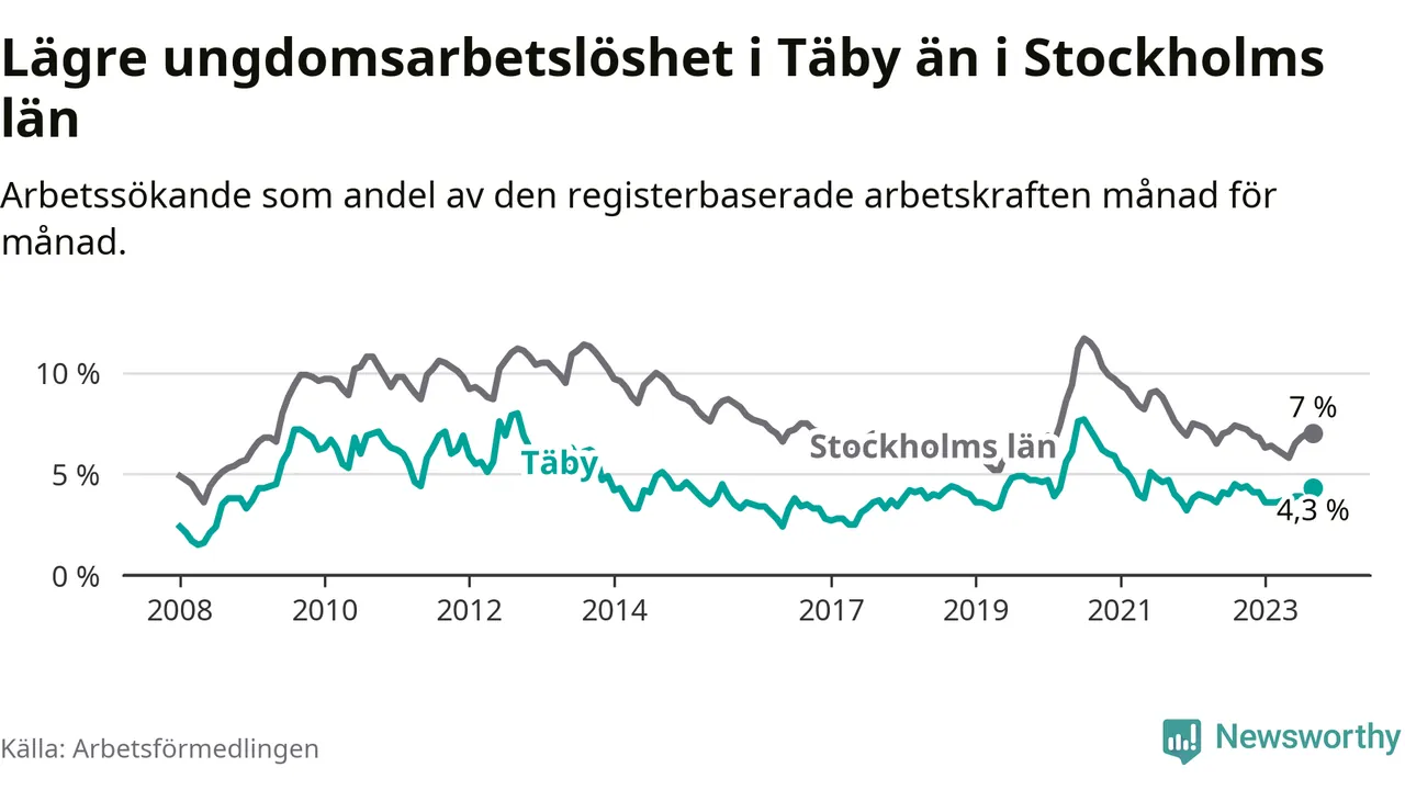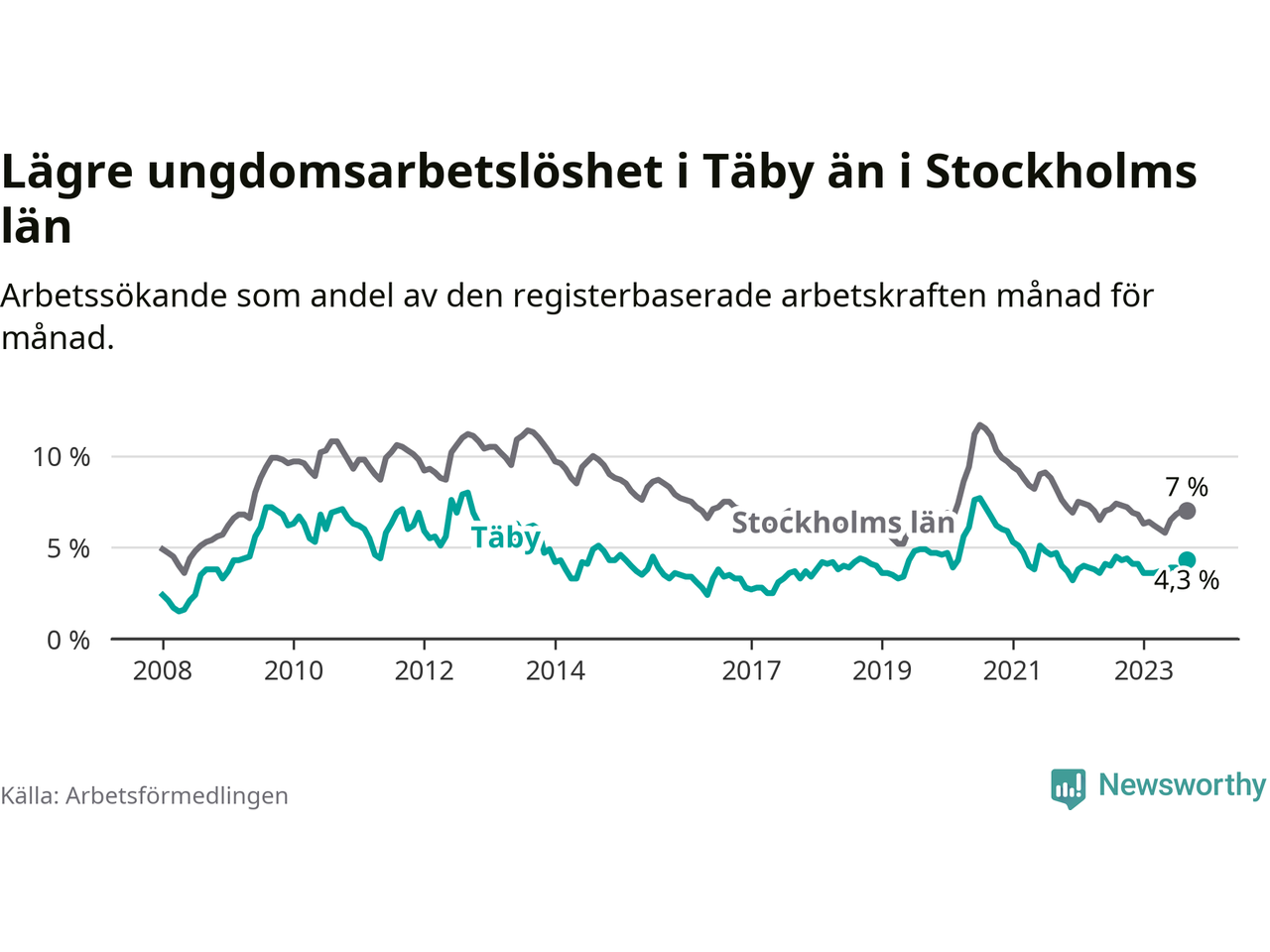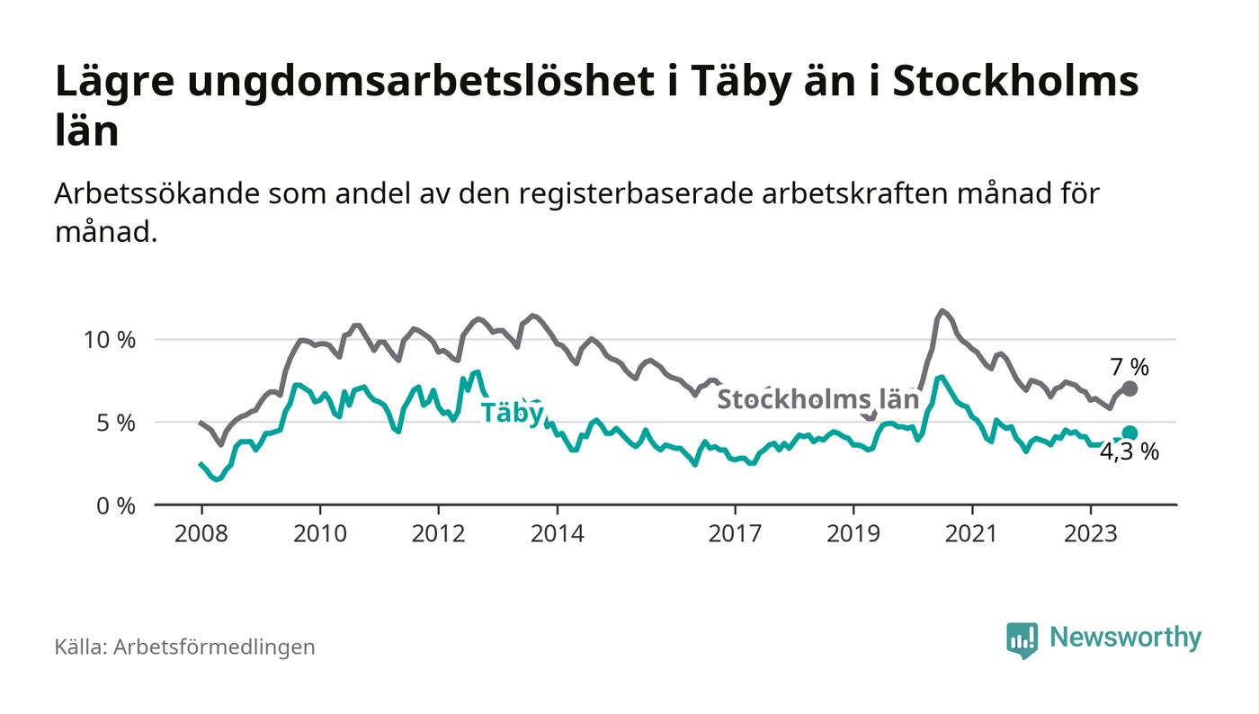 Graf: Arbetslöshet bland unga i Täby kommun och Stockholms län
