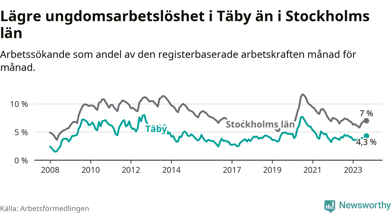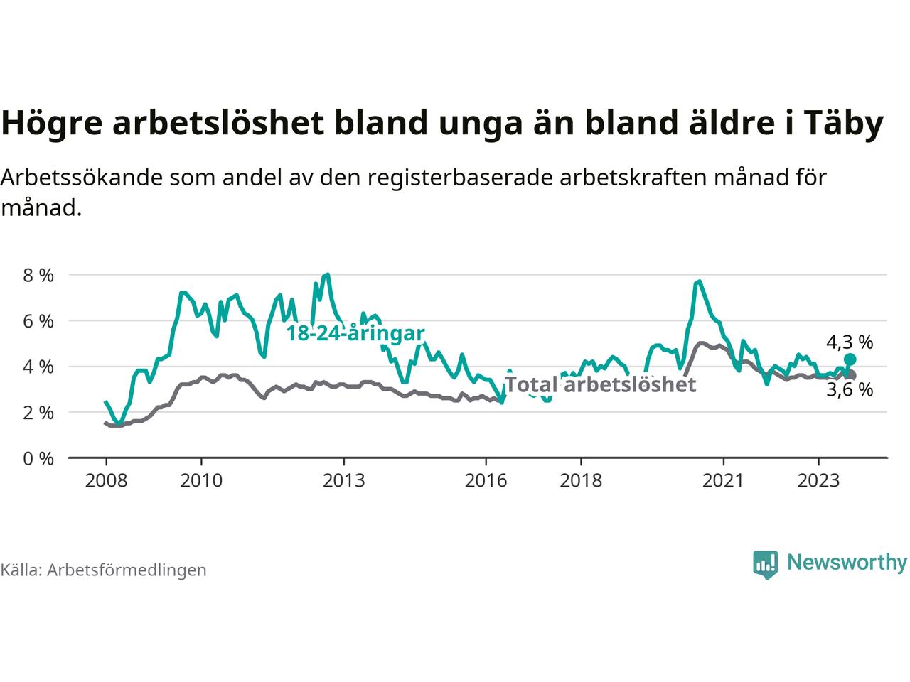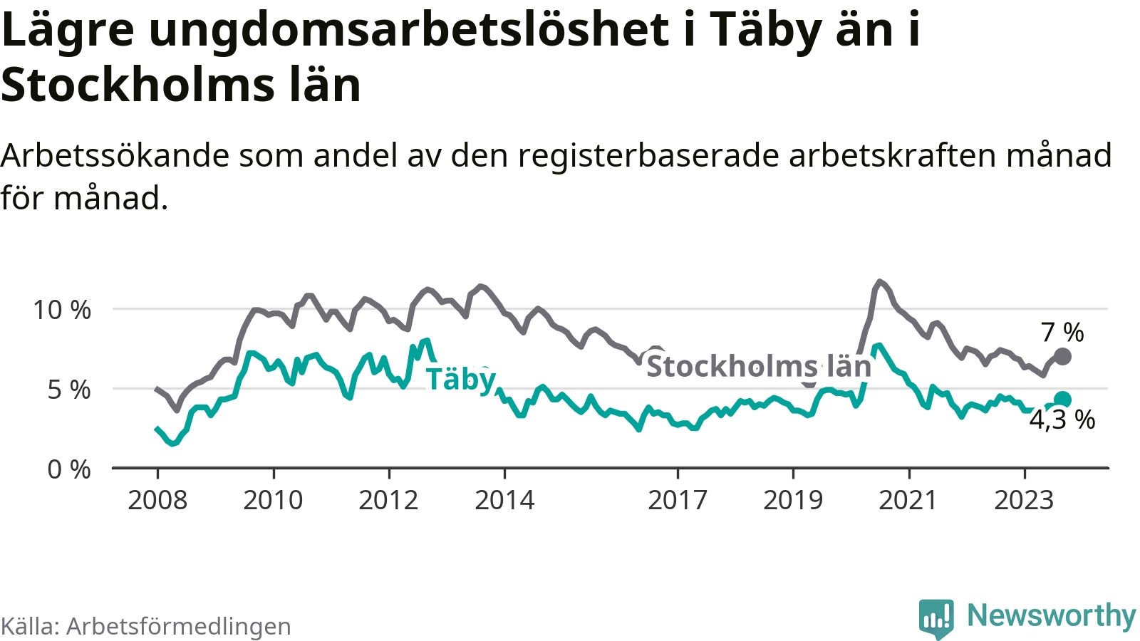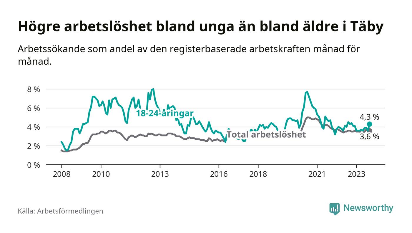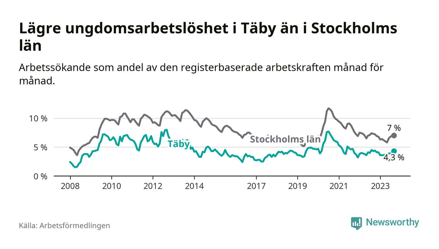 Graf: Arbetslöshet bland unga i Täby kommun och Stockholms län