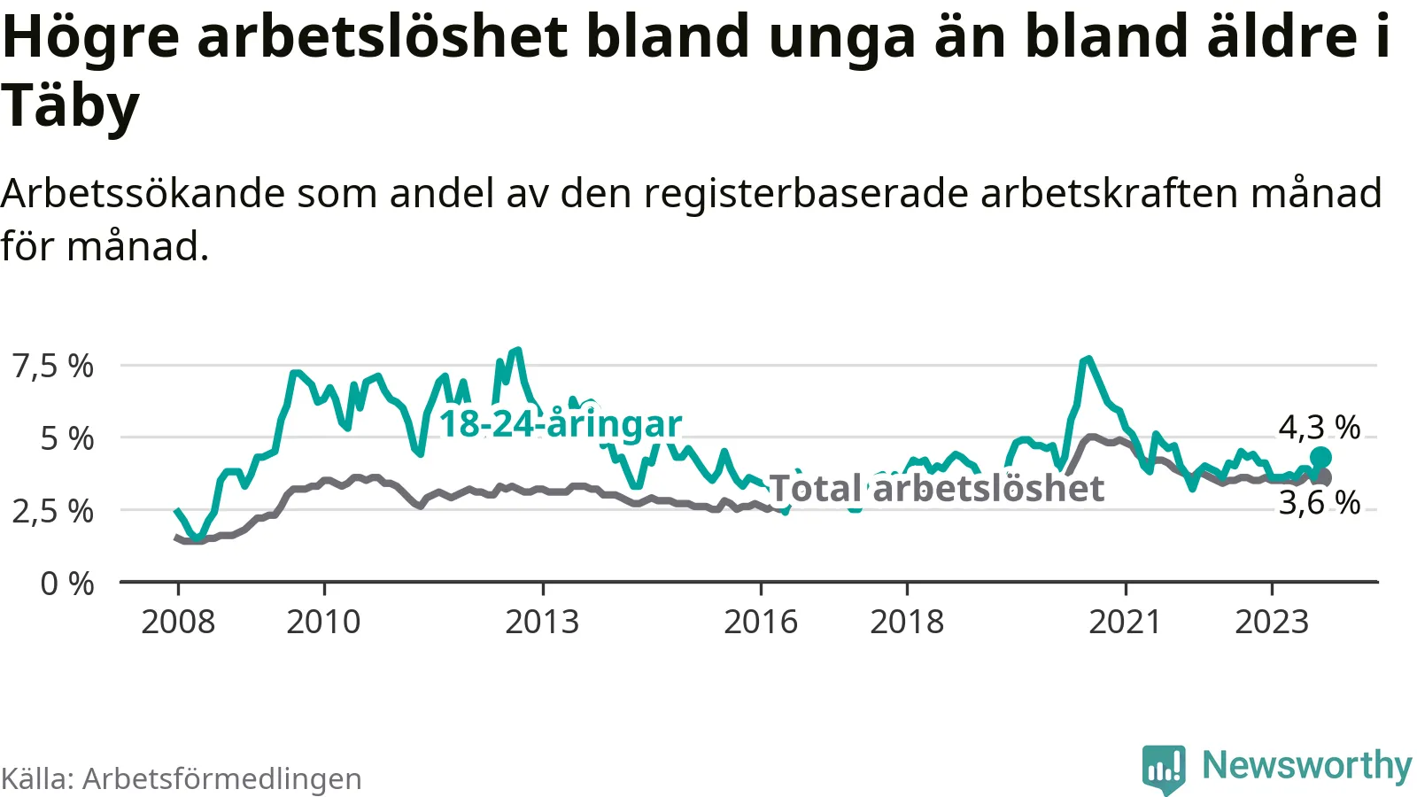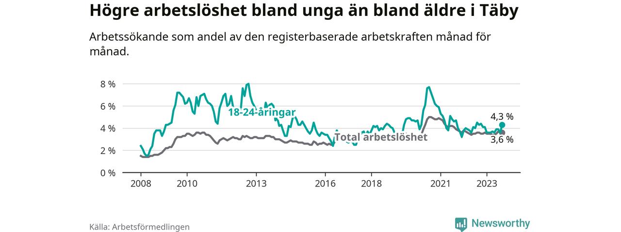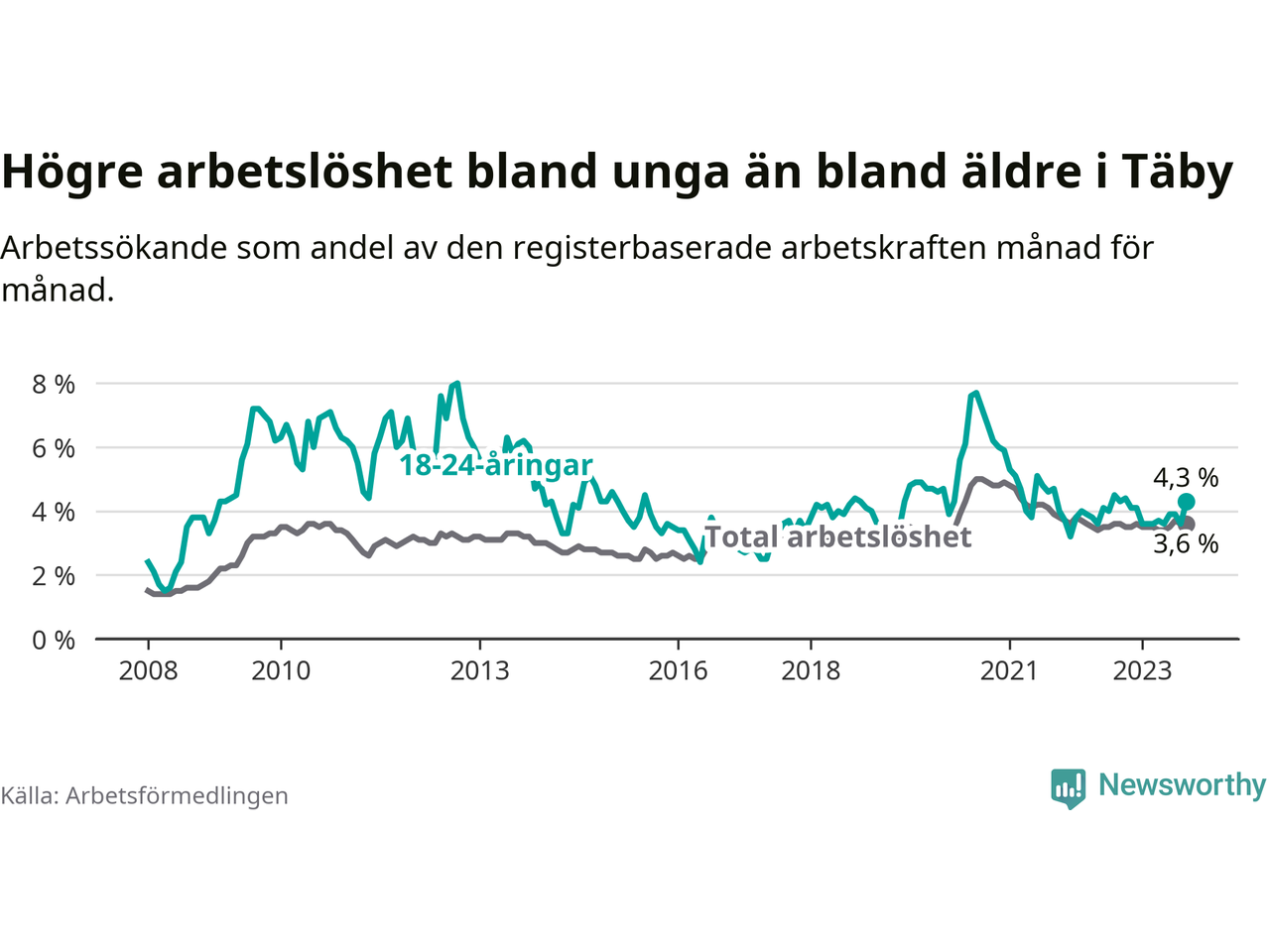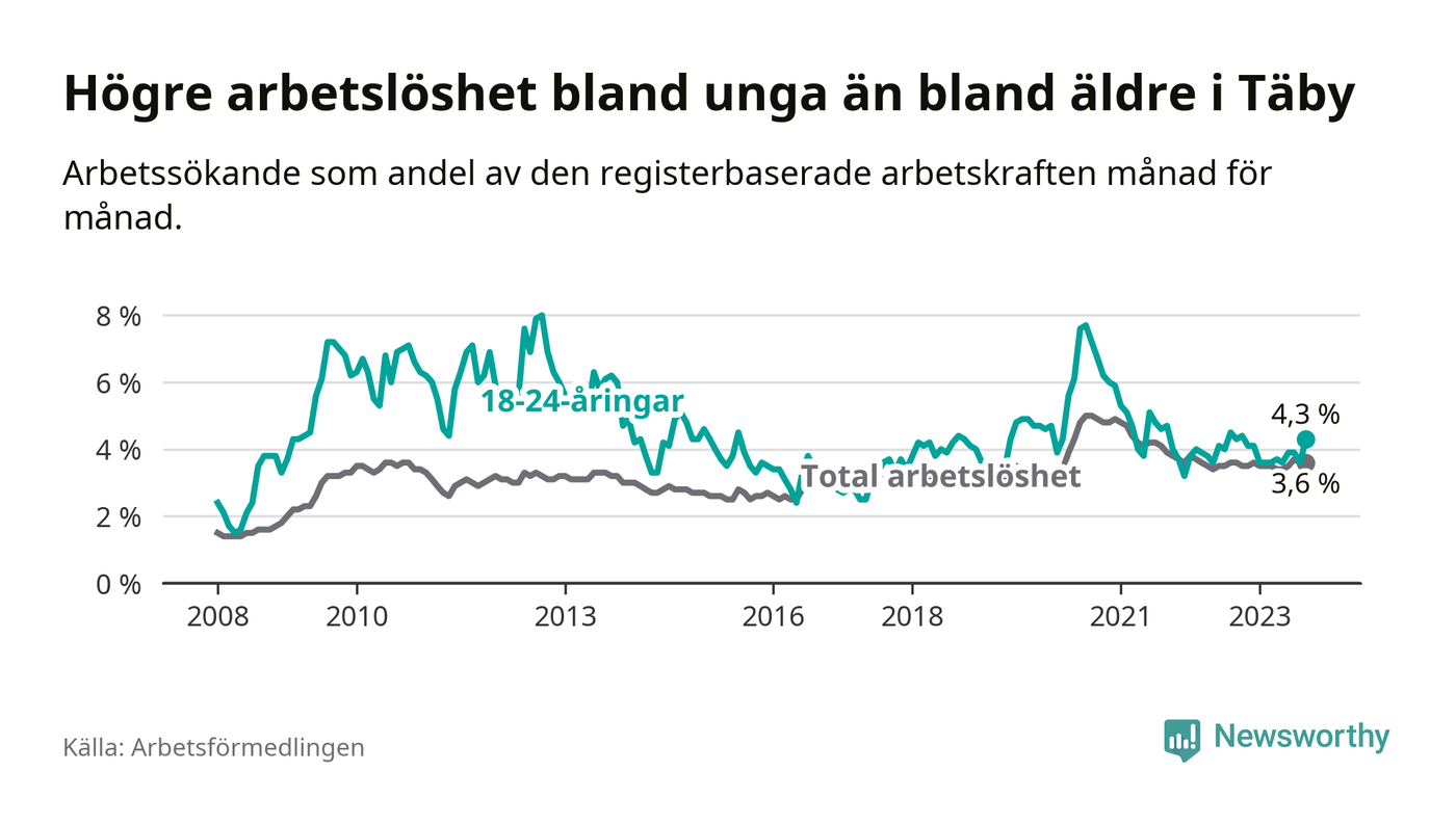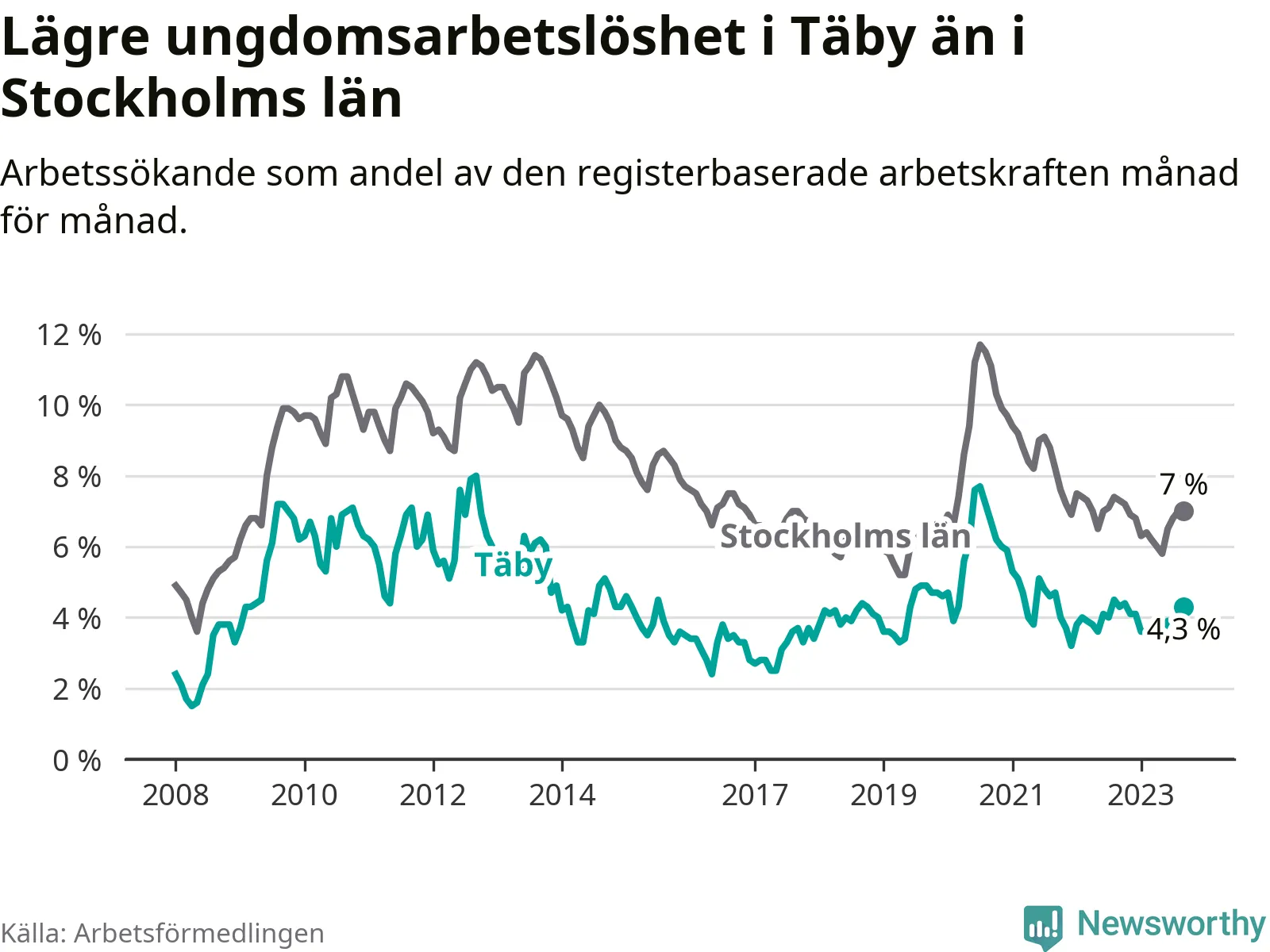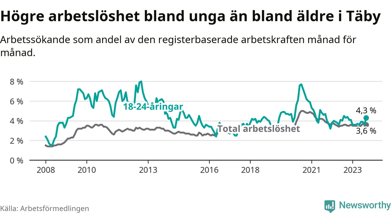 Graf: Arbetslöshet bland unga i Täby kommun och Stockholms län