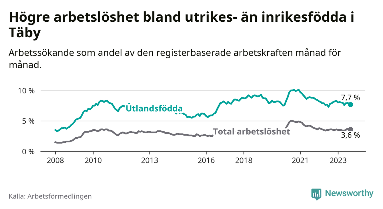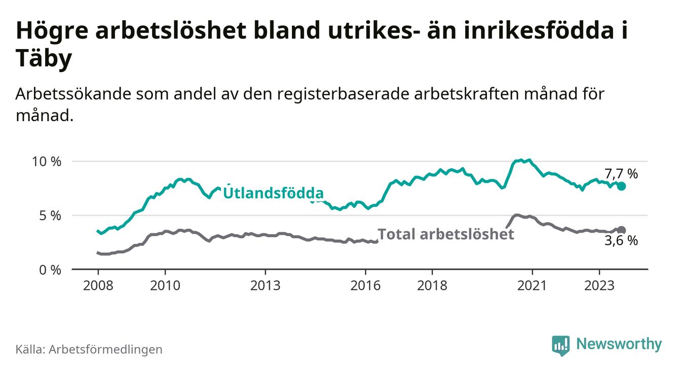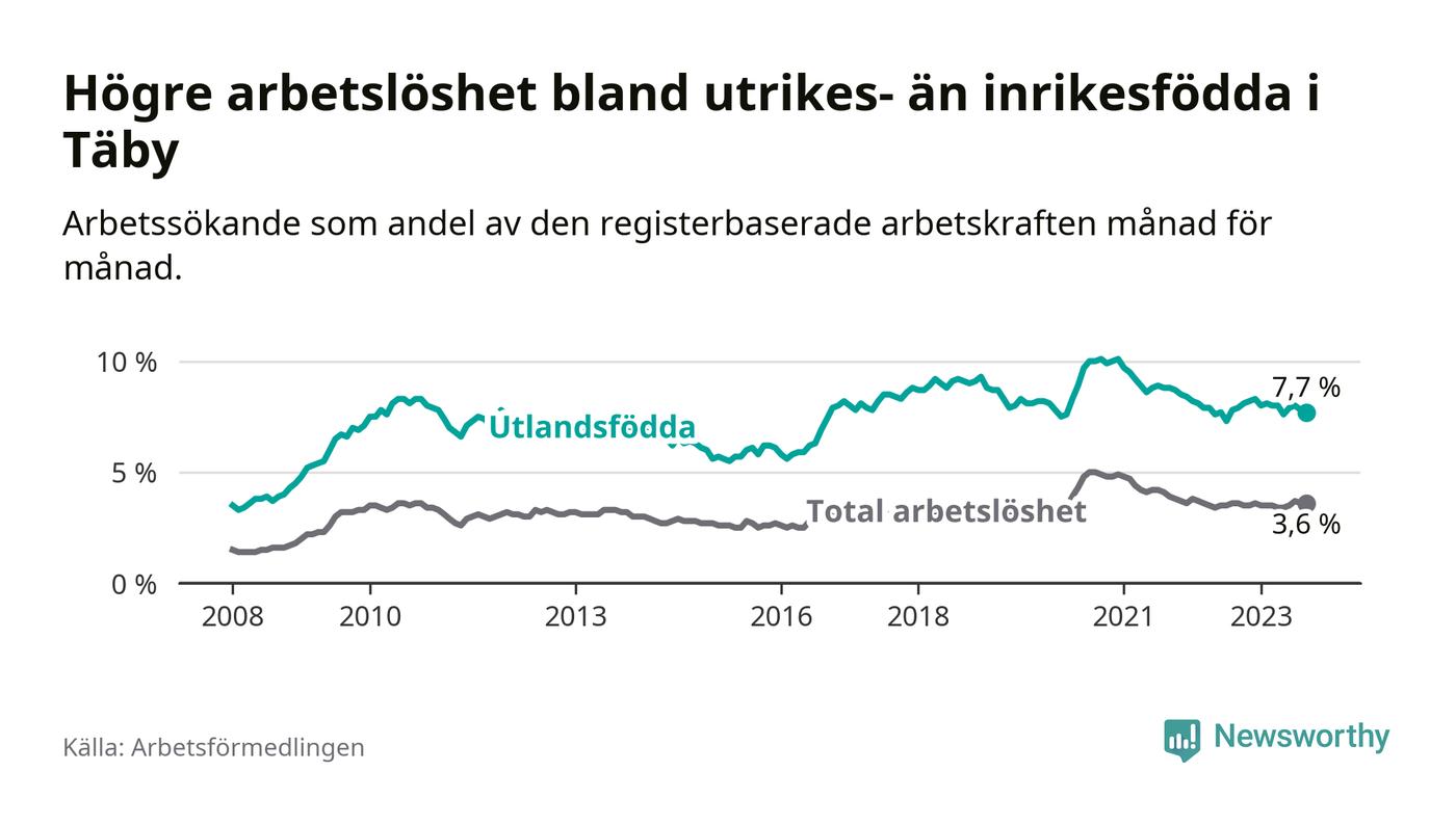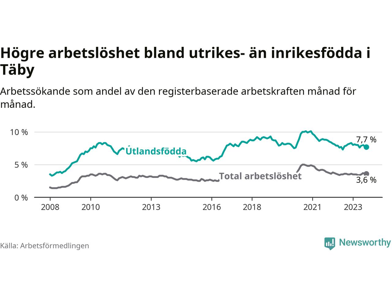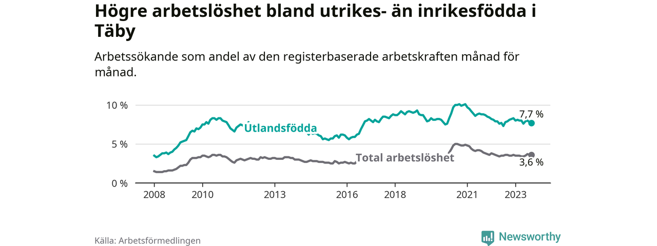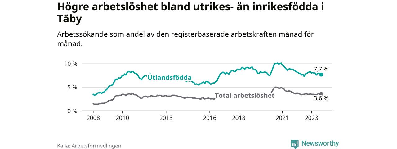 Arbetslösheten bland utlandsfödda var 7,7 procent i Täby under september månad, motsvarande 643 av 8 351 personer. Det är 0,2 procentenheter färre än vid samma tidpunkt i fjol (+26 om man räknar personer). Den senaste månadens nedgång innebär ett trendbrott. Under de ett föregående månaderna hade arbetslösheten bland utlandsfödda varit högre än motsvarande tidpunkt året innan.