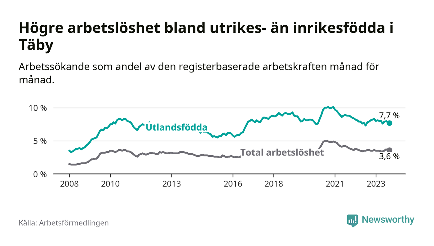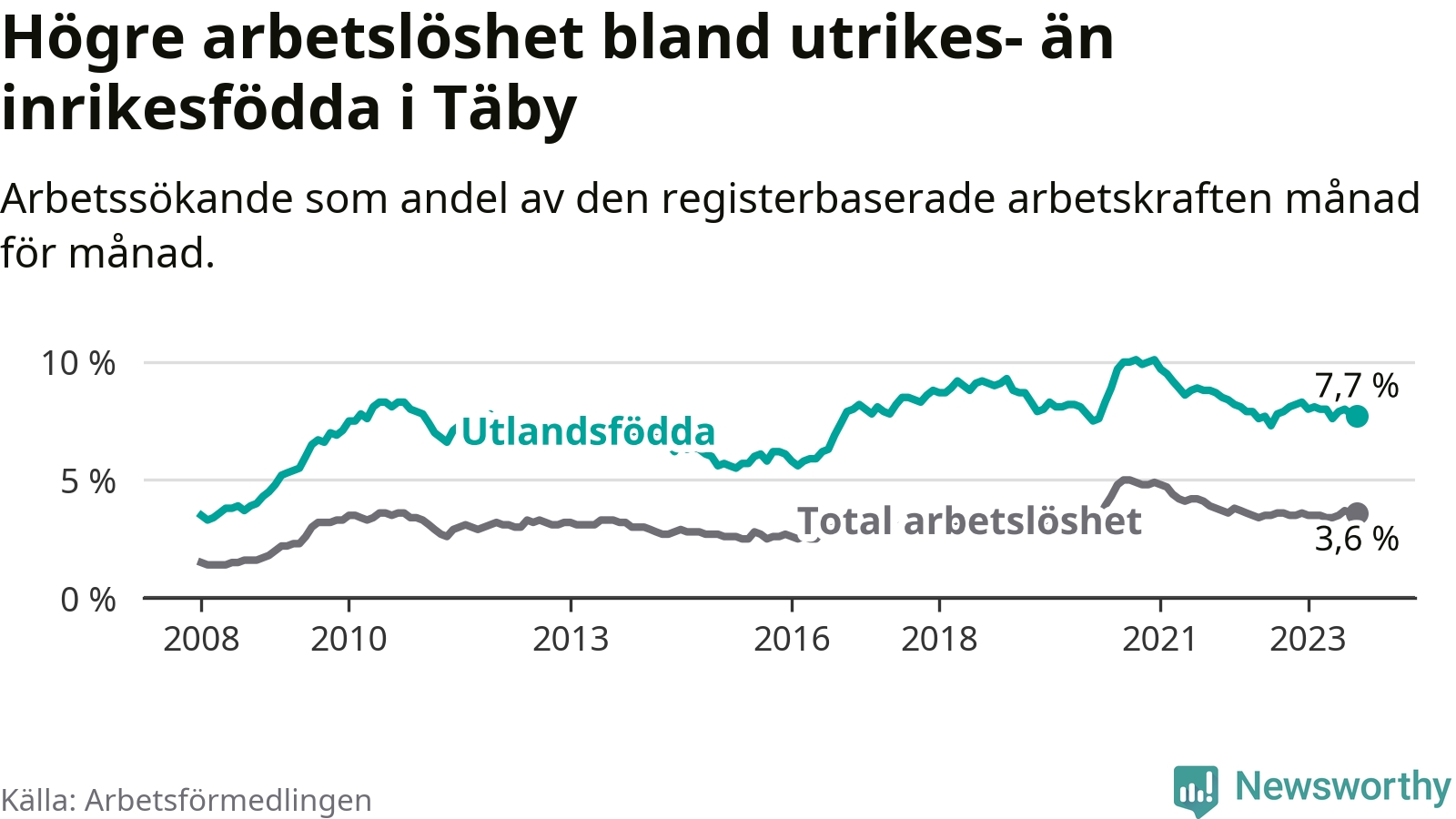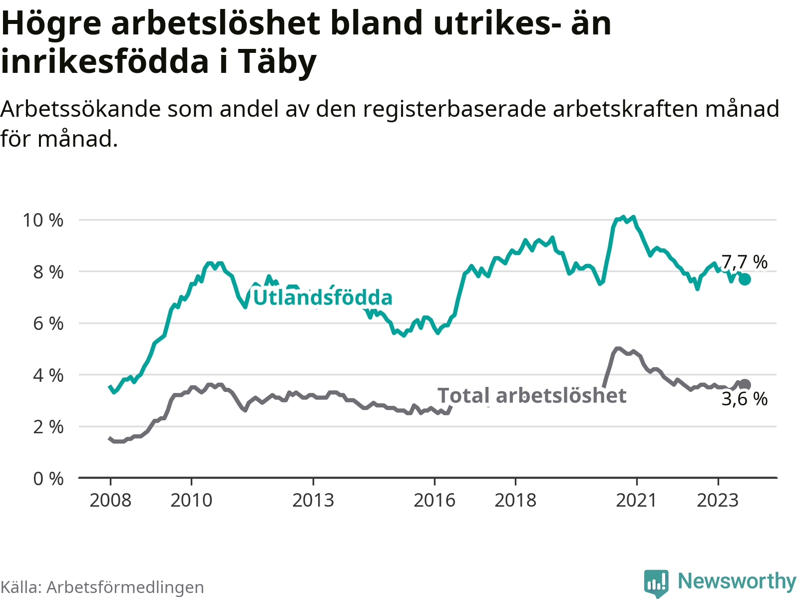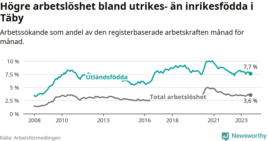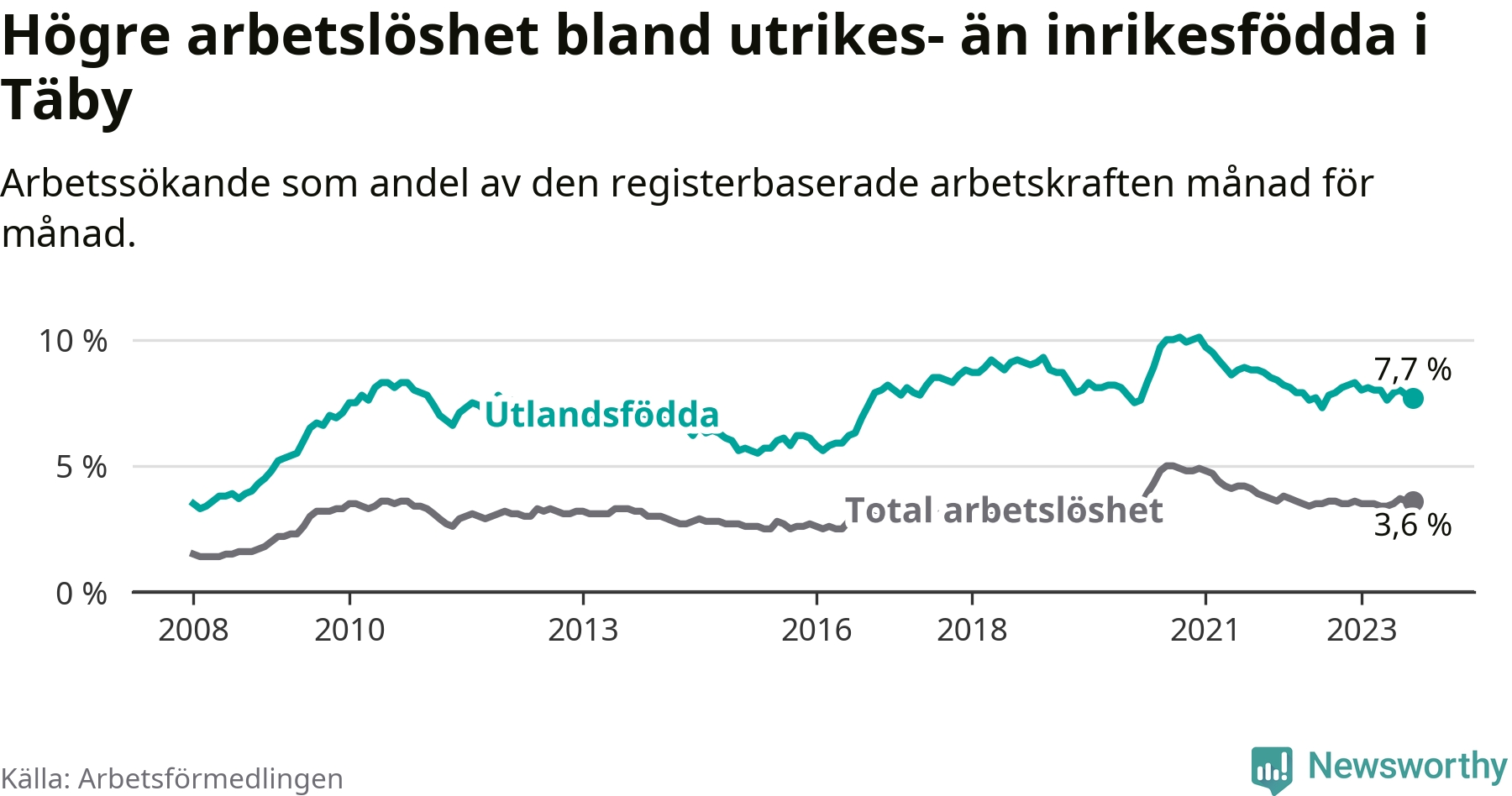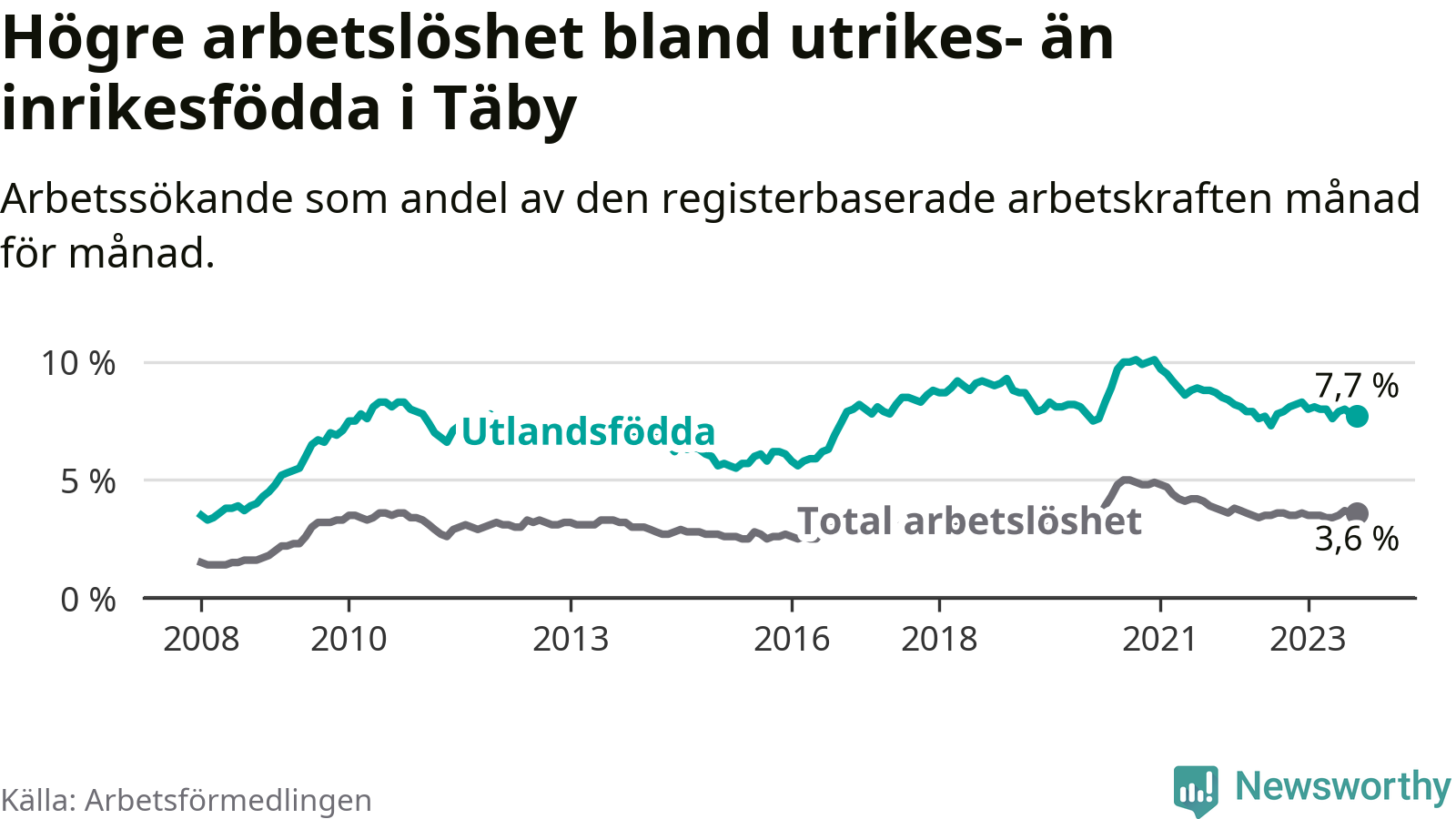 Arbetslösheten bland utlandsfödda var 7,7 procent i Täby under september månad, motsvarande 643 av 8 351 personer. Det är 0,2 procentenheter färre än vid samma tidpunkt i fjol (+26 om man räknar personer). Den senaste månadens nedgång innebär ett trendbrott. Under de ett föregående månaderna hade arbetslösheten bland utlandsfödda varit högre än motsvarande tidpunkt året innan.