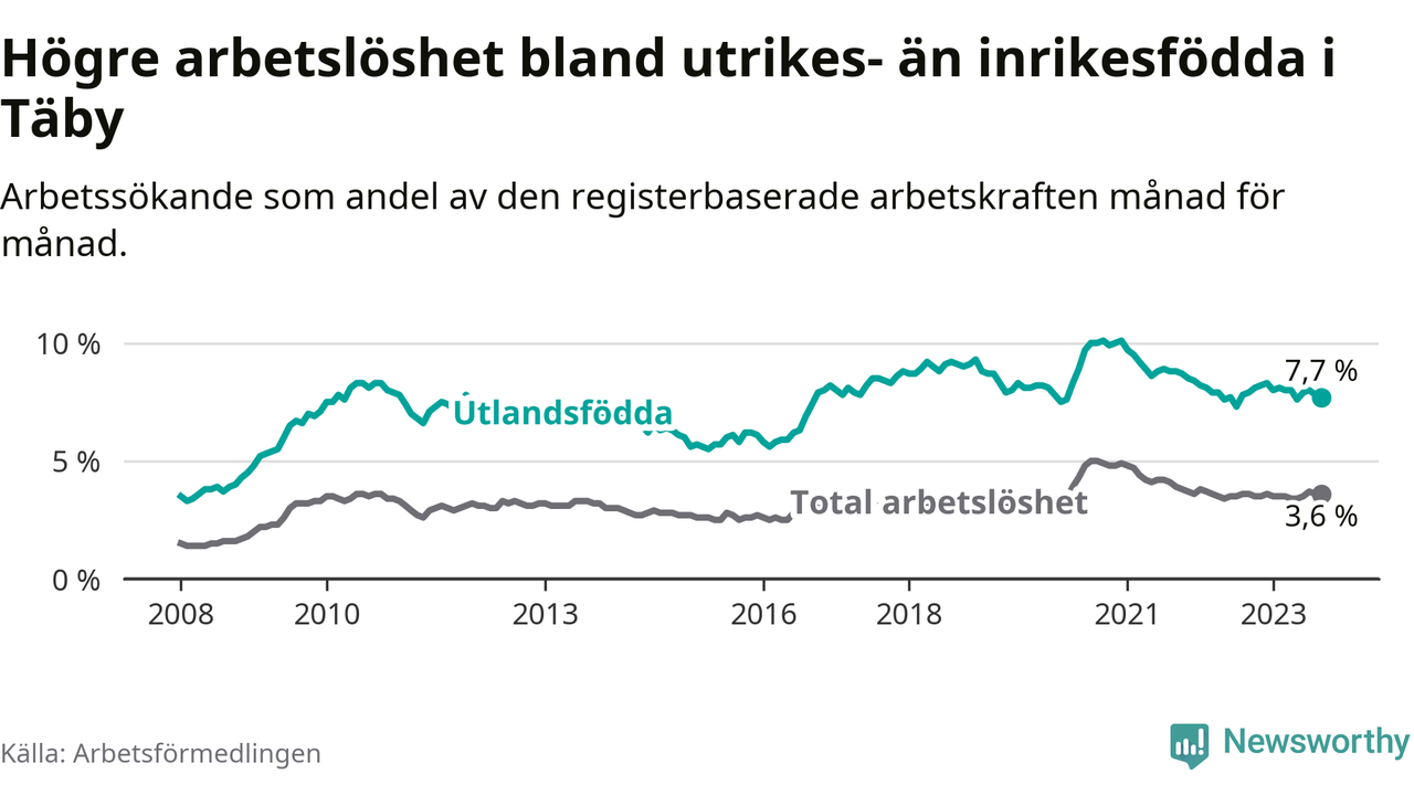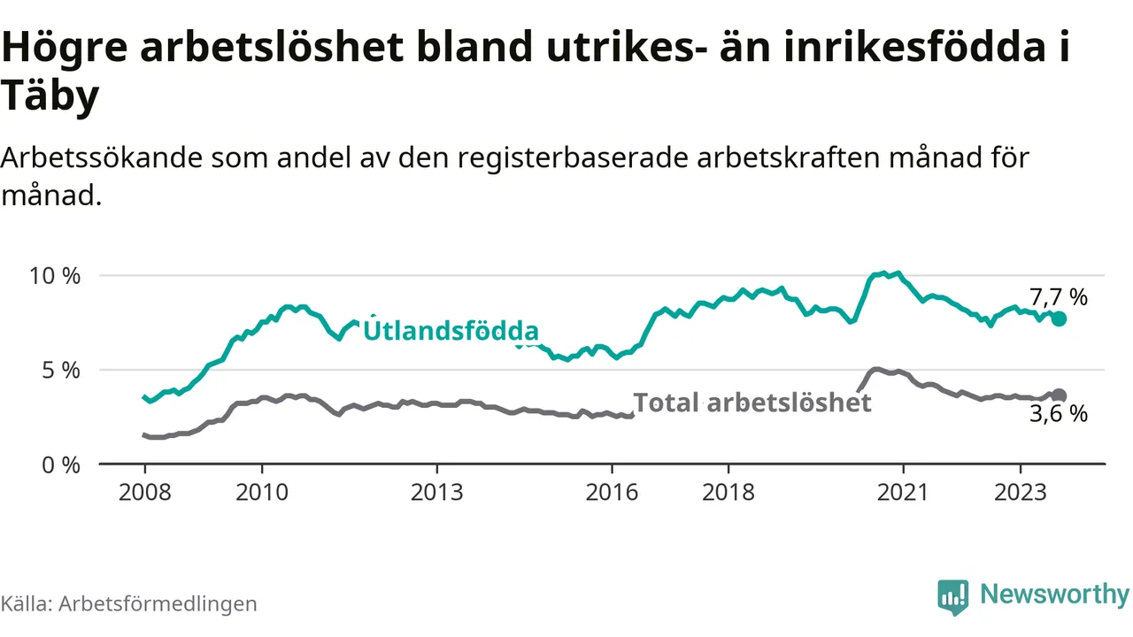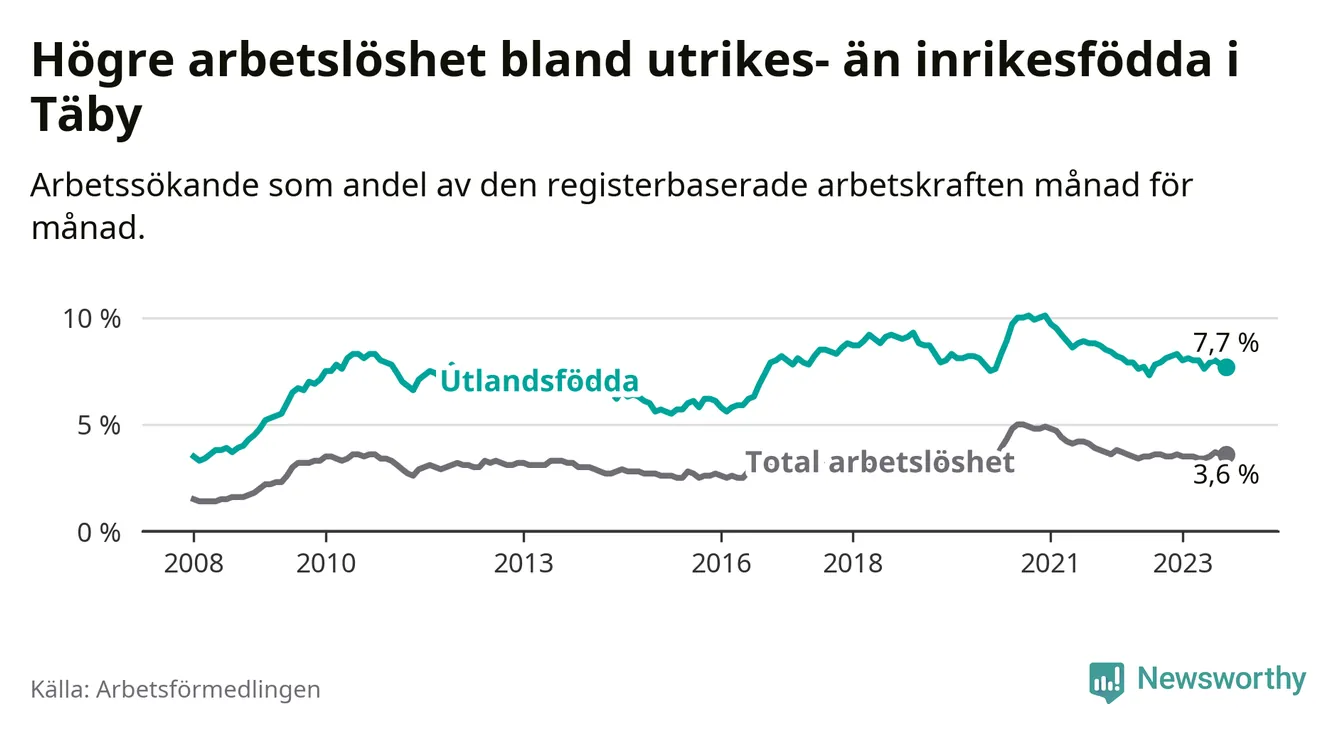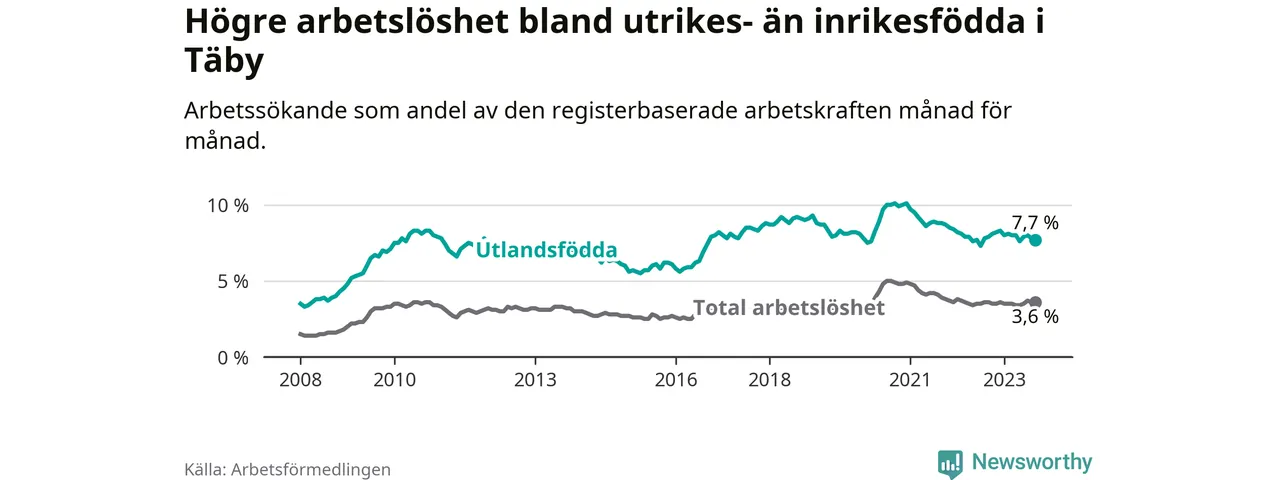 Graf: Skillnad i arbetslöshet mellan utrikesfödda och hela befolkningen i Täby kommun