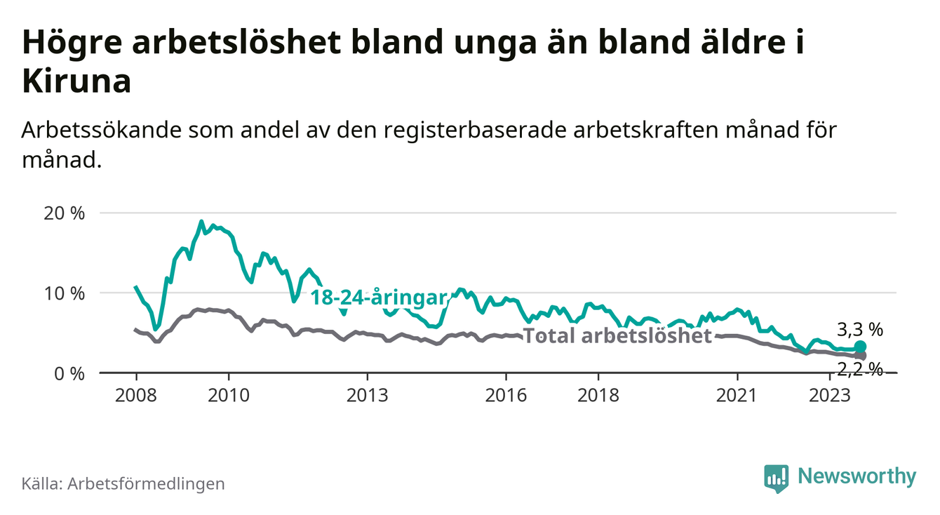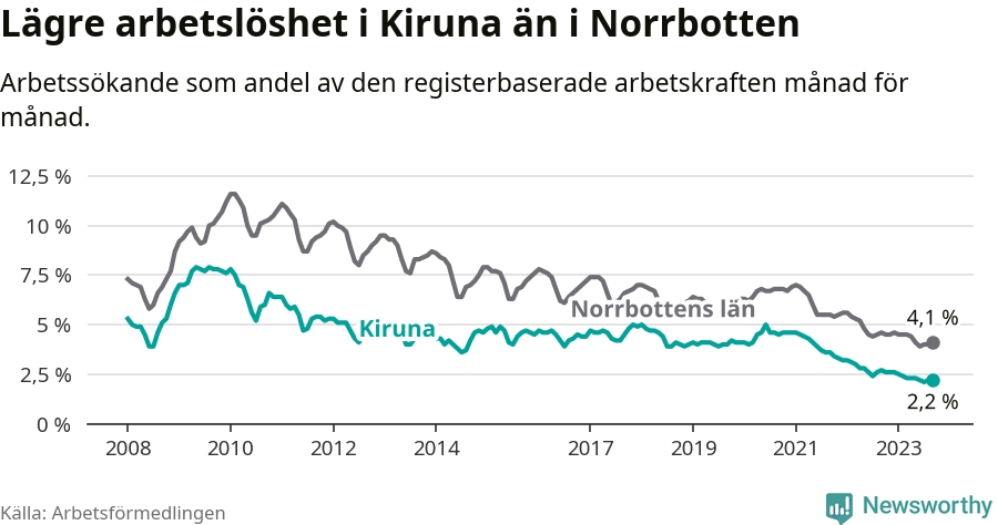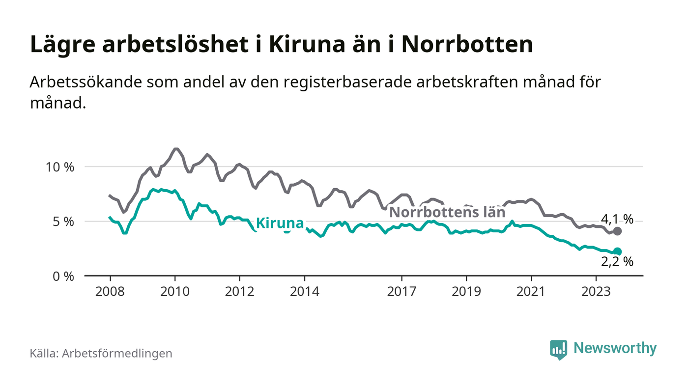 Det är 30:e månaden i följd som arbetslösheten i Kiruna är lägre än den var under samma tidpunkt året innan. Sedan mars 2021 har arbetslösheten gått ner från 4,4 till 2,2 procent.